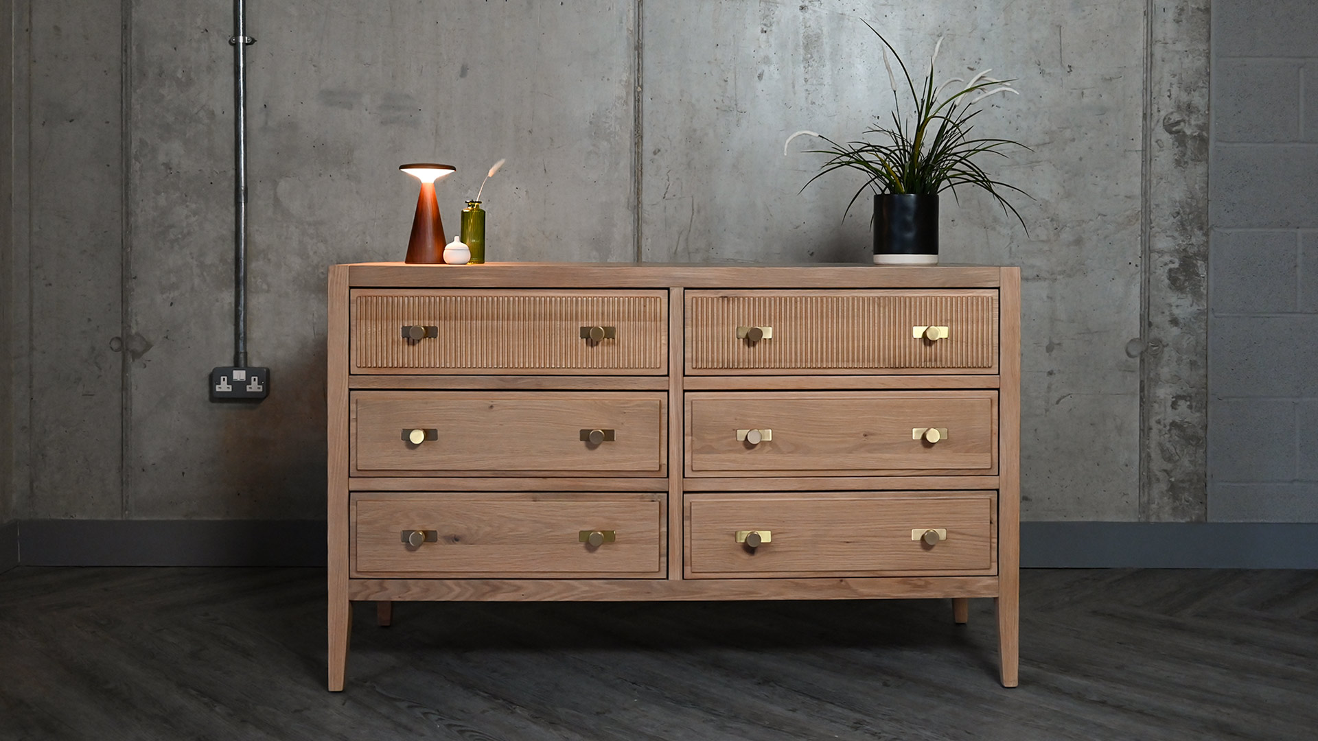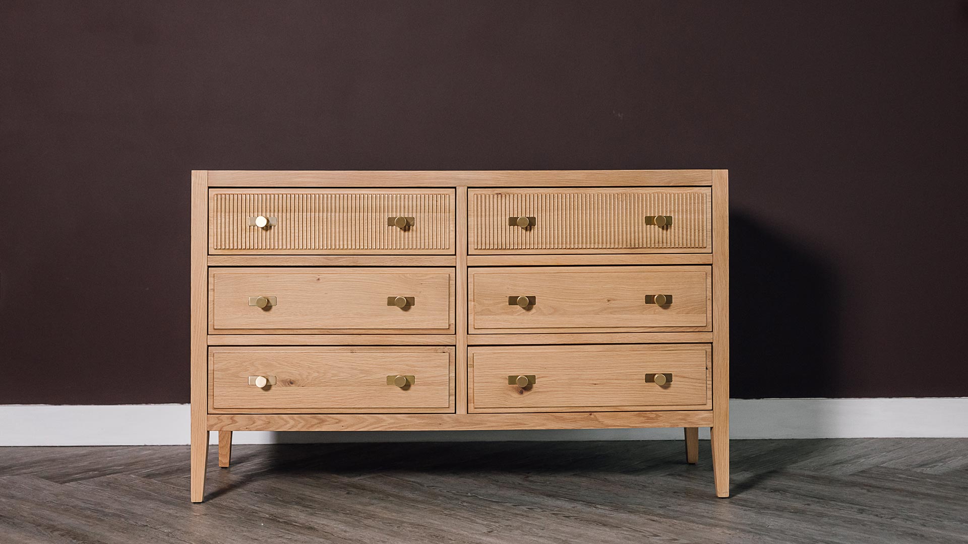 Classic and contemporary, this simple, elegant chest features six drawers with a reeded drawer front to the top two drawers. Made from solid oak and oak veneers, displaying the beauty of natural timber.