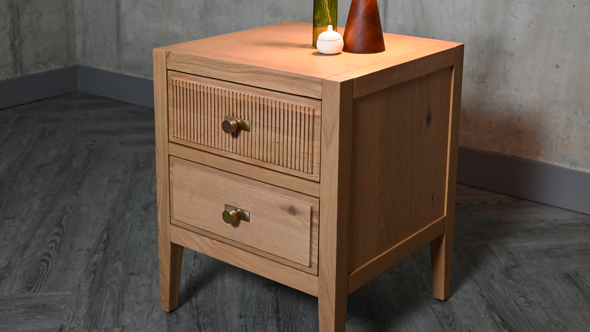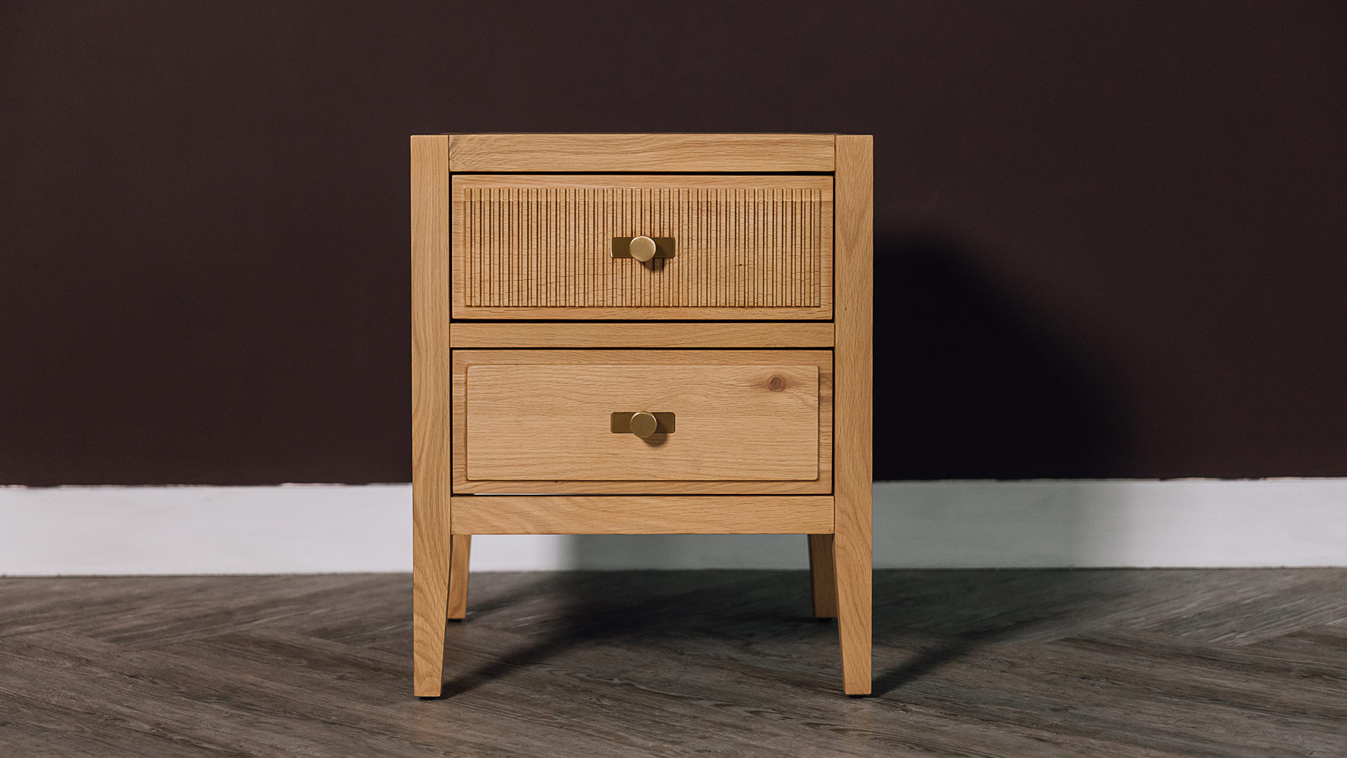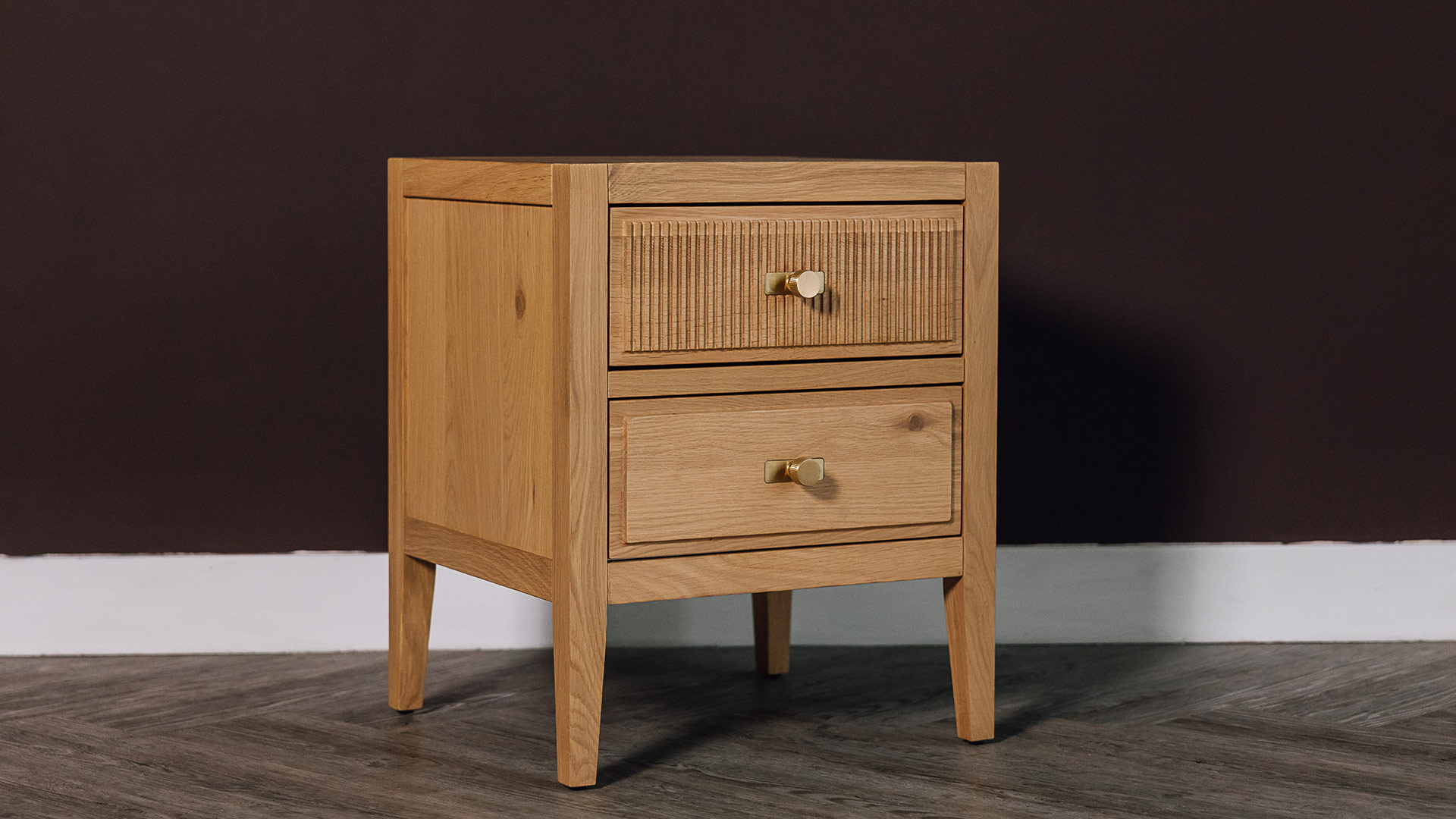 Classic and contemporary, this simple, elegant bedside table features two spacious drawers, one with a reeded front detail. Made from solid oak and oak veneers, displaying the beauty of natural timber.