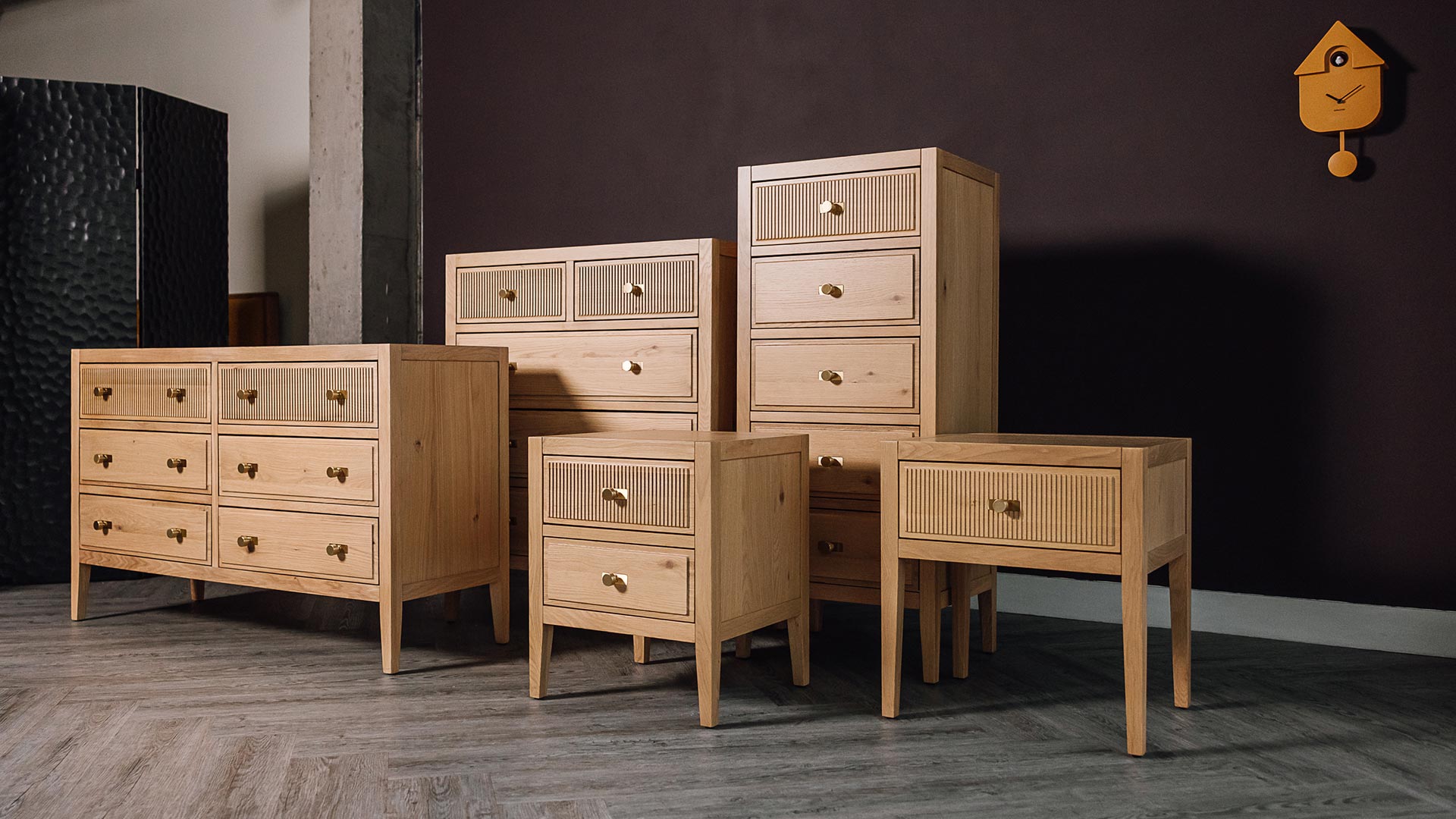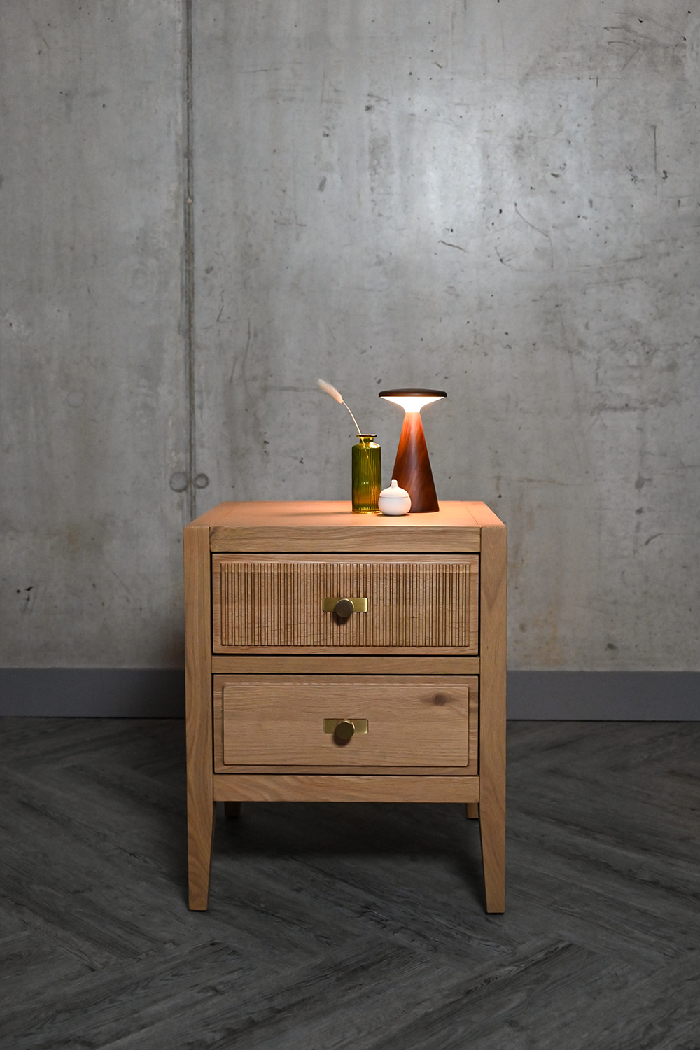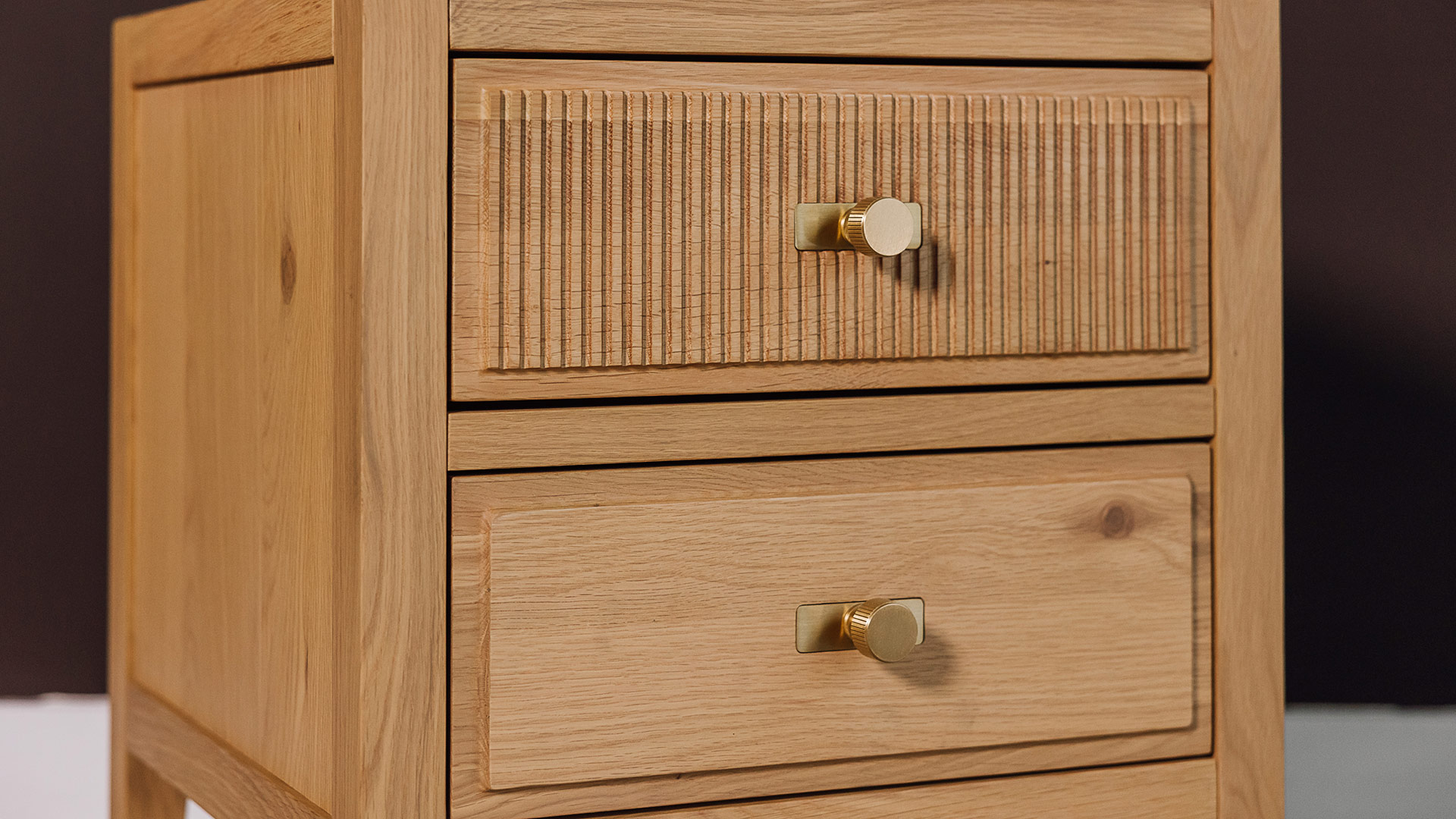 Gently inspired by the art deco design movement of the early 20th century, this collection is characterised by a unique, reeded drawer front. Finished with brass hardware. These pieces boast a classic, retro-inspired design that is grounded in modernity thanks to its solid materials.