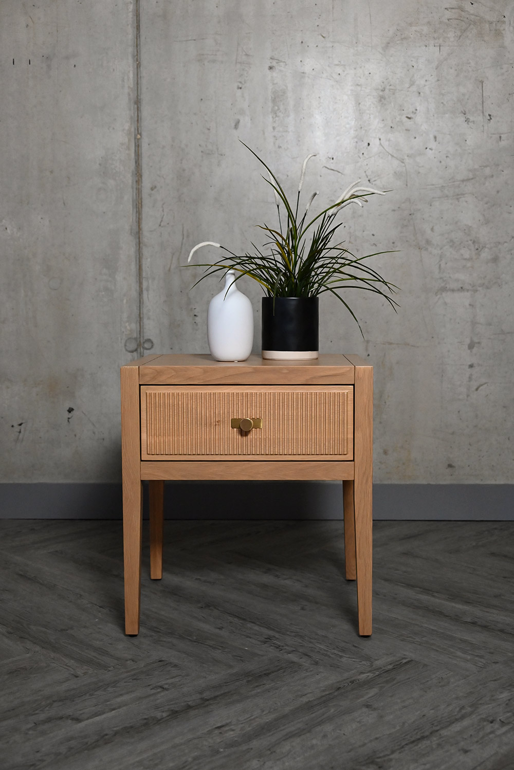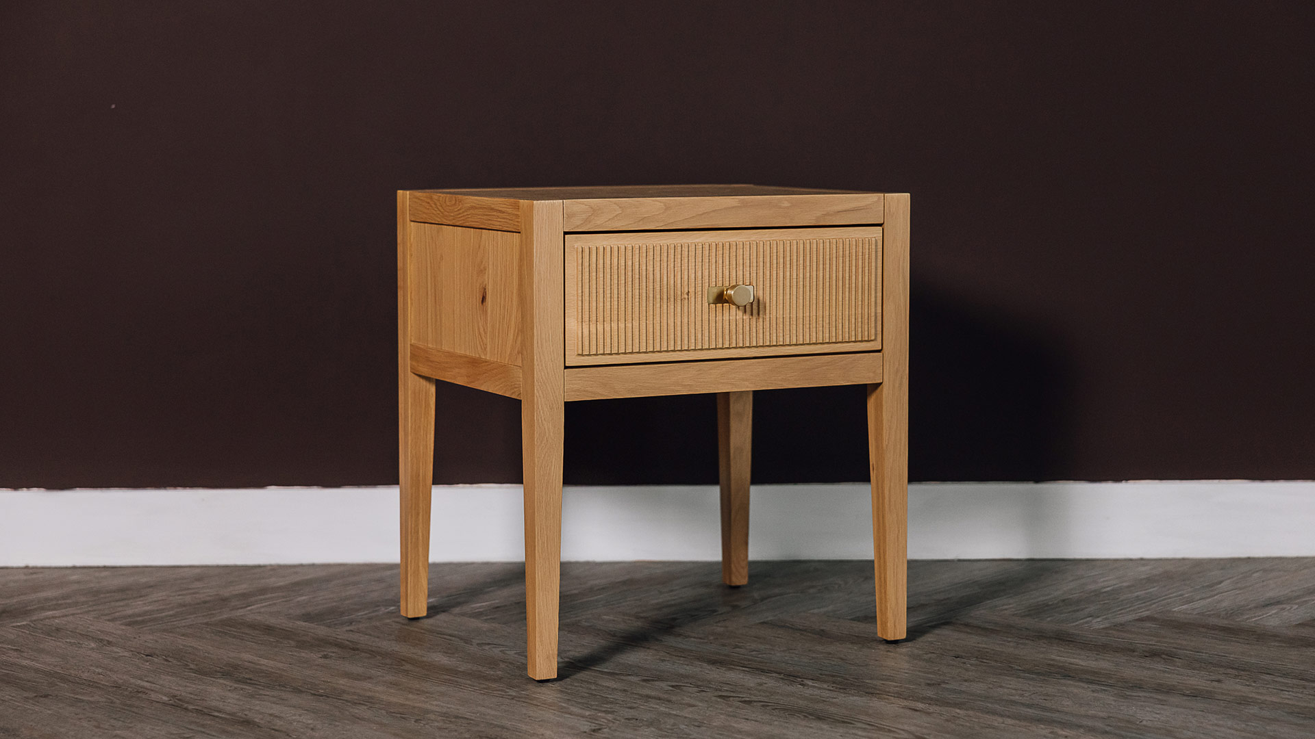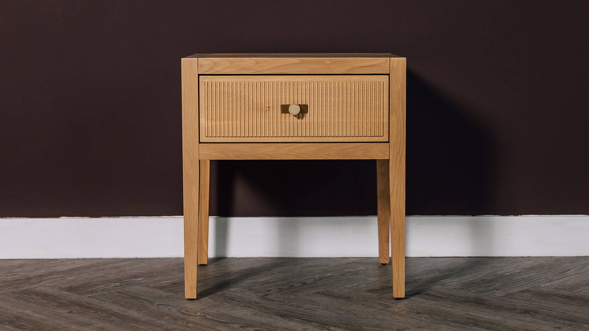 Classic and contemporary, this simple, elegant nightstand features a reeded drawer front design. Made from solid oak and oak veneers, displaying the beauty of natural timber.