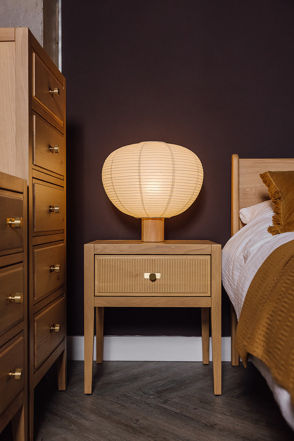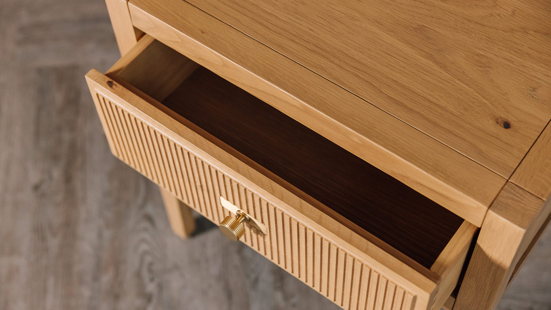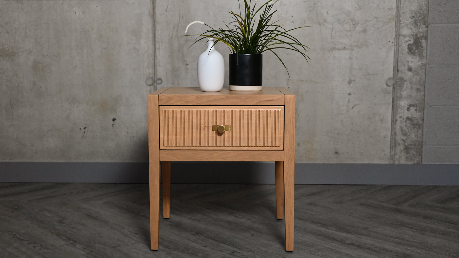 Classic and contemporary, this simple, elegant nightstand features a reeded drawer front design. Made from solid oak and oak veneers, displaying the beauty of natural timber.