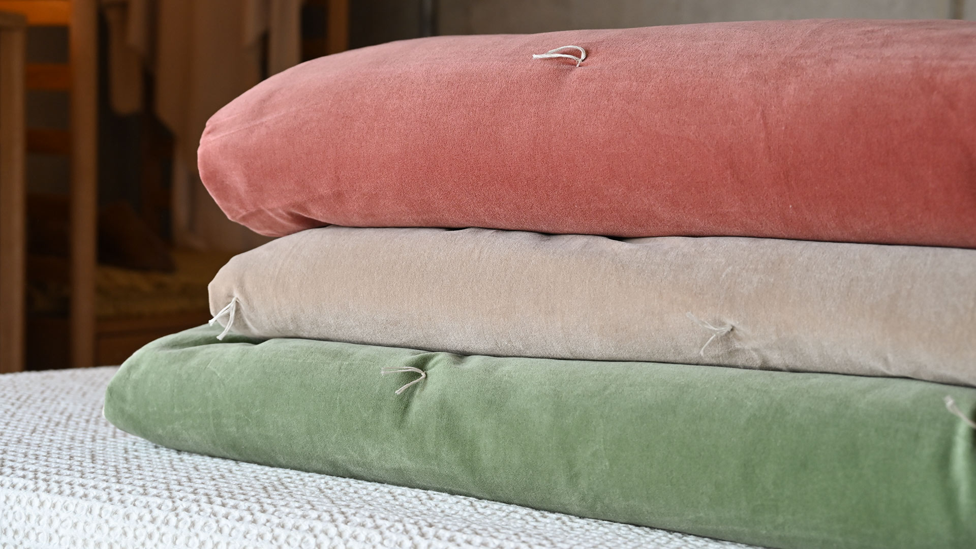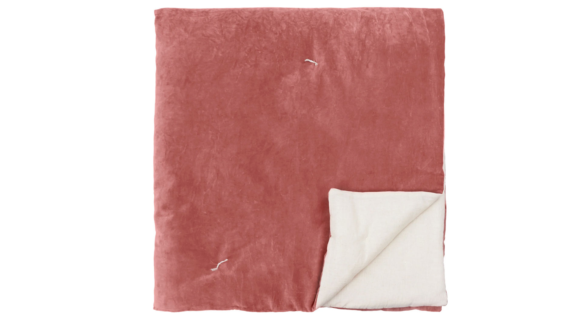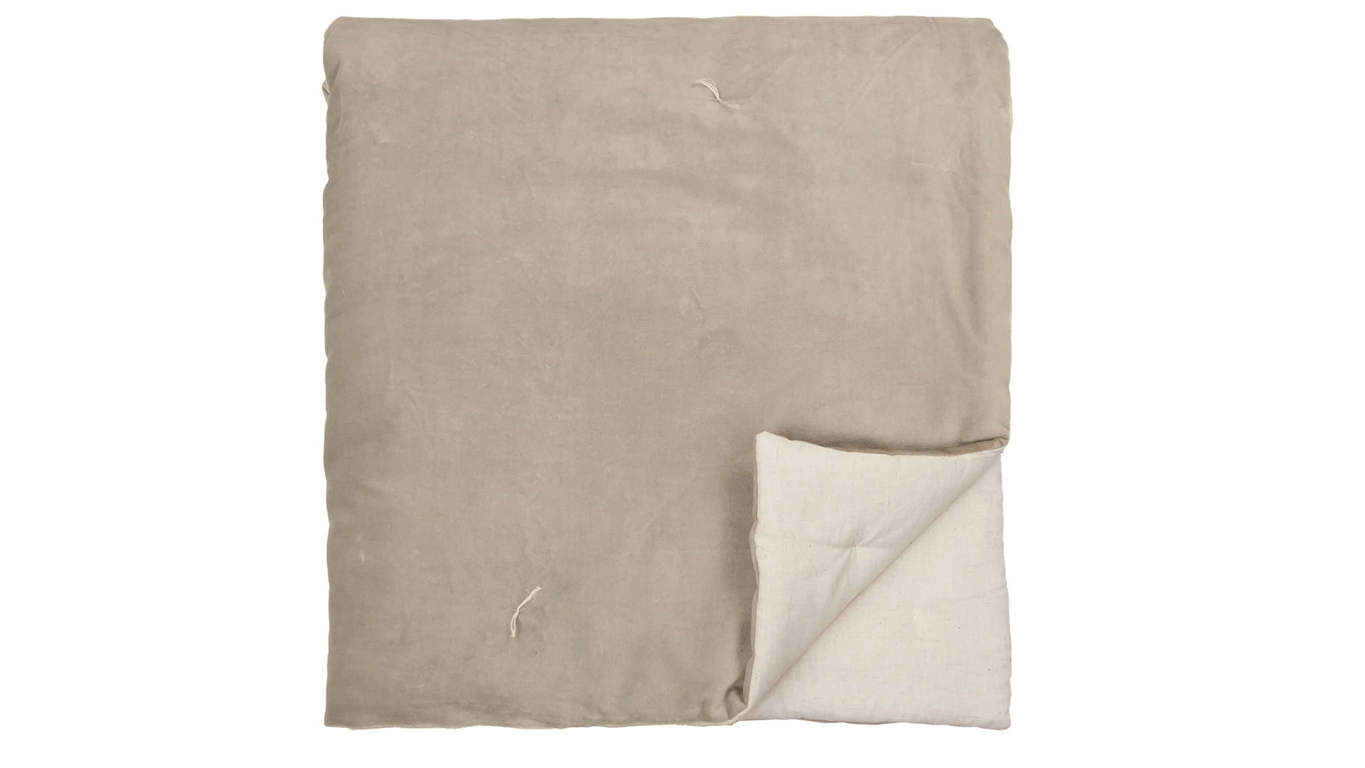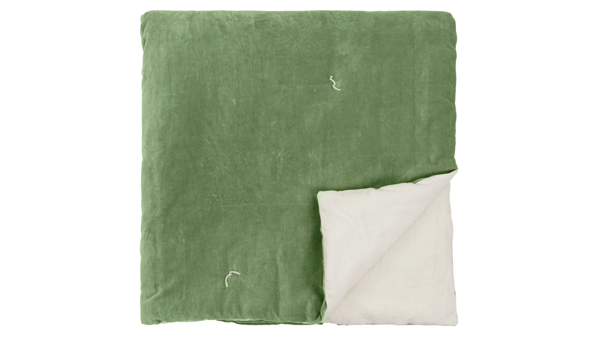 These stylish cotton velvet quilts have a lightly padded feel, and are loosly dotted with a modern quilting stitch detail, in a contrast ecru thread. Each also has a reverse in ecru cotton, a soft ‘linen-look’ fabric – enabling you to use the reverse side for a different, neutral look.