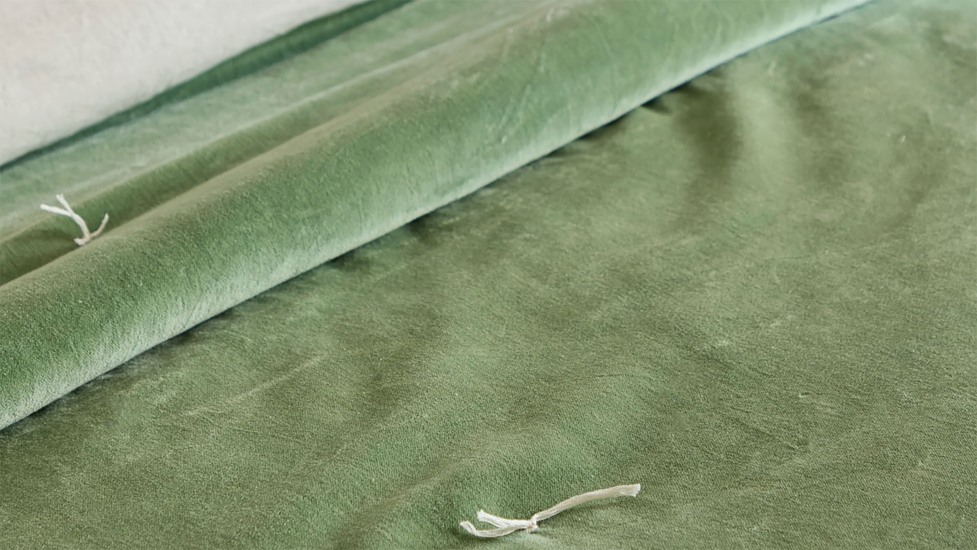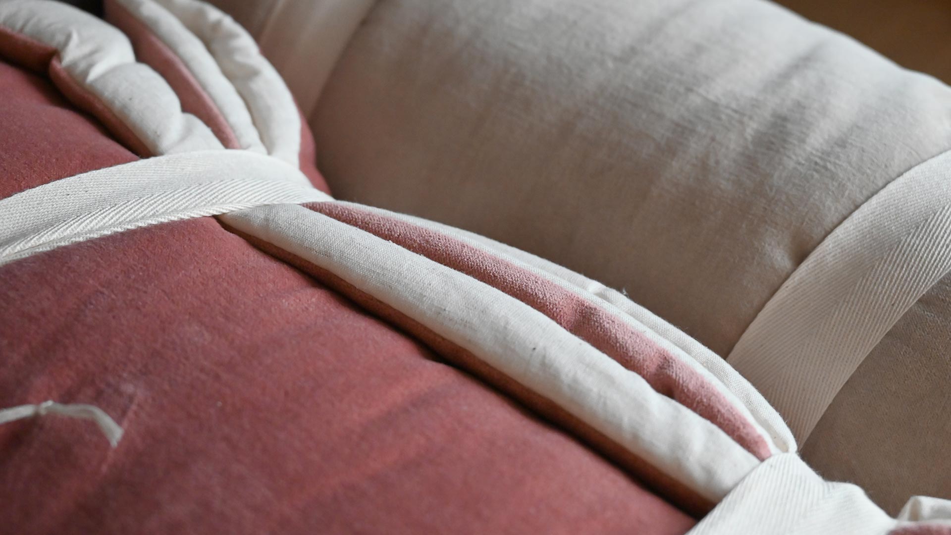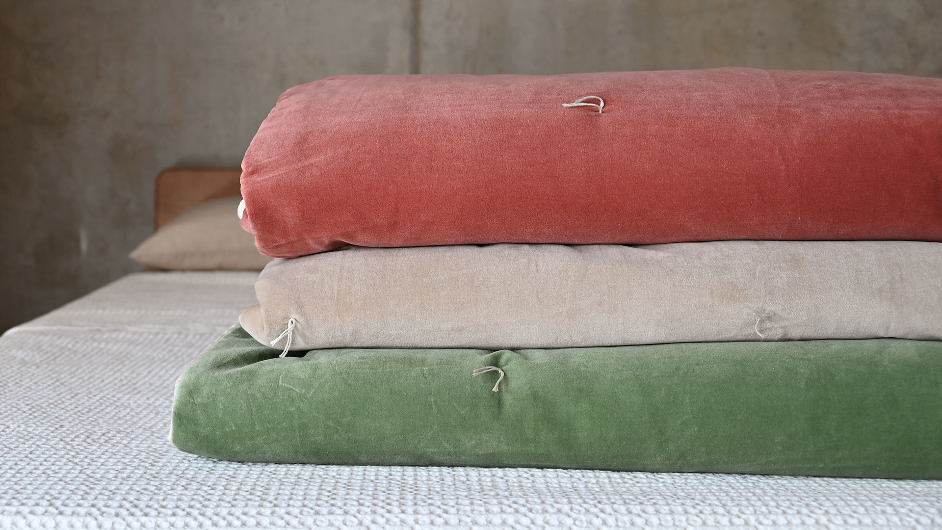 These stylish cotton velvet quilts have a lightly padded feel, and are loosly dotted with a modern quilting stitch detail, in a contrast ecru thread. Each also has a reverse in ecru cotton, a soft ‘linen-look’ fabric – enabling you to use the reverse side for a different, neutral look.