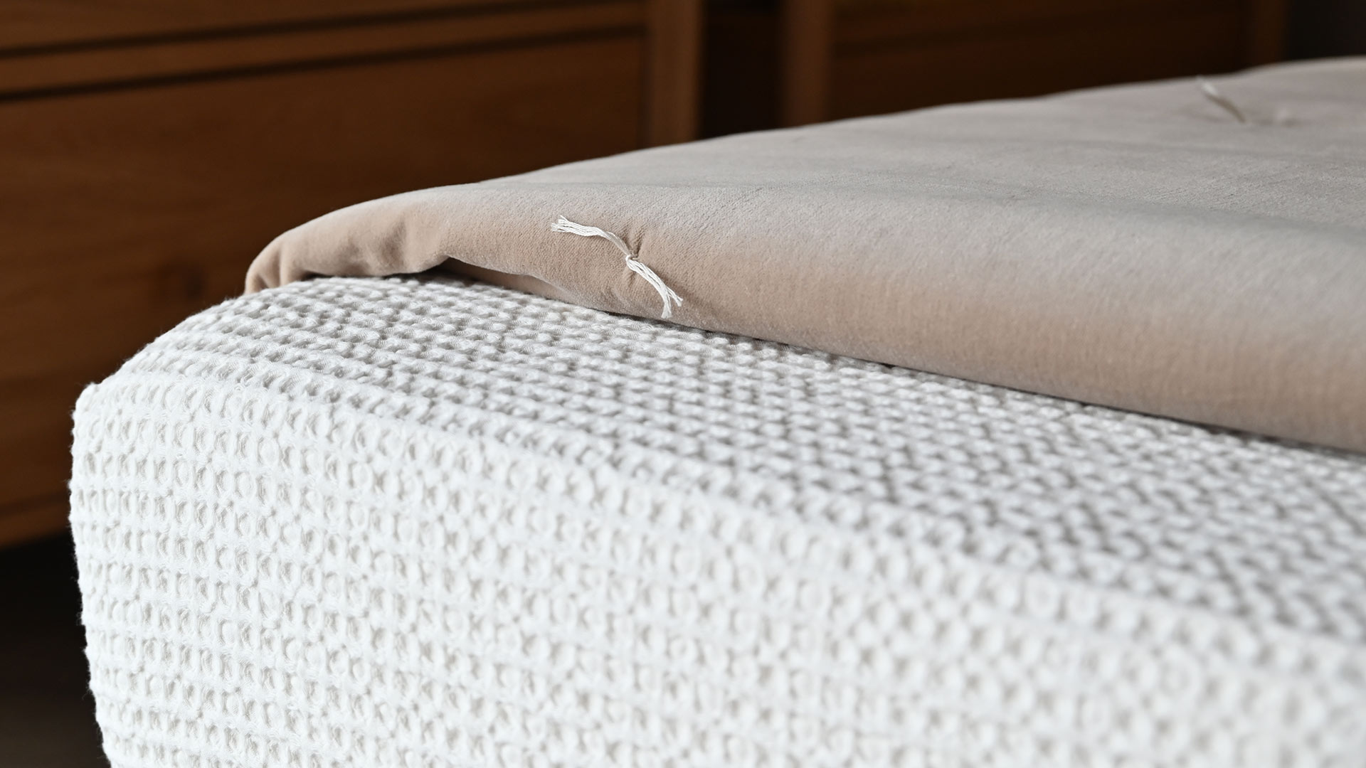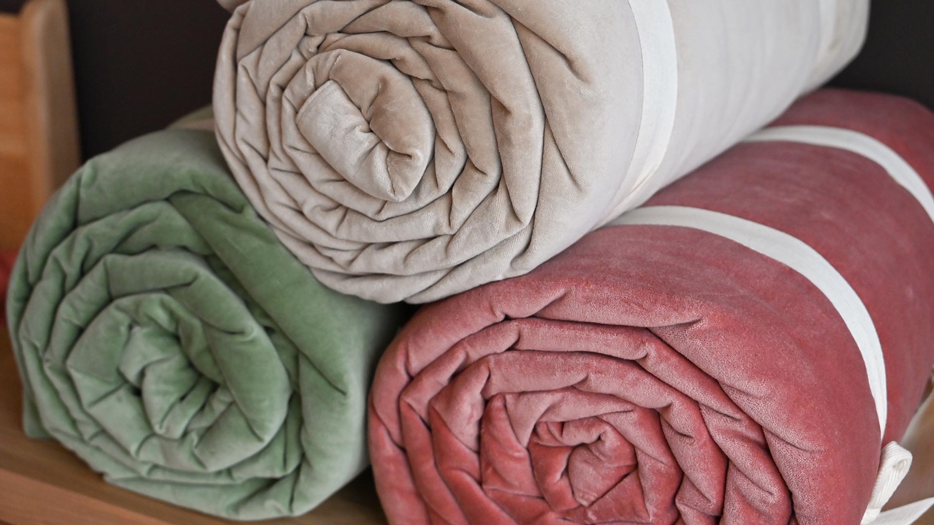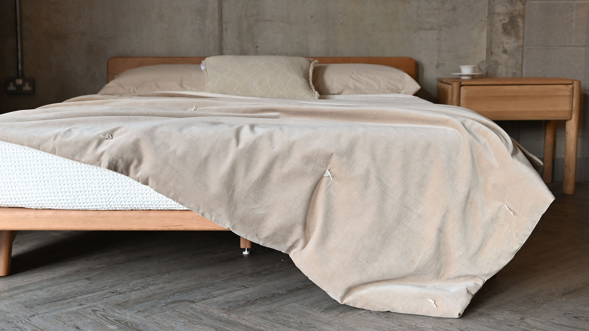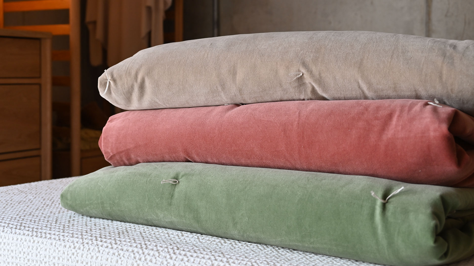 These stylish cotton velvet quilts have a lightly padded feel, and are loosly dotted with a modern quilting stitch detail, in a contrast ecru thread. Each also has a reverse in ecru cotton, a soft ‘linen-look’ fabric – enabling you to use the reverse side for a different, neutral look.