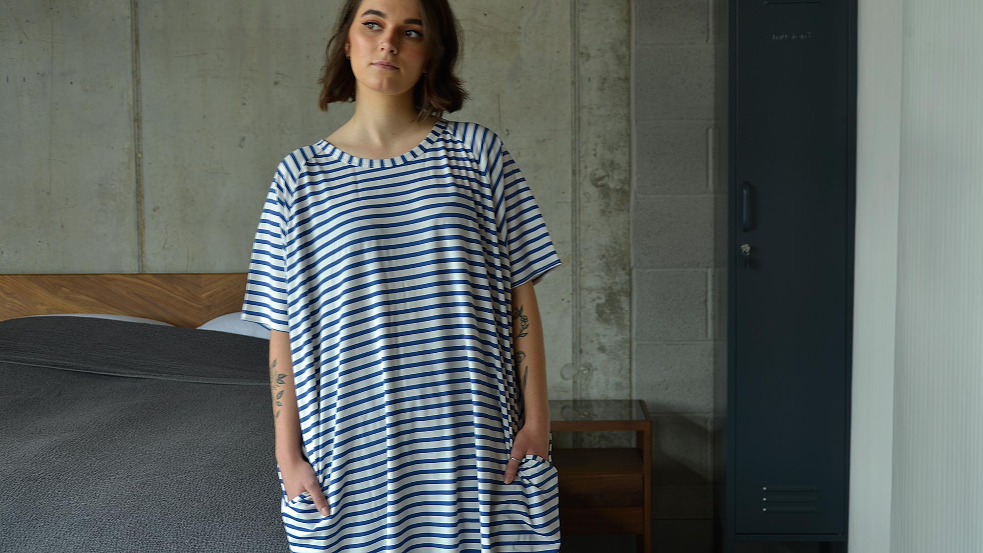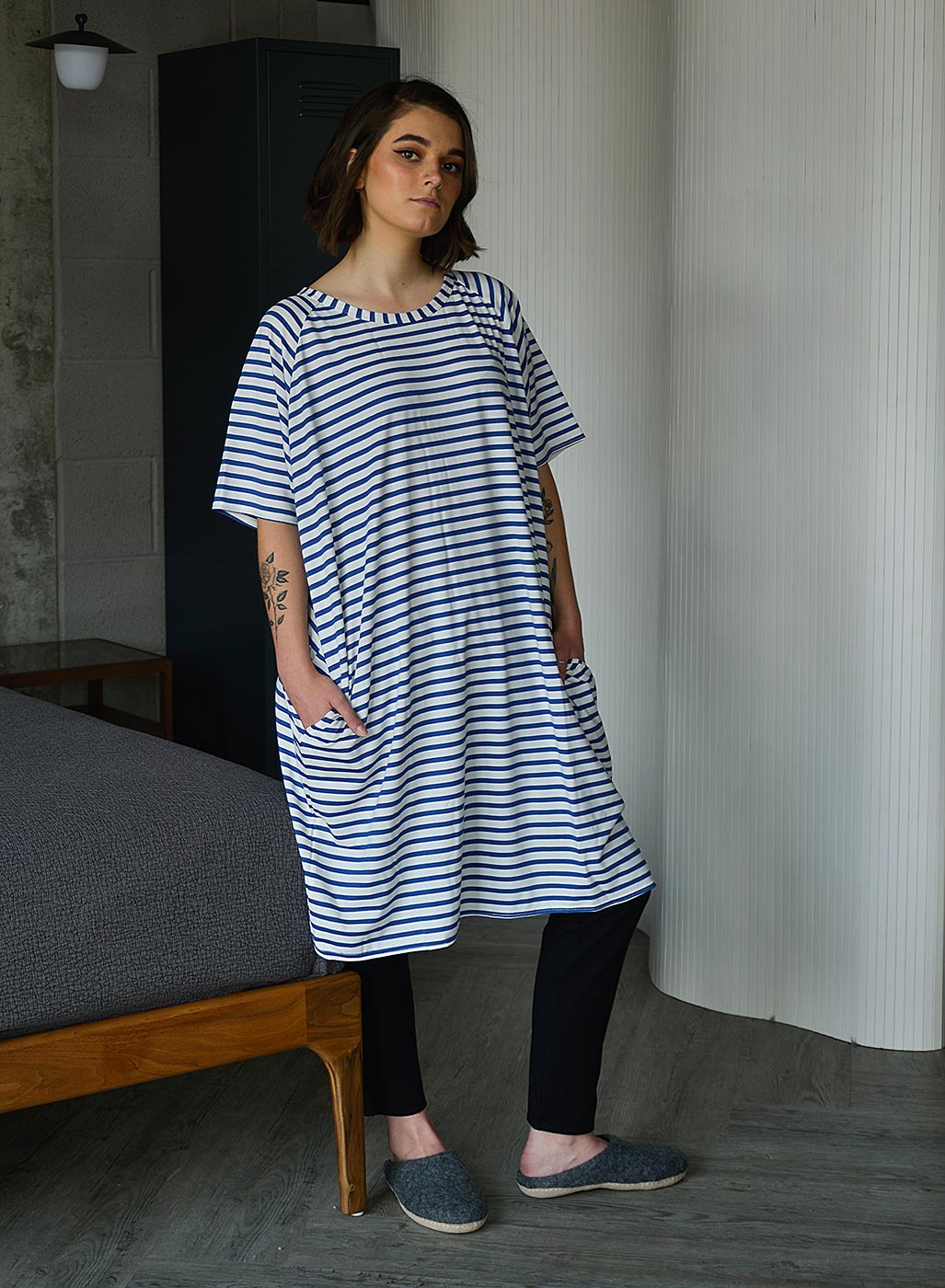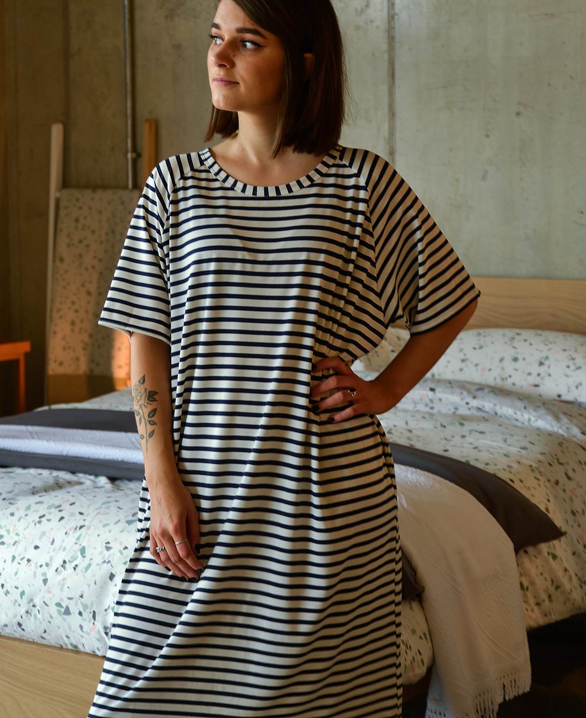 Part of our relaxed, luxury lounge-wear collection – a loose fit, cotton rich jersey dress in the following styles: White with a navy star – £60.00 each Navy with a white star – £60.00 each Ink and white stripes – £57.00 each Blue and white stripes – £57.00 each