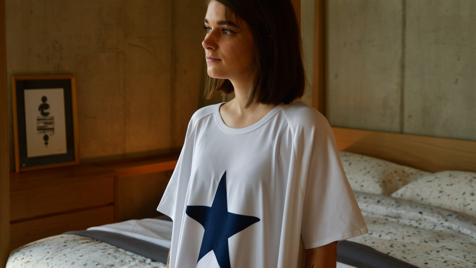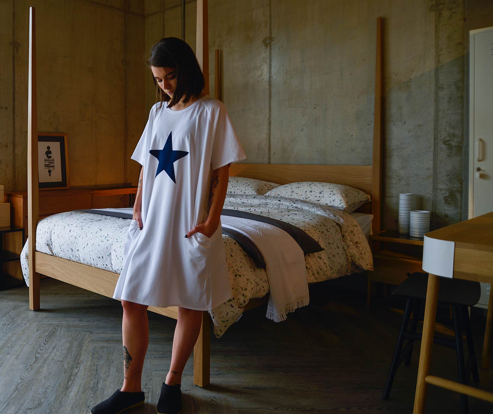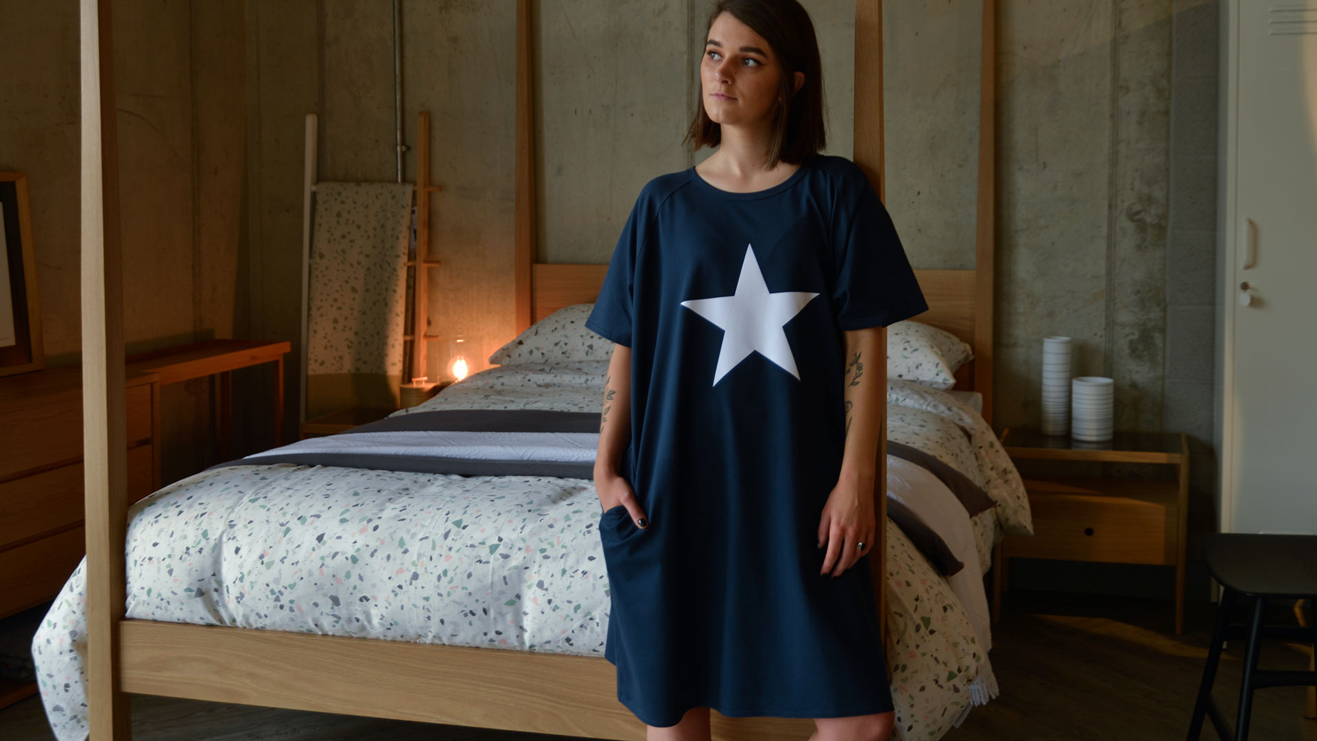 Part of our relaxed, luxury lounge-wear collection – a loose fit, cotton rich jersey dress in the following styles: White with a navy star – £60.00 each Navy with a white star – £60.00 each Ink and white stripes – £57.00 each Blue and white stripes – £57.00 each