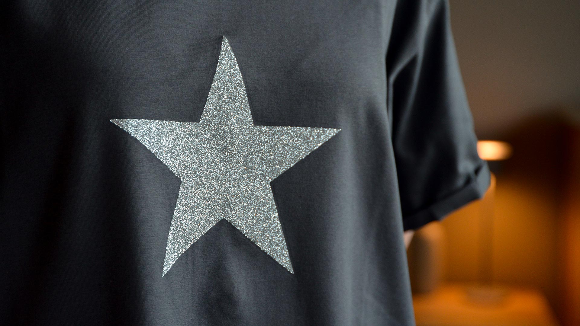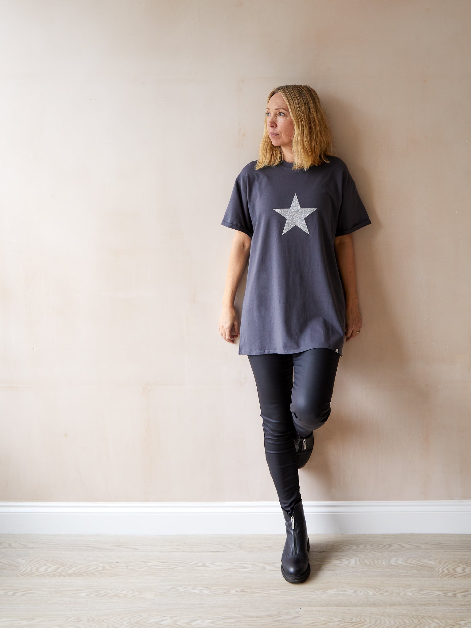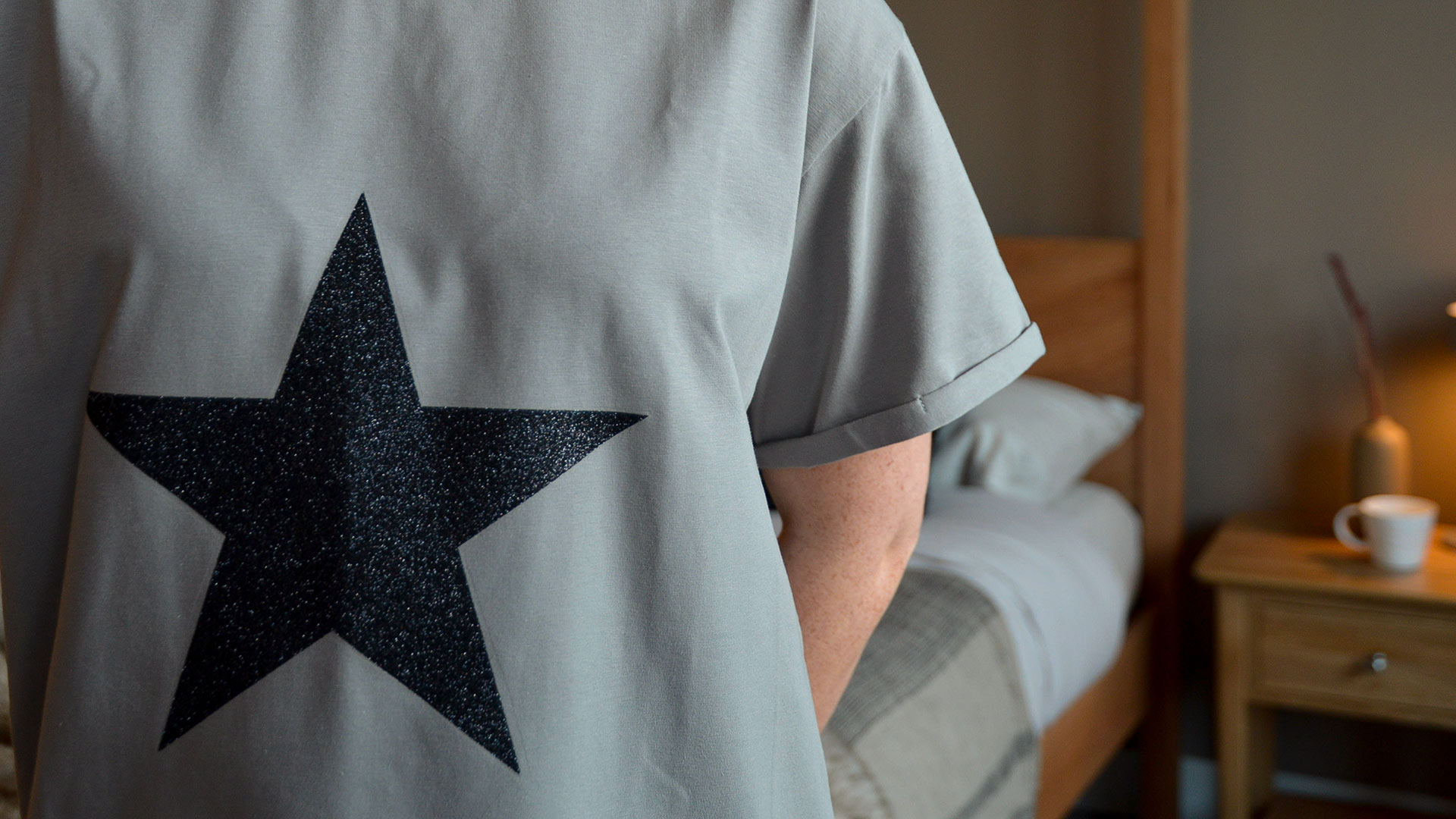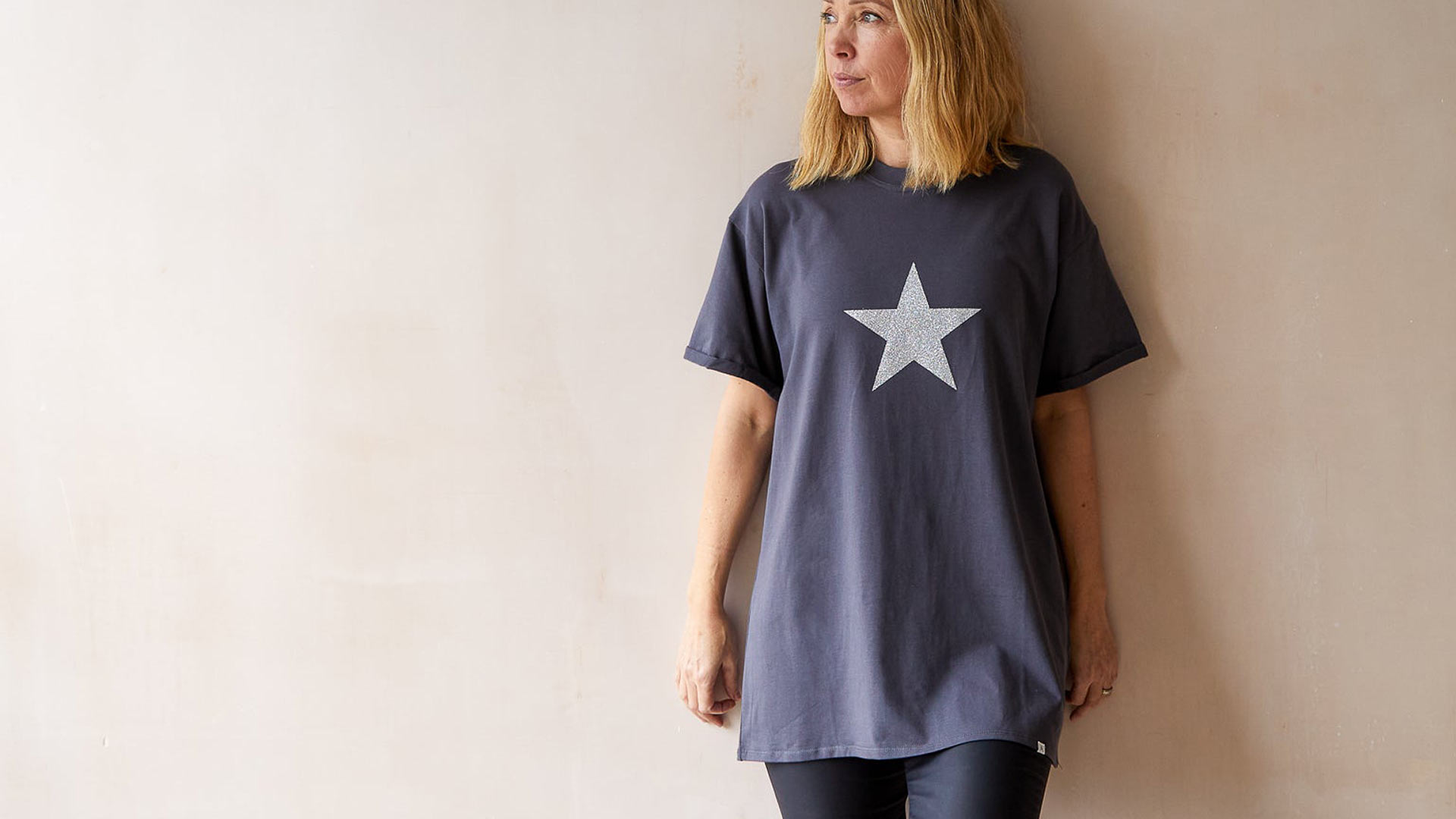 An organic jersey, relaxed T-shirt with glitter star – available in 3 colourways. This is an oversized, boyfriend-style t-shirt with rolled up sleeves. Made from organic cotton. Great with your lounge pants for comfort or with jeans to go out.