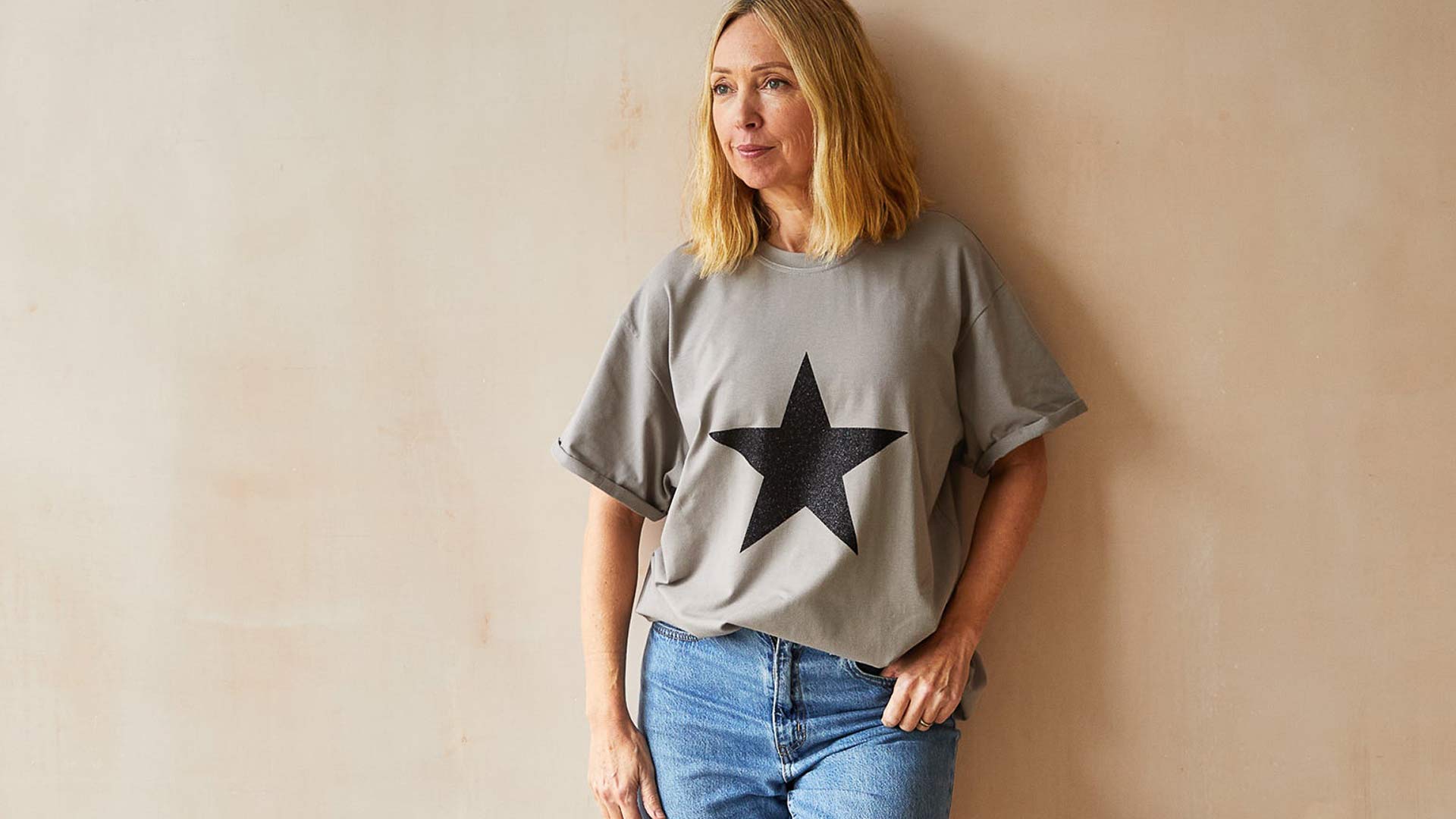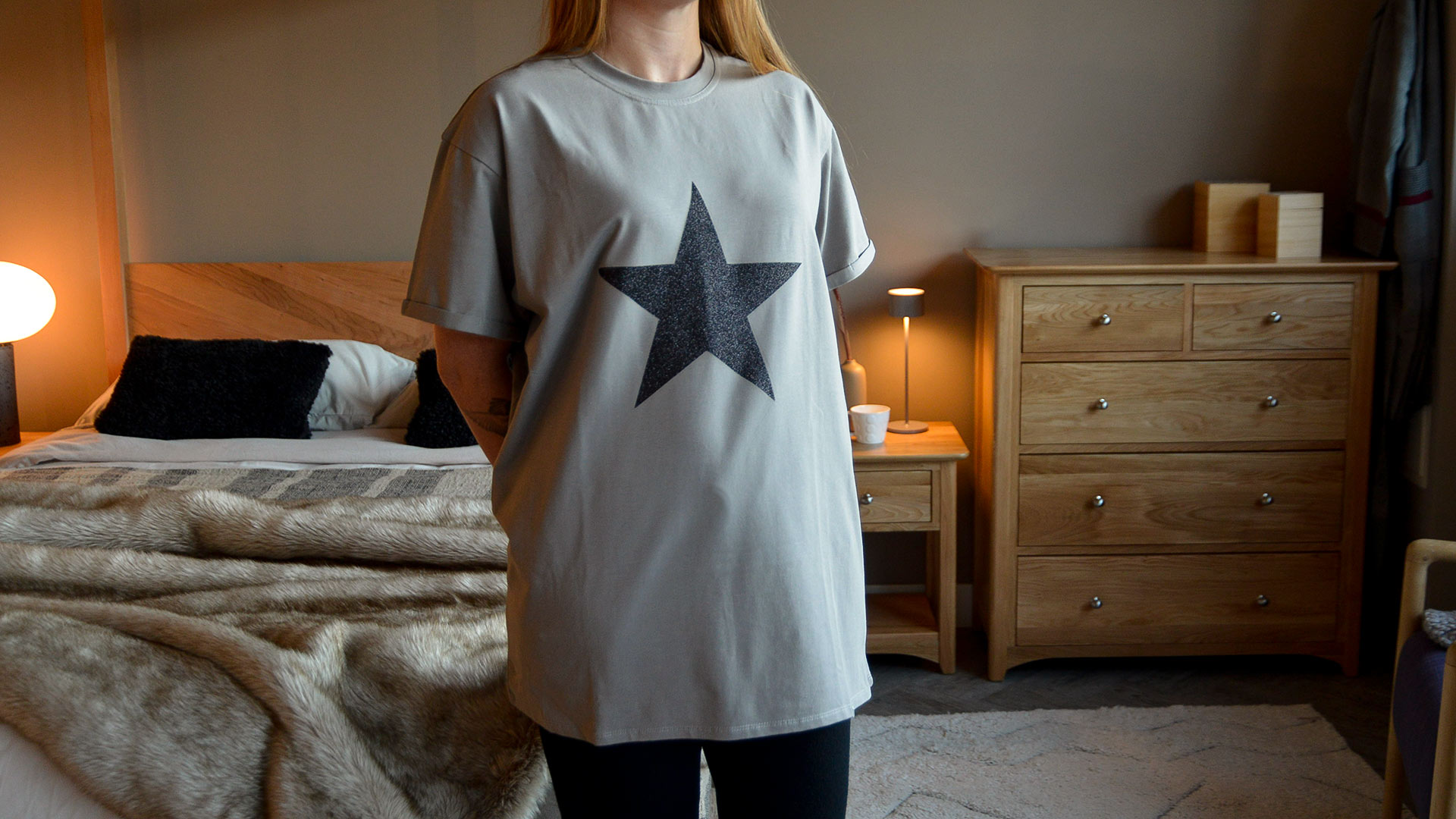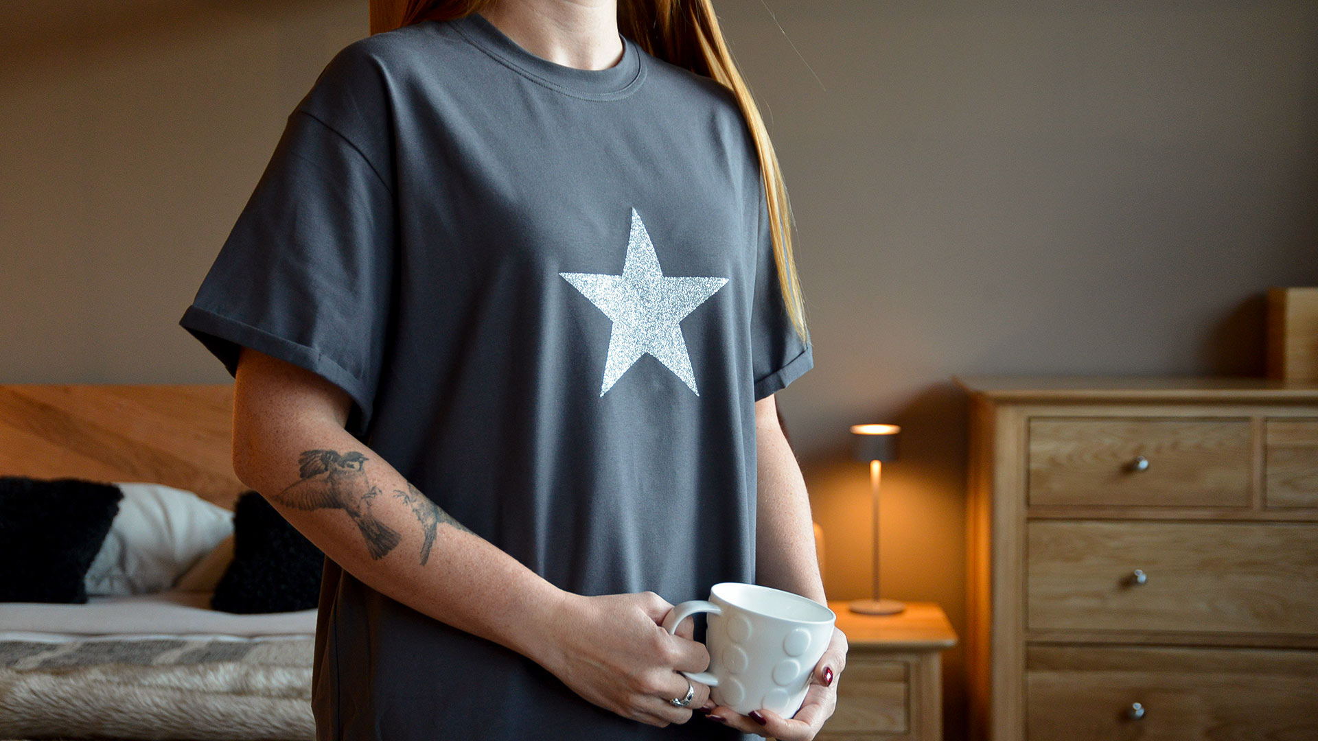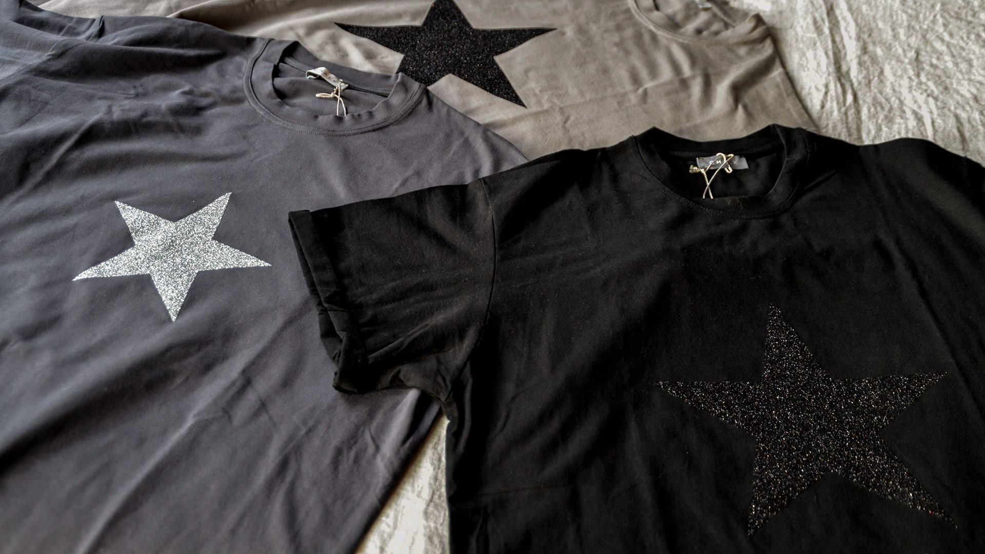 An organic jersey, relaxed T-shirt with glitter star – available in 3 colourways. This is an oversized, boyfriend-style t-shirt with rolled up sleeves. Made from organic cotton. Great with your lounge pants for comfort or with jeans to go out.