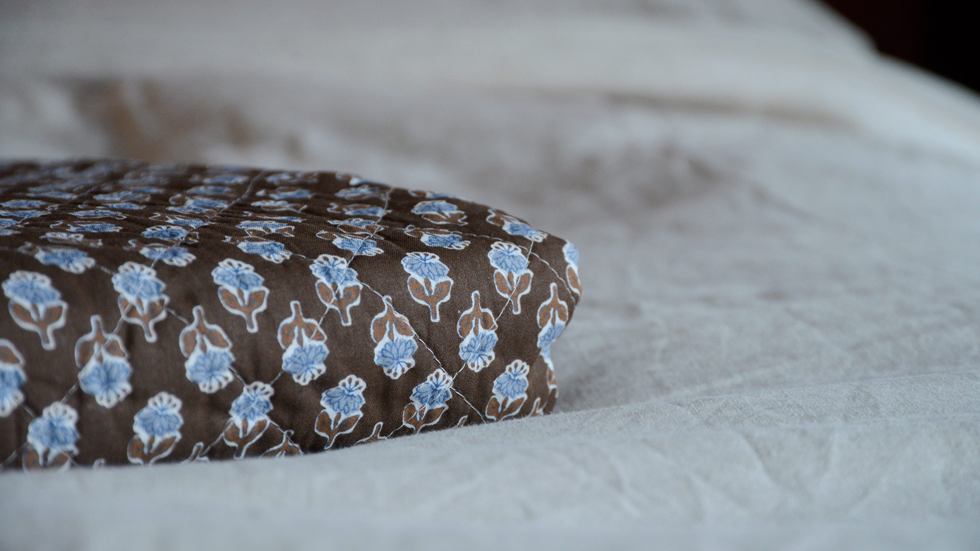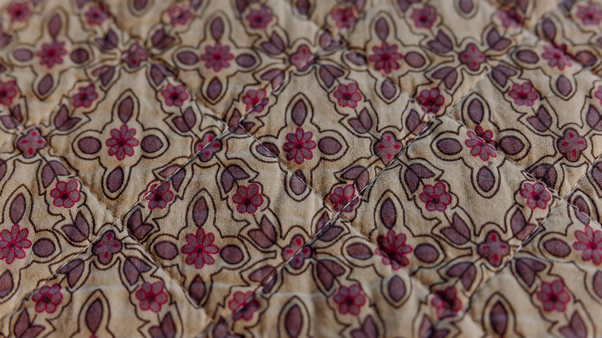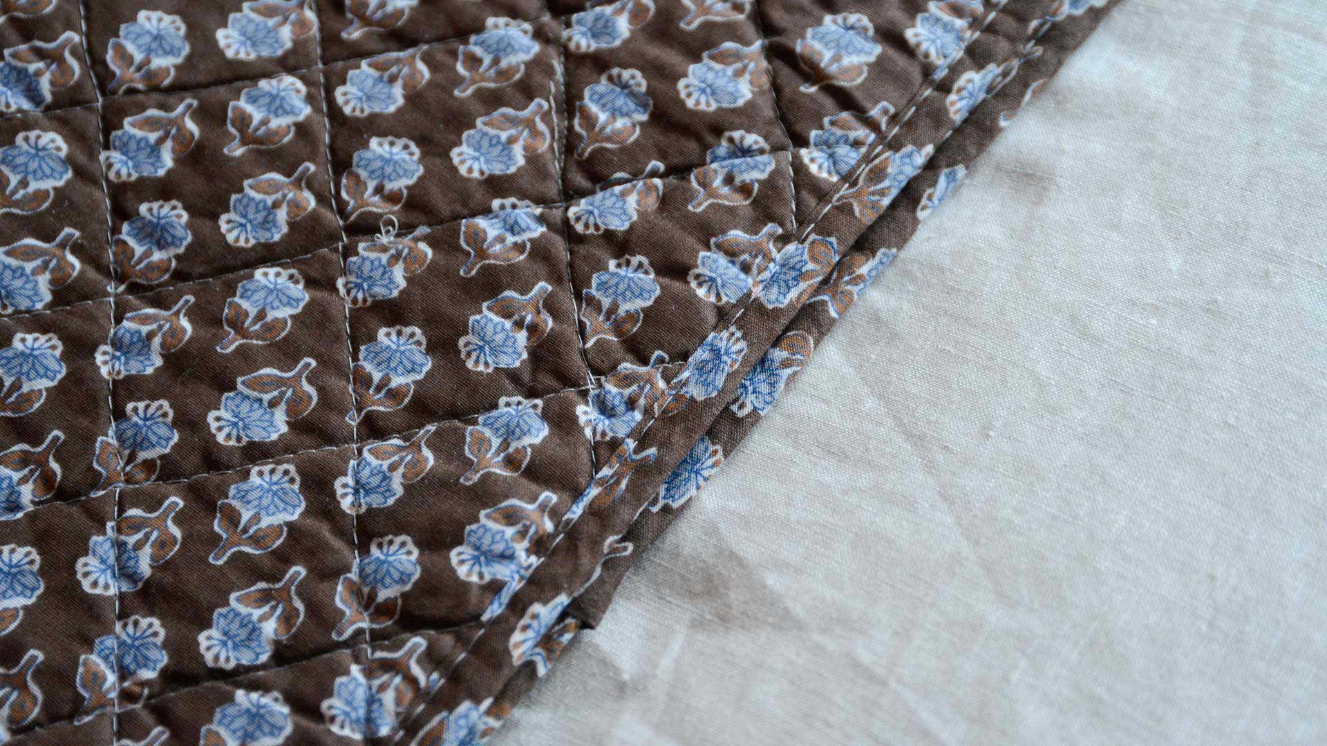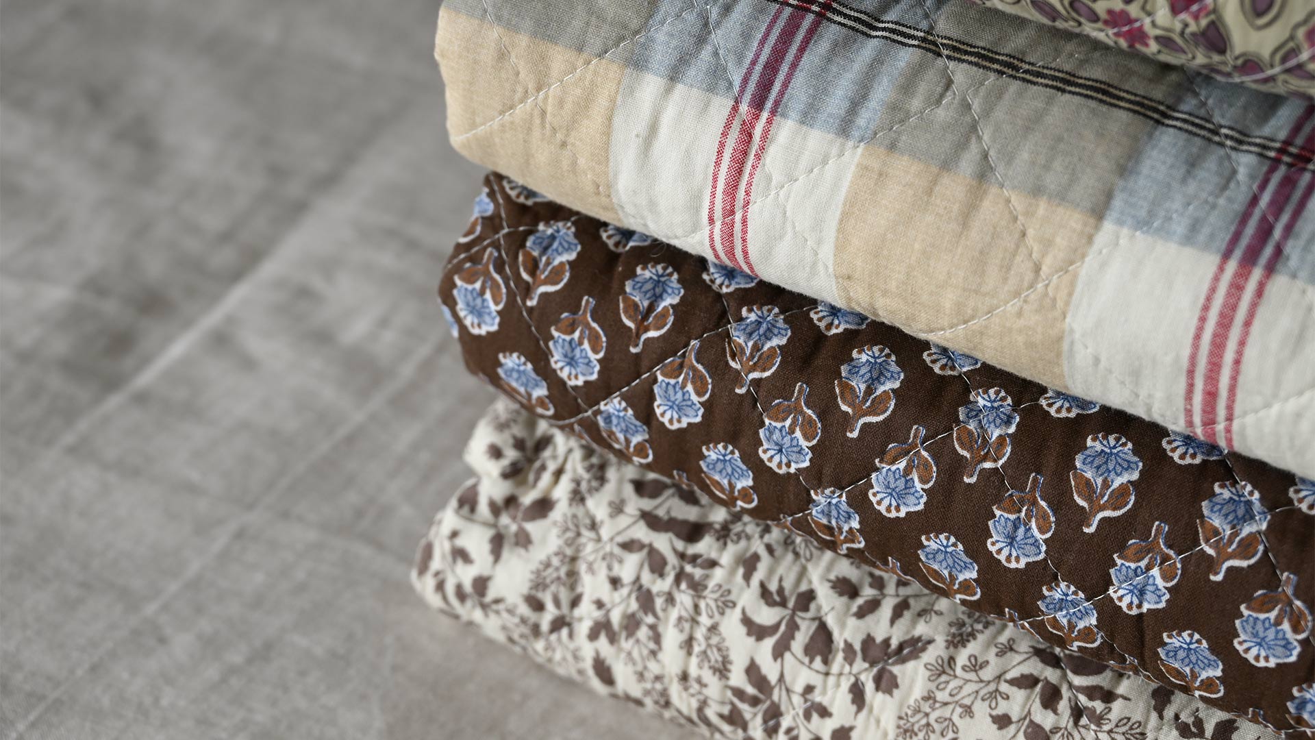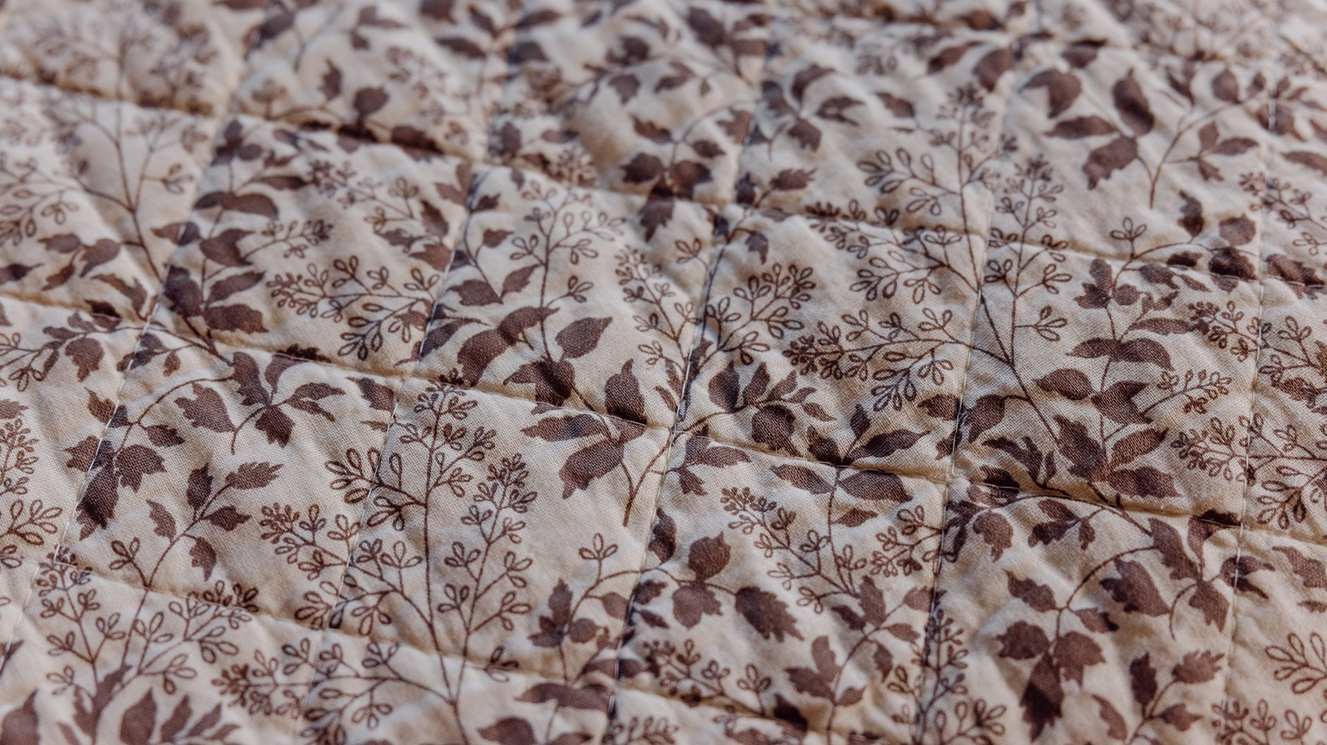 Quilted throws featuring nostalgic prints in a modern palette, each with a stitched design that creates a ‘quilted’ effect. Available here in four patterns; Red Check, Brown Leaves, Diamond Floral and Brown & Pale Blue Floral.