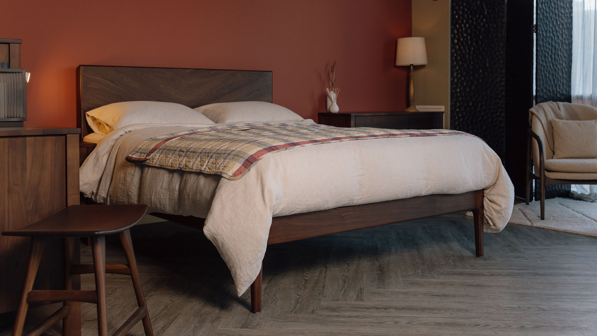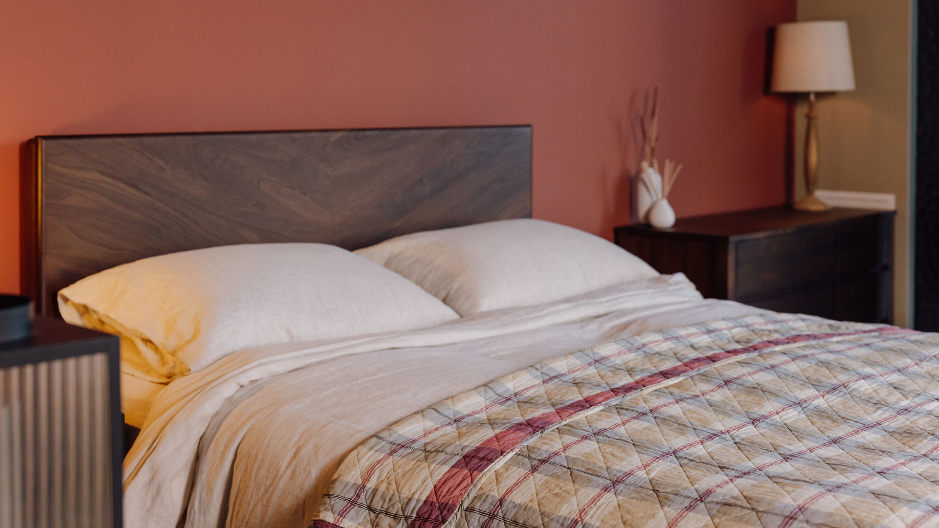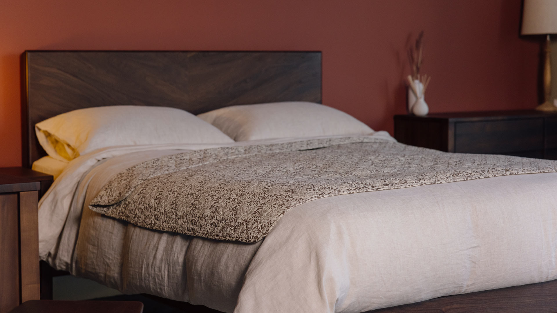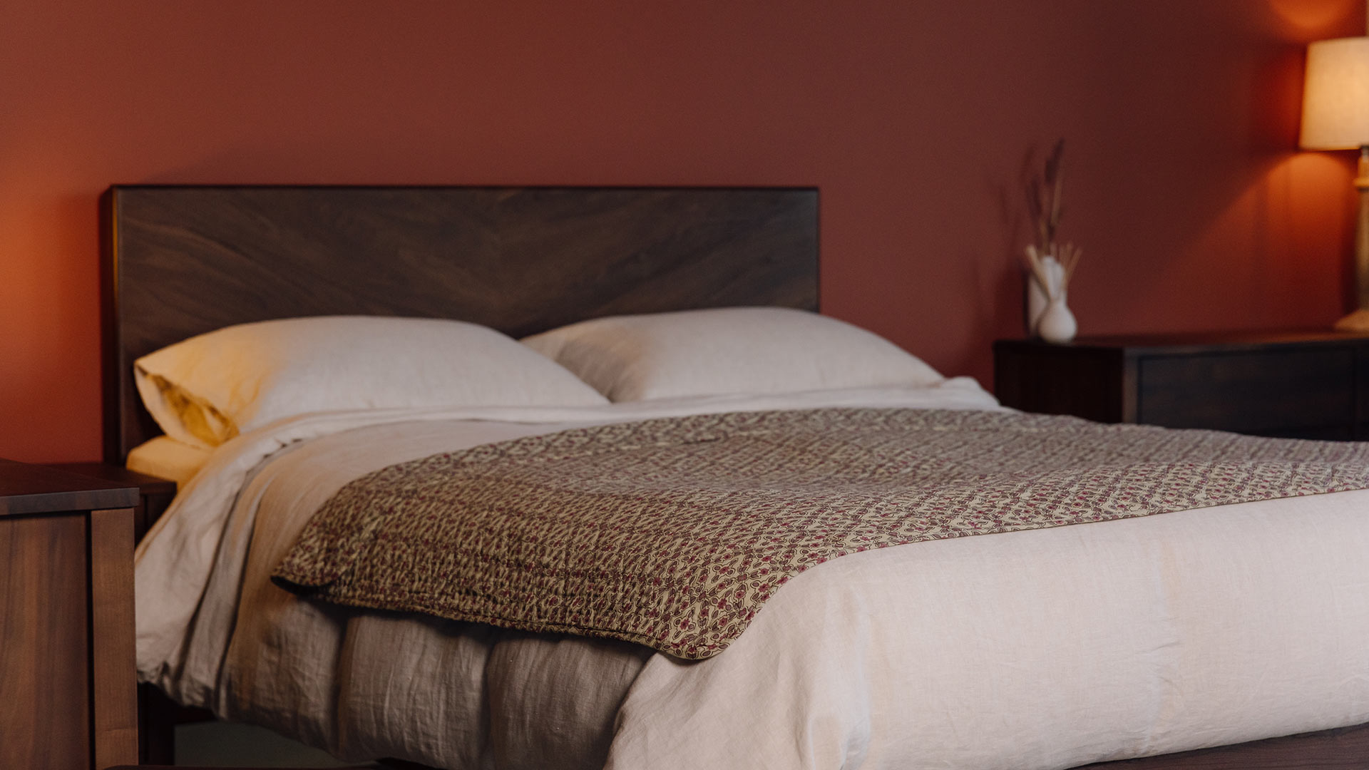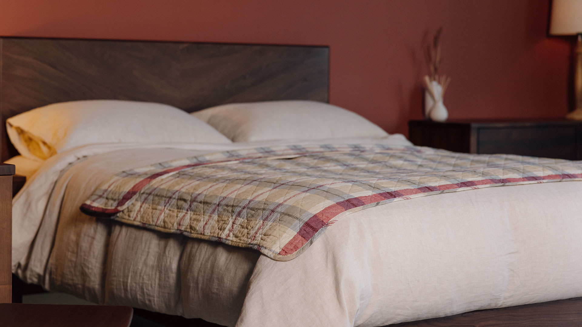 Quilted throws featuring nostalgic prints in a modern palette, each with a stitched design that creates a ‘quilted’ effect. Available here in four patterns; Red Check, Brown Leaves, Diamond Floral and Brown & Pale Blue Floral.
