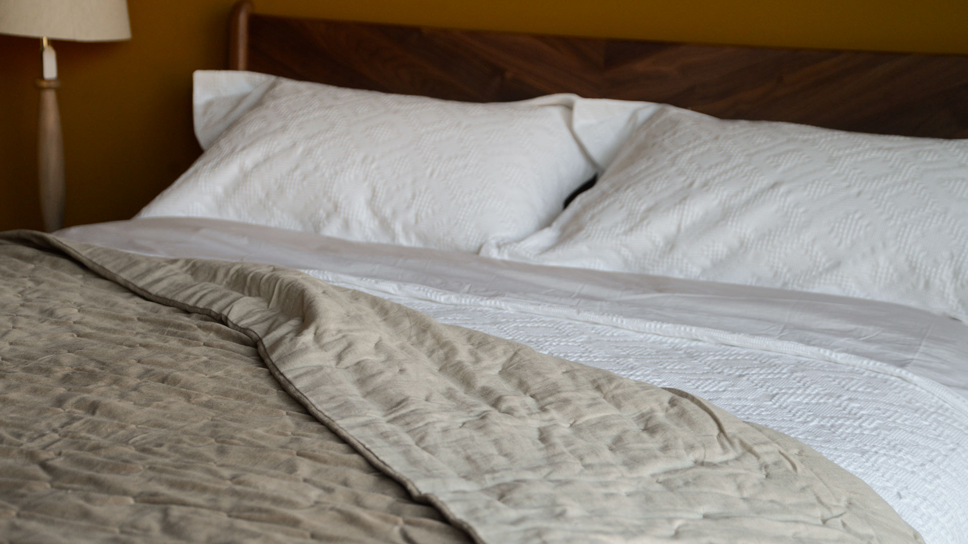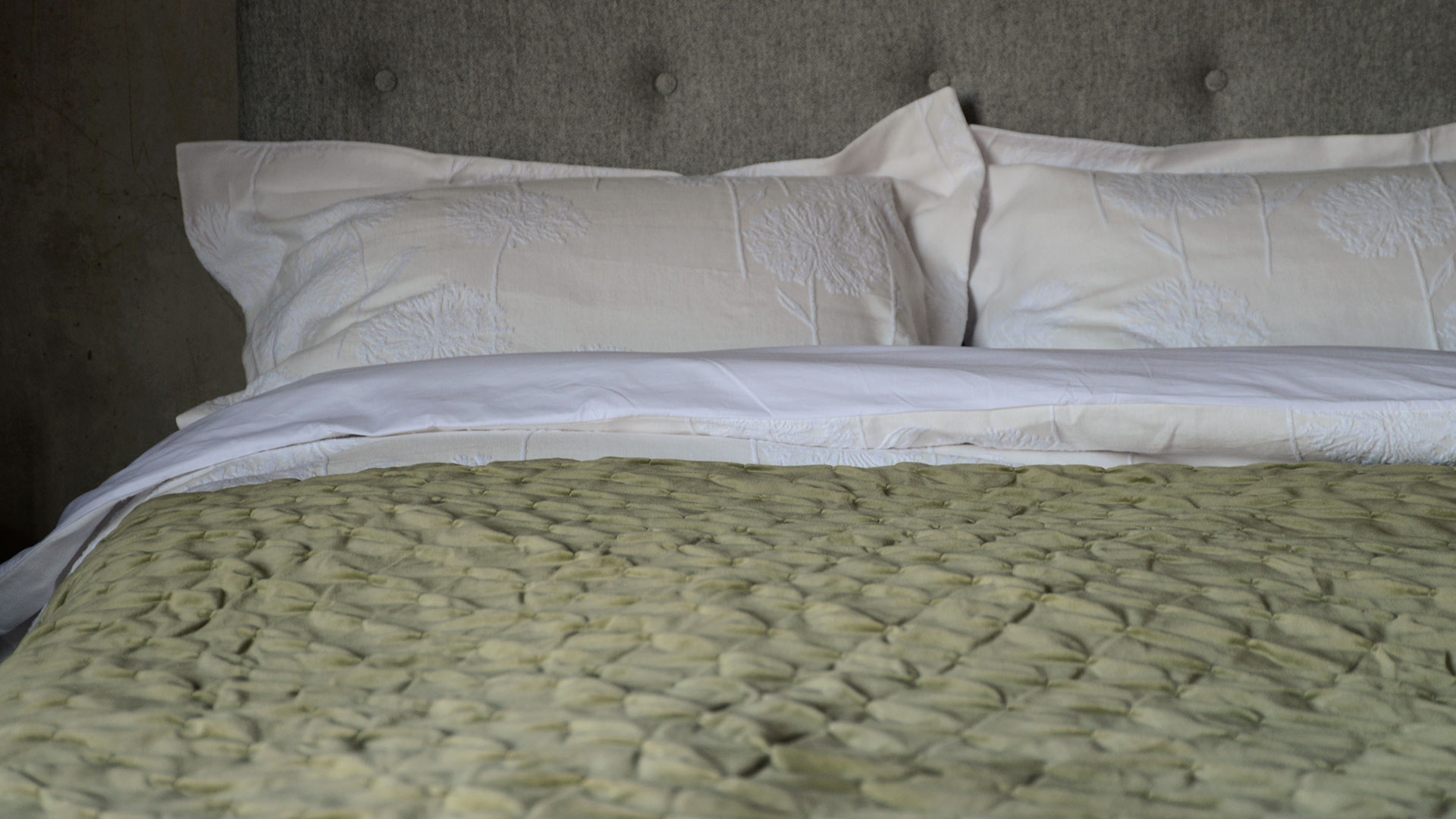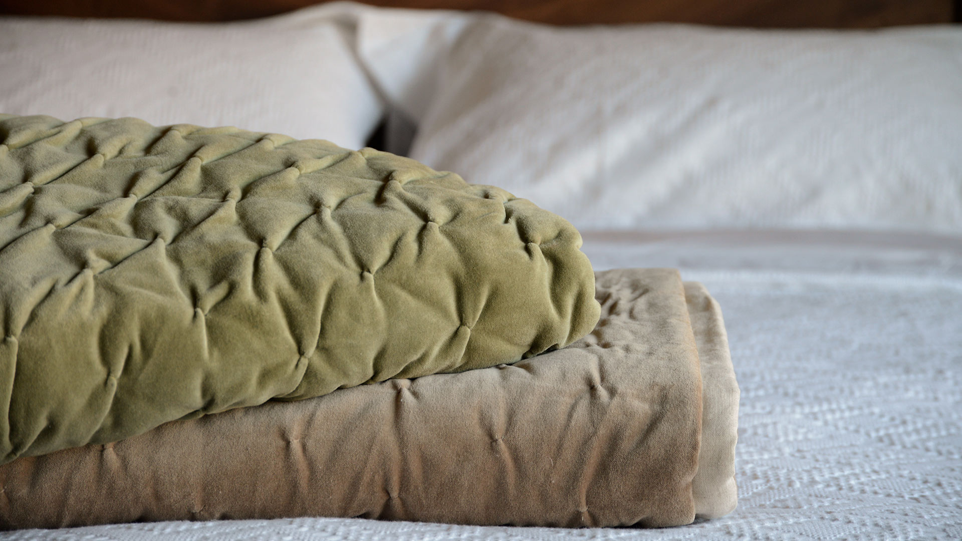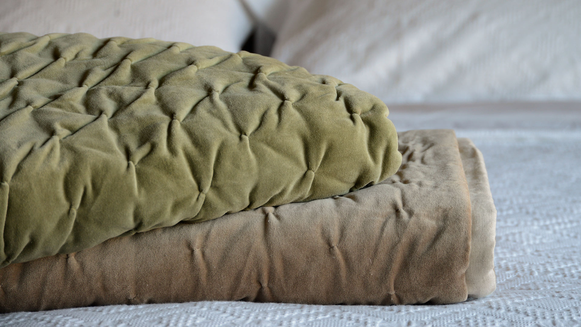 Reversible cotton velvet quilted throws in 100% cotton velvet with a cotton and linen blend fabric reverse. Perfect for over the end of your bed, or to snuggle under on a cool evening. Thick and soft coverlets with pure cotton velvet one side, in warm sage-green, deep forest green or light brown, with an ecru colour linen and cotton fabric the other.