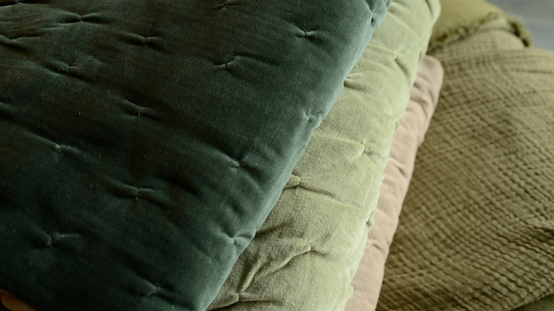 Reversible cotton velvet quilted throws in 100% cotton velvet with a cotton and linen fabric reverse. Available in the following colours: sage green, forest green or taupe.
