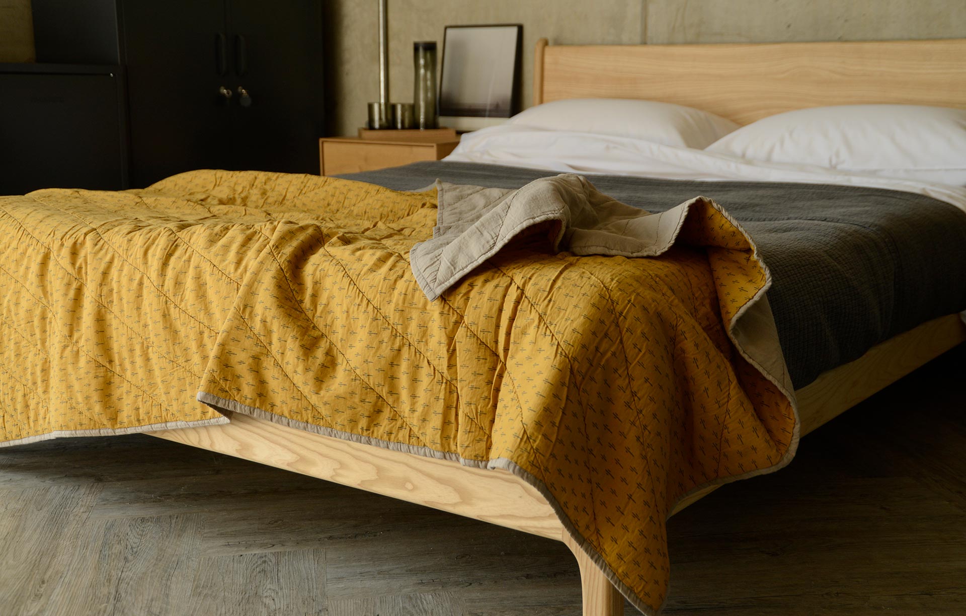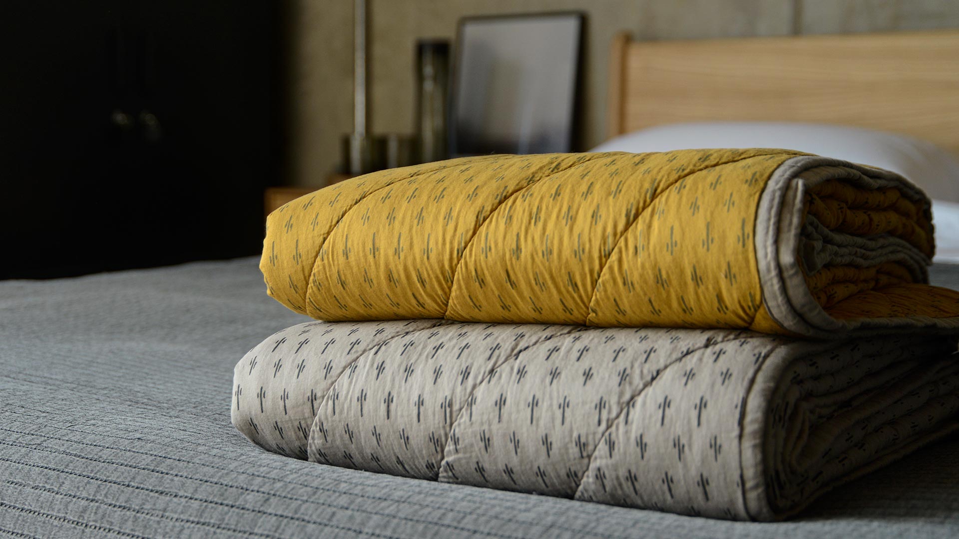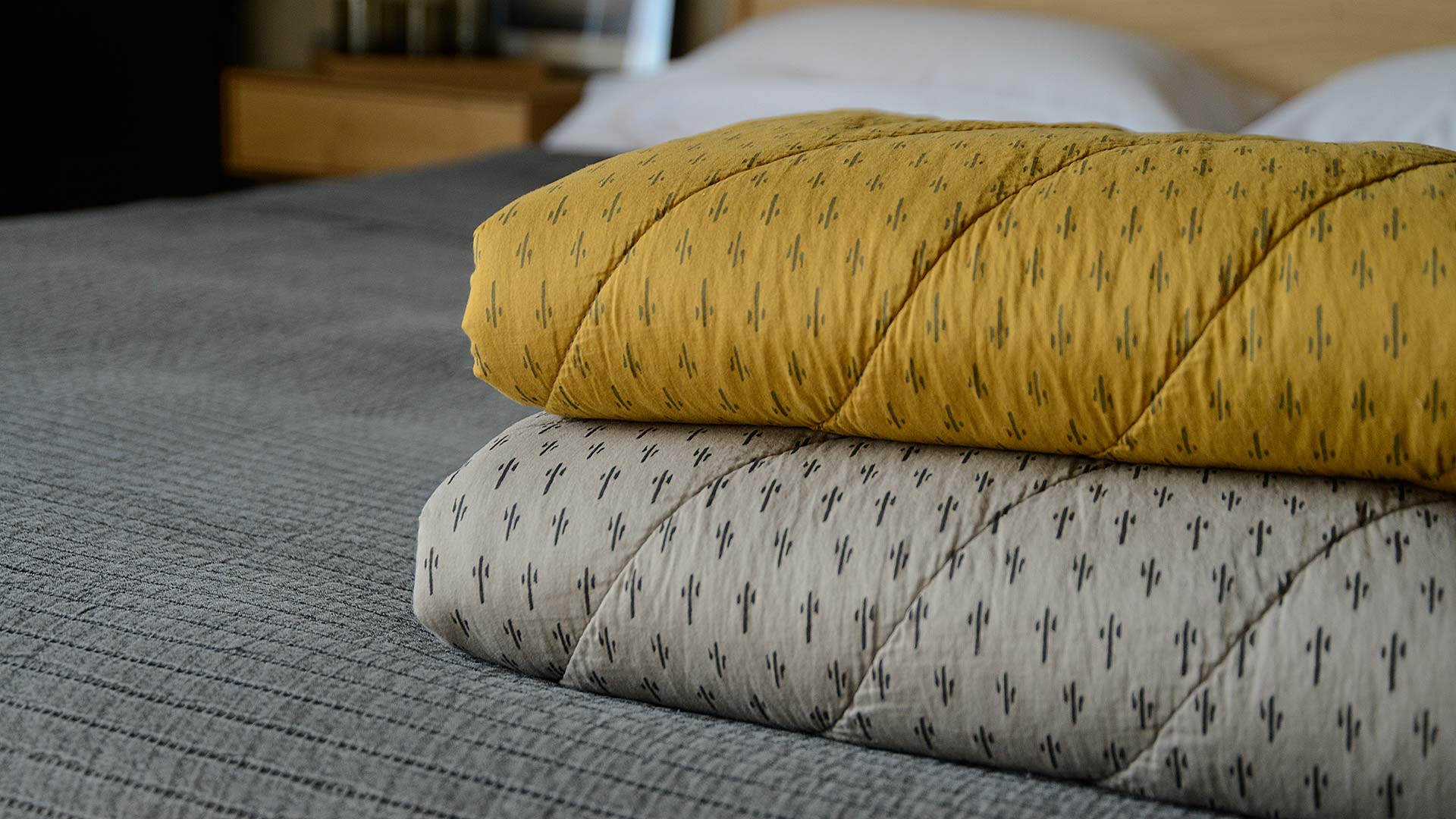 Soft quilted blankets, made using fine cotton fabric with a large scale, chevron quilted pattern. Reversible throws with a simple pattern to one side and a plain fabric to the reverse. Available in the following colours: