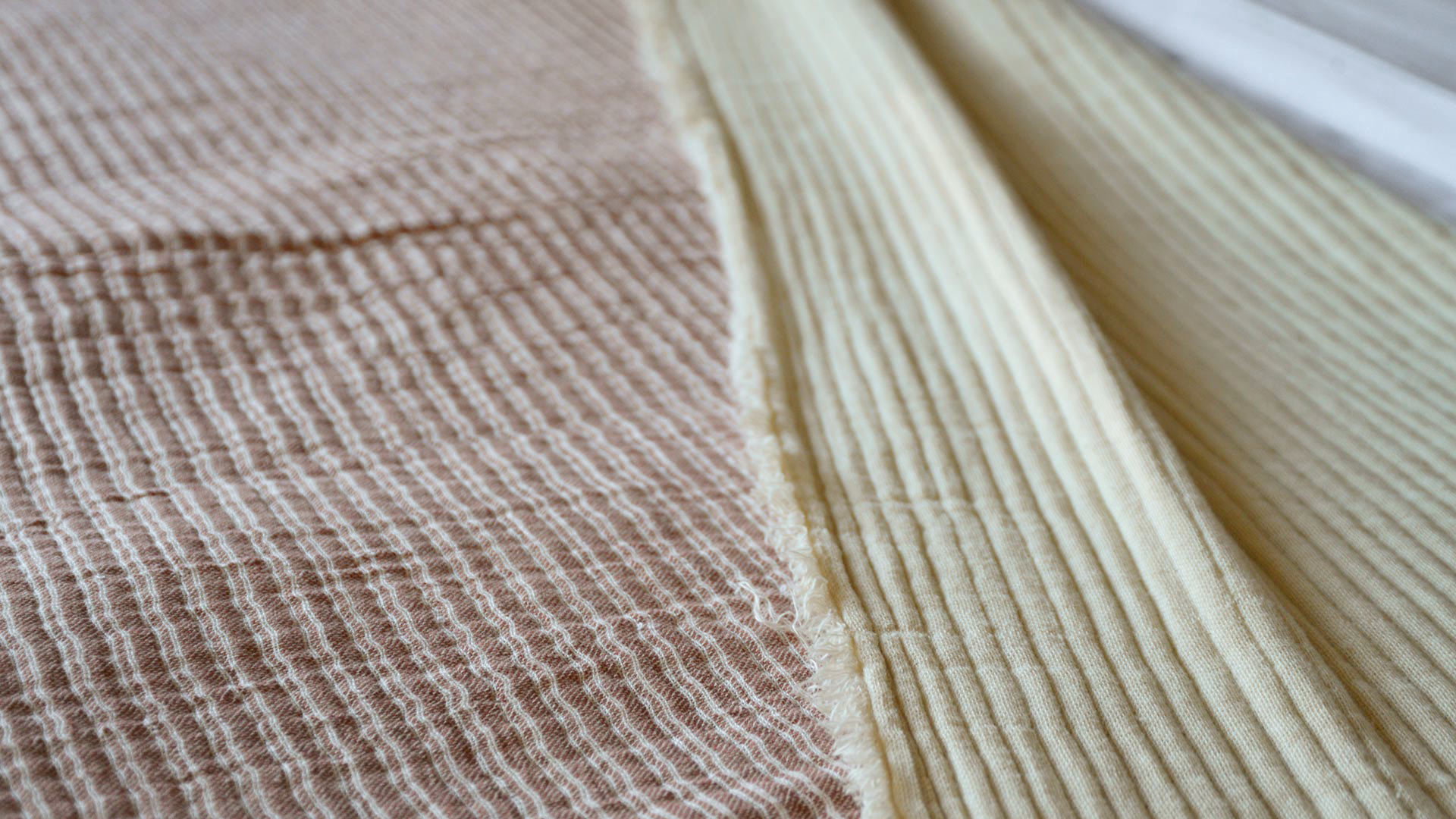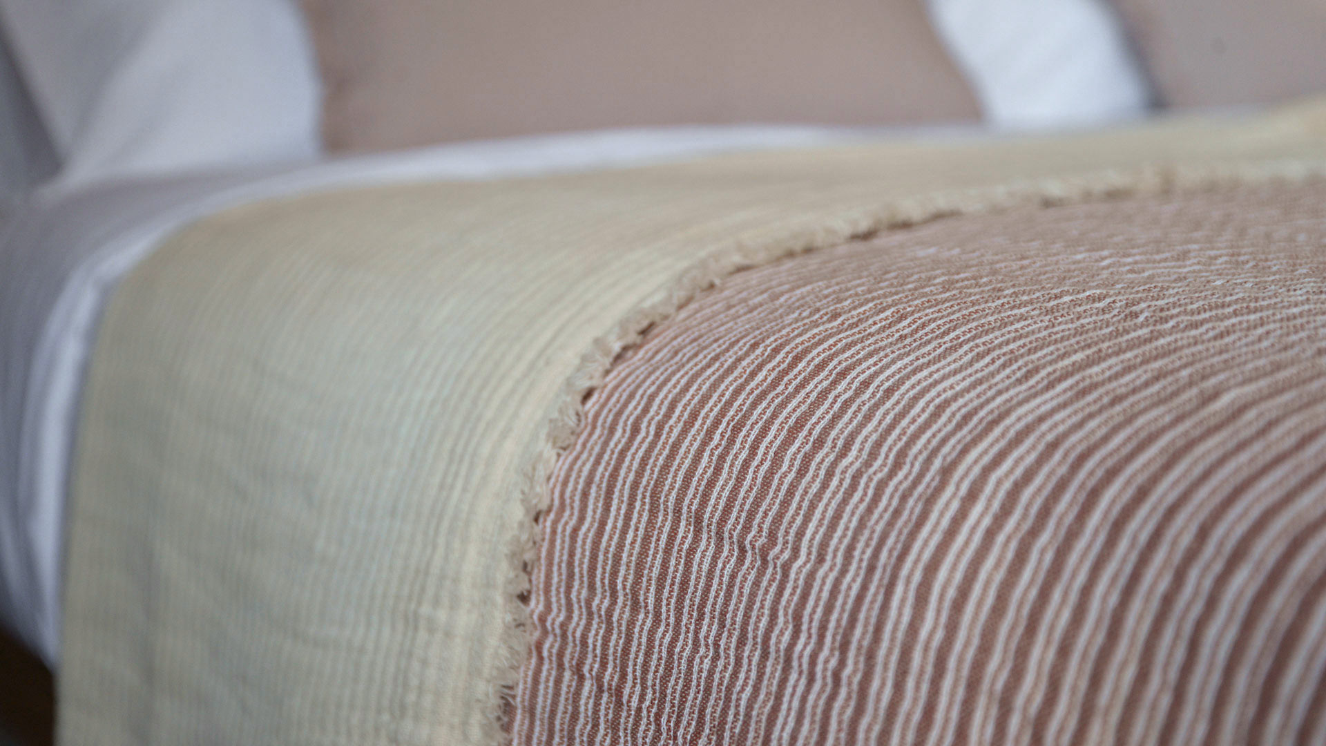 This reversible textured cotton bedspread is a lightly quilted bedspread suitable for double, king or super-king size beds (depending on the preferred length of the drop). A relaxed, contemporary bedspread in plain cream on one side, with a striped pattern in red and cream to the reverse. This creates a blush pink hue from a distance for a complex look. Complete with a short fringe detail to all edges.