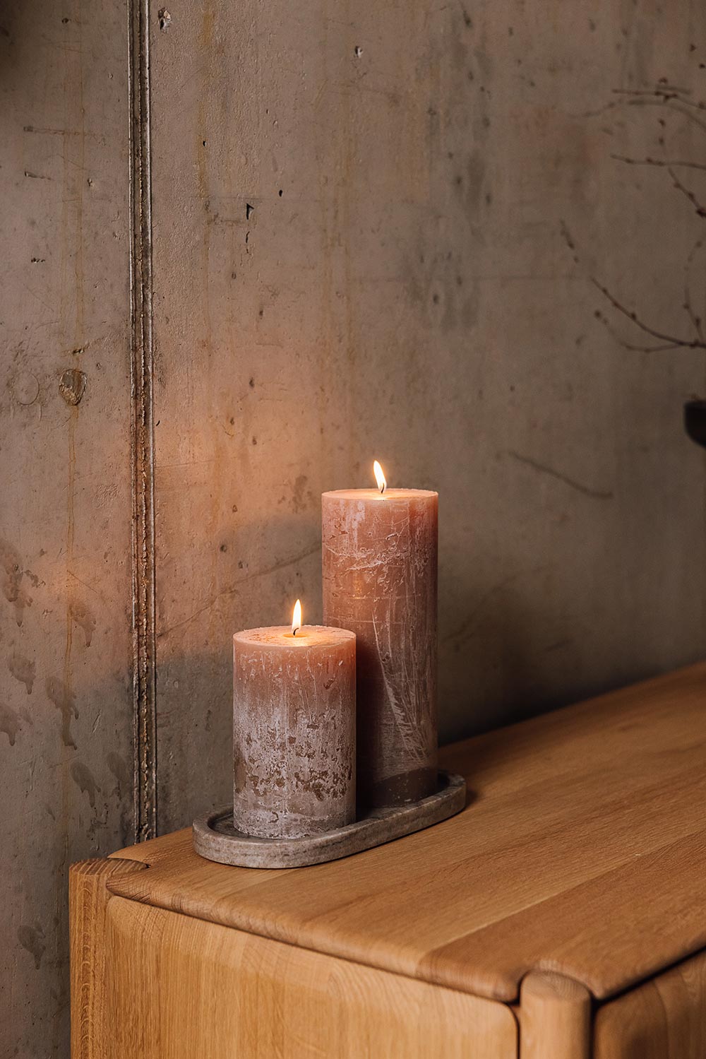These rustic pillar candles make a statement in any space, whilst offering a sense of calm and cosiness. Available in three sizes, they are a satisfying weight and presence. With a rustic, textured pale taupe colour finish to suit a wide range of spaces. Unscented.