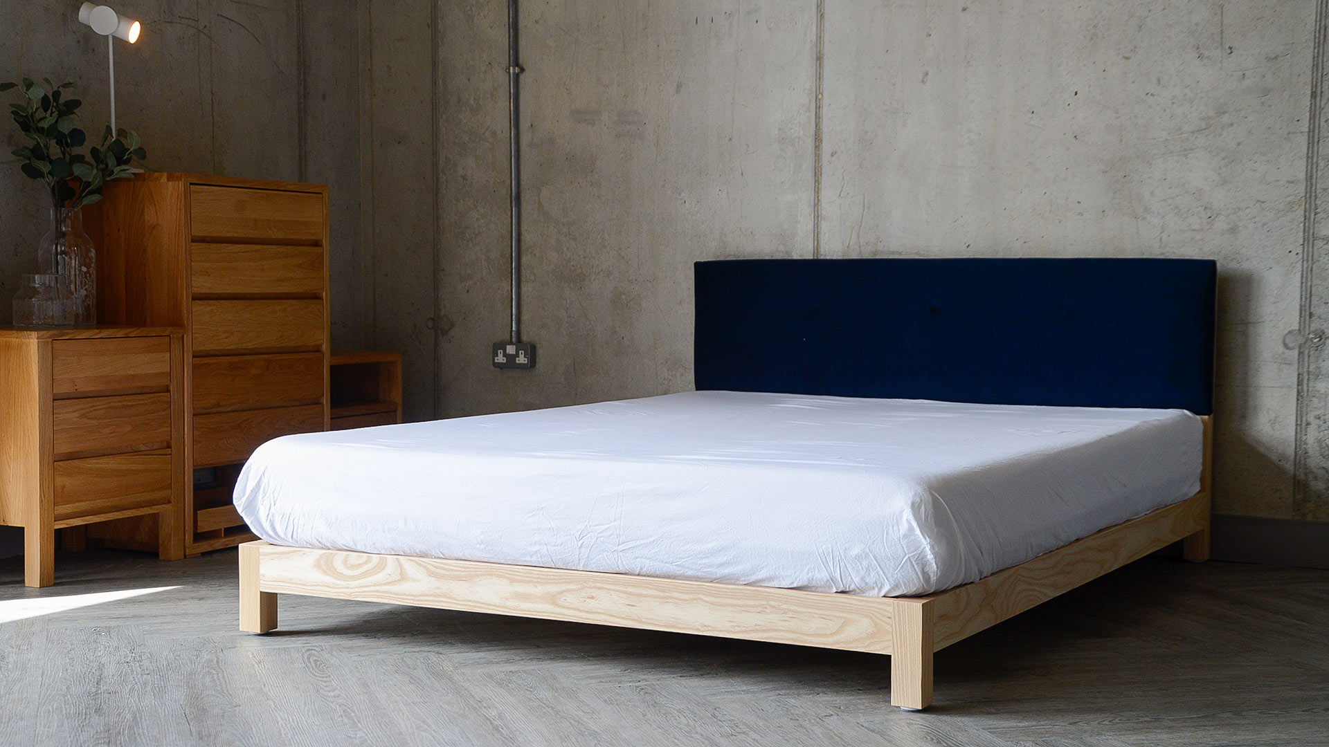 Characterised by its cosy headboard panel, the Iona is a sleek, upholstered low bed. This ex-display kingsize model is available on sale here in solid ash, upholstered in Eco Velvet in the colour Indigo.