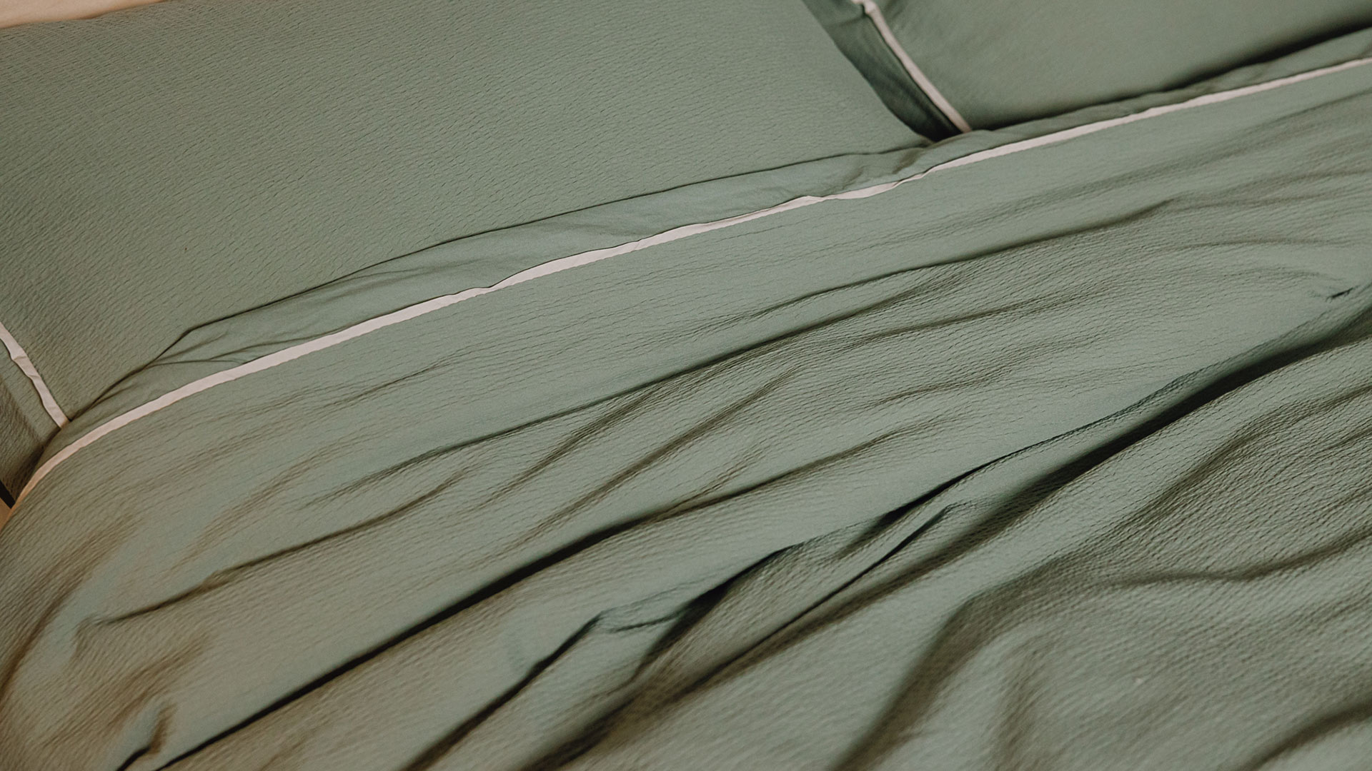 A natural and relaxed look, pure cotton bedding with a simple seersucker design, available in 2 timeless colour palettes: Stoney Beige or Soft Green.Each duvet set includes a duvet cover in your choice of size with 2x matching housewife pillowcases.