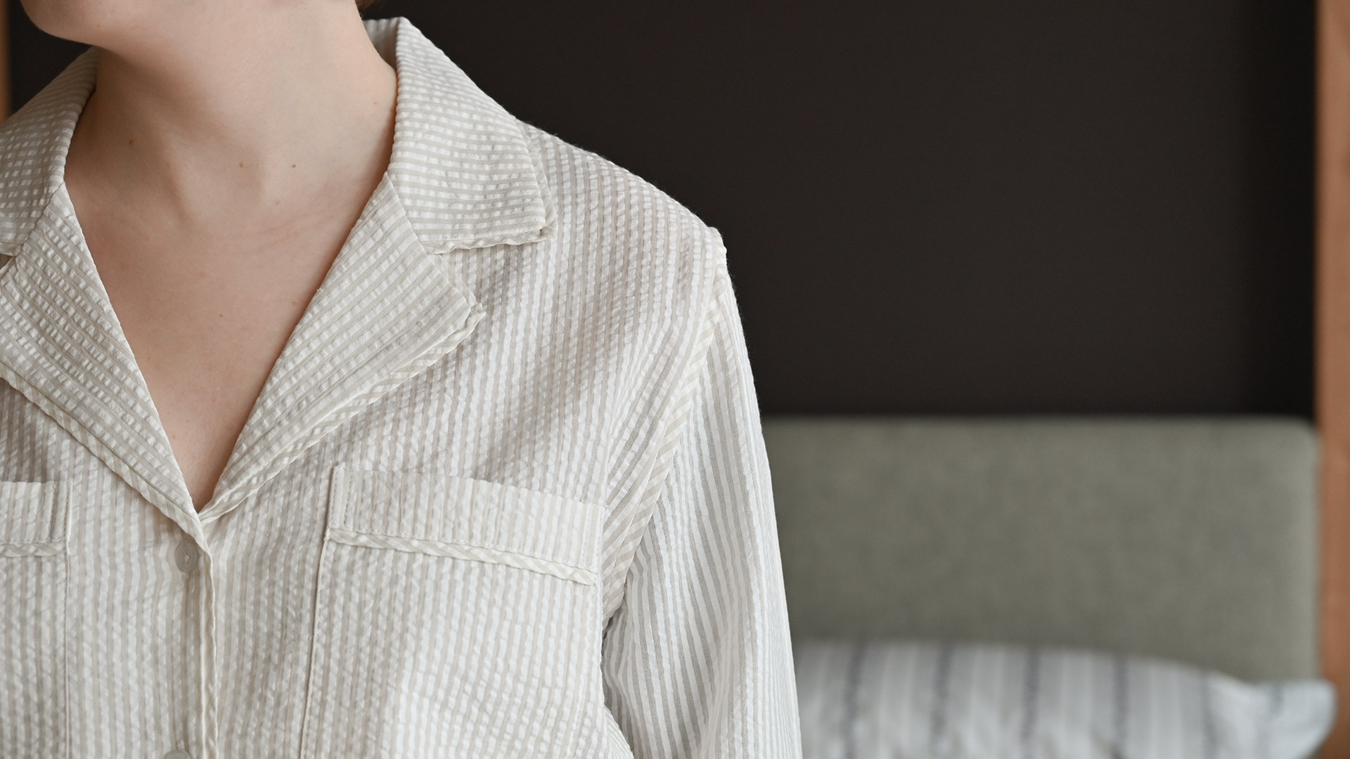 Soft cotton pyjamas featuring a soft, cosy beige stripe print. Made from 100% cotton with a gentle seersucker texture.