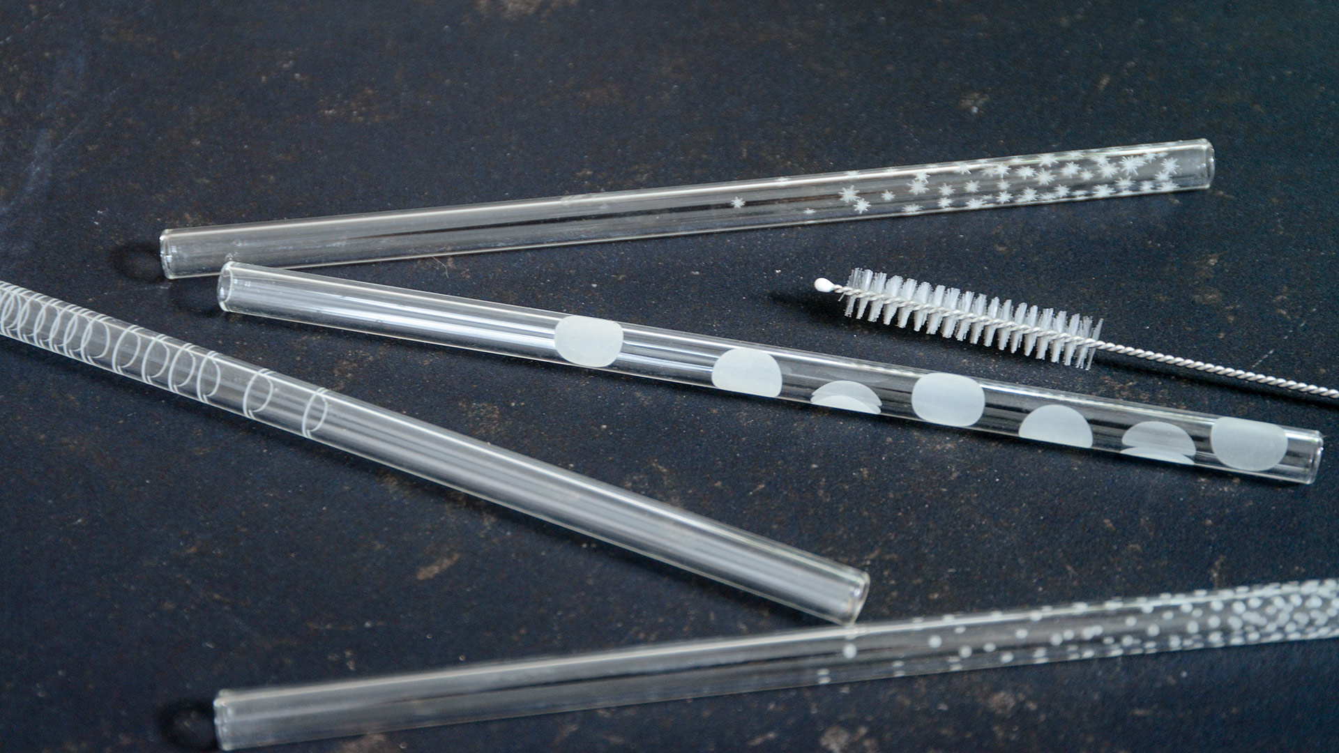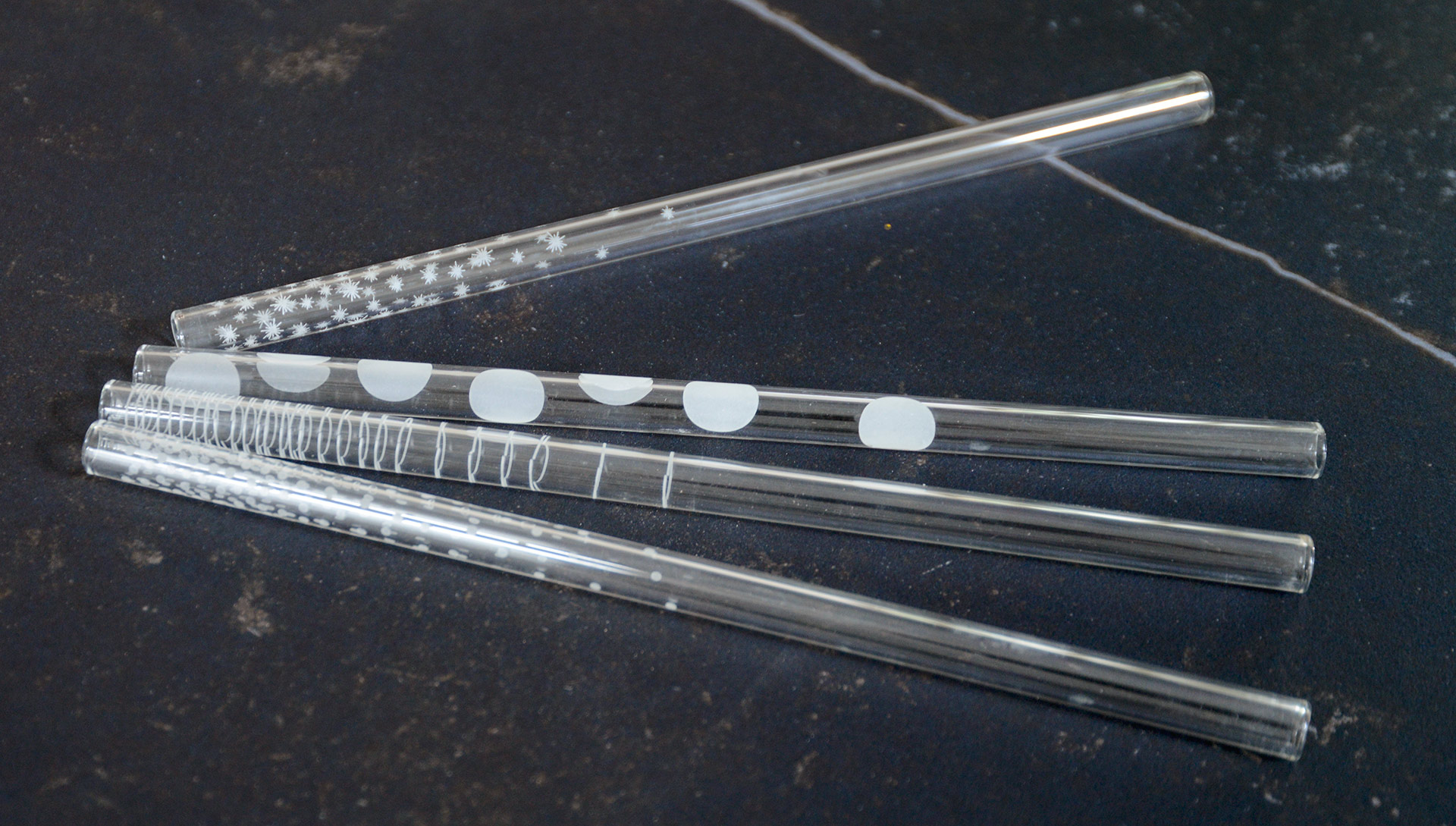 A stylish set of reusable glass straws. The glass straws each have a different pattern – large dots, small stars, stripes and small dots – so they also work well as a drink identifier!
