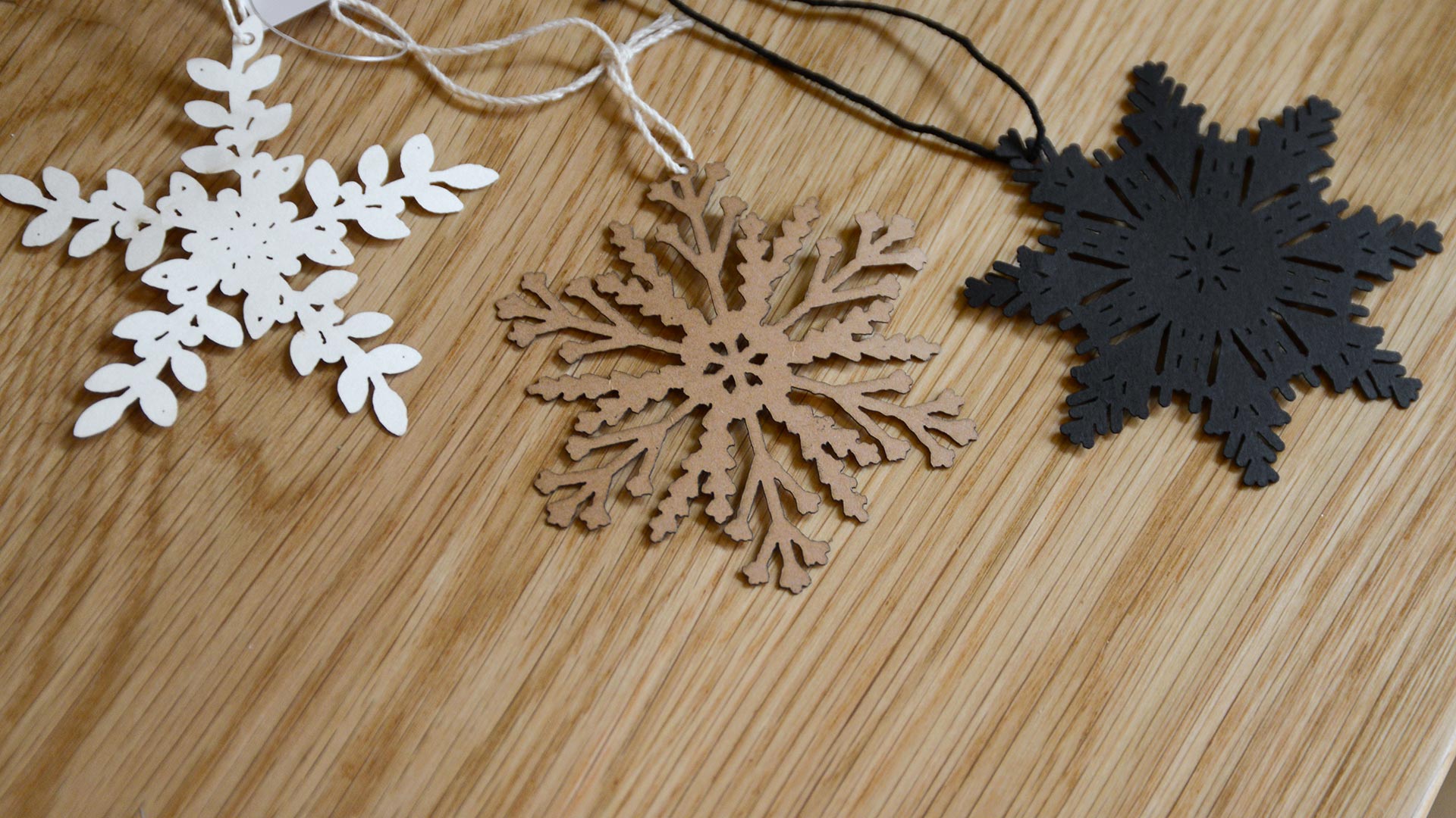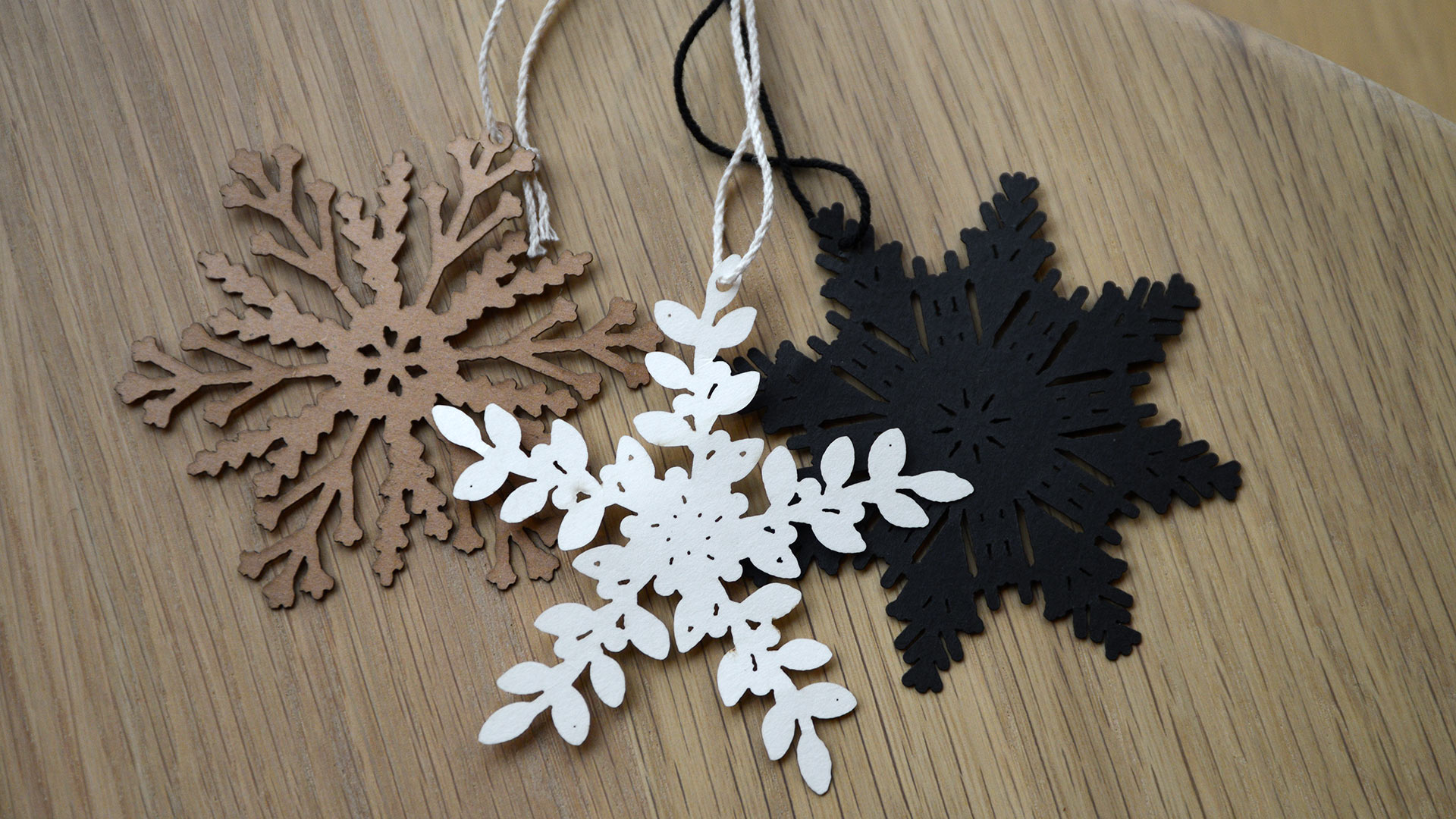 A set of 12 laser cut paper ‘snowflake’ decorations – delicate and detailed designs. Three patterns, four black snowflakes, four buff colour snowflakes and four ivory snowflakes.