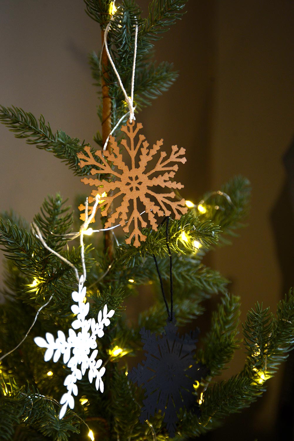 A set of laser cut paper snowflakes, designed to hang on the branches of your Christmas tree, or add a stylish touch to your gifts and gift tags. The set includes 12 laser cut snowflakes in black, ivory and buff colour card. Approximately 8cm dia. each – excluding the hangers. Ideal for adding a touch of festive spirit hanging on the Christmas tree, or added to gifts or cards. The perfect way to spread the cheer of the festive season.