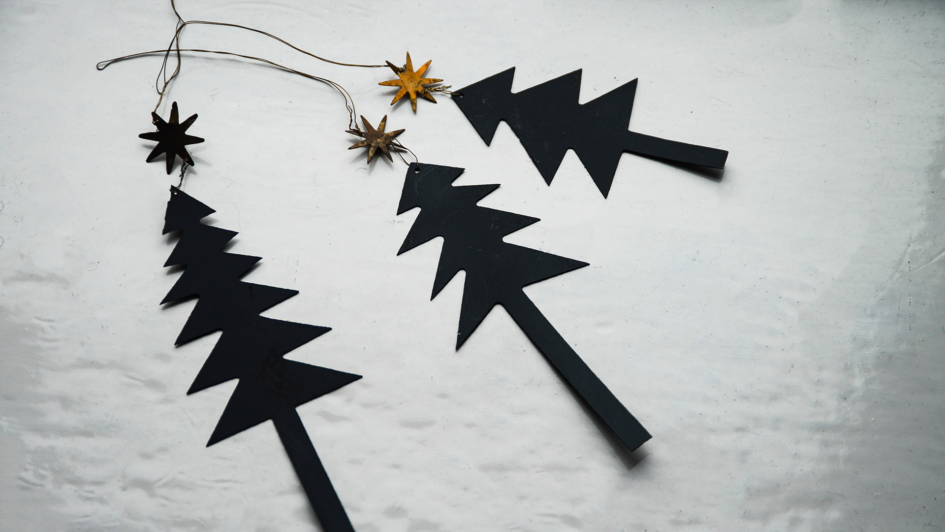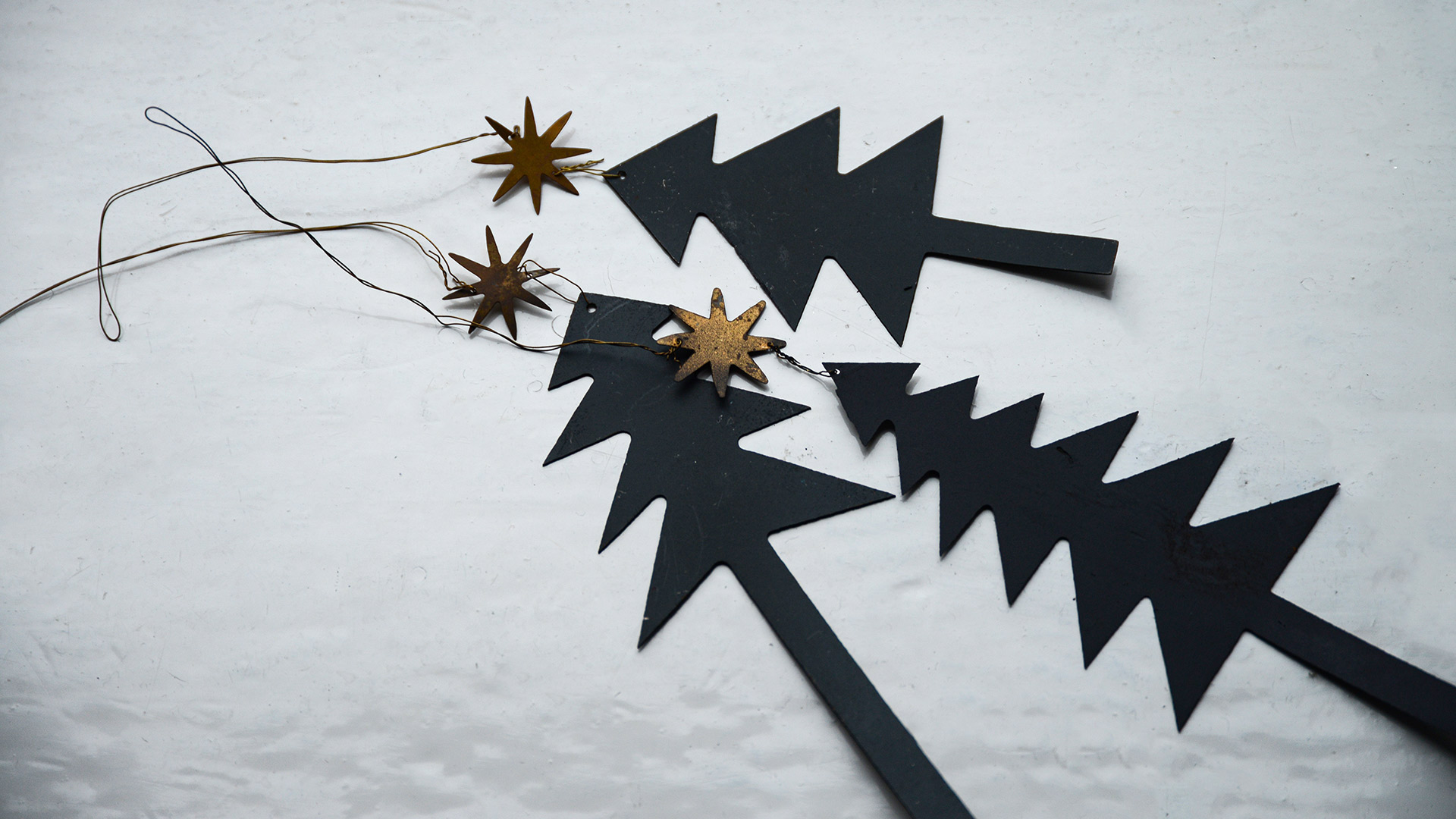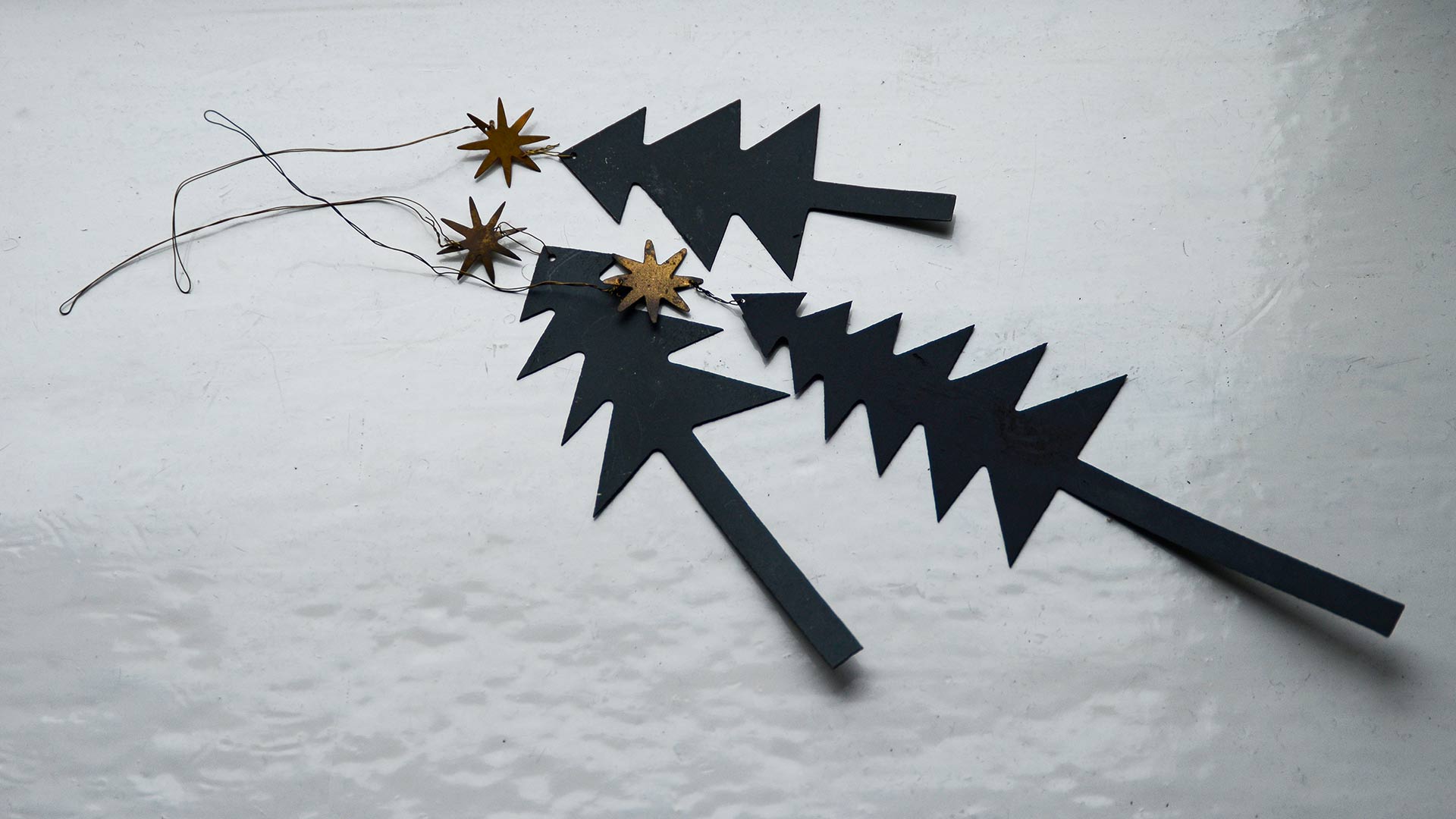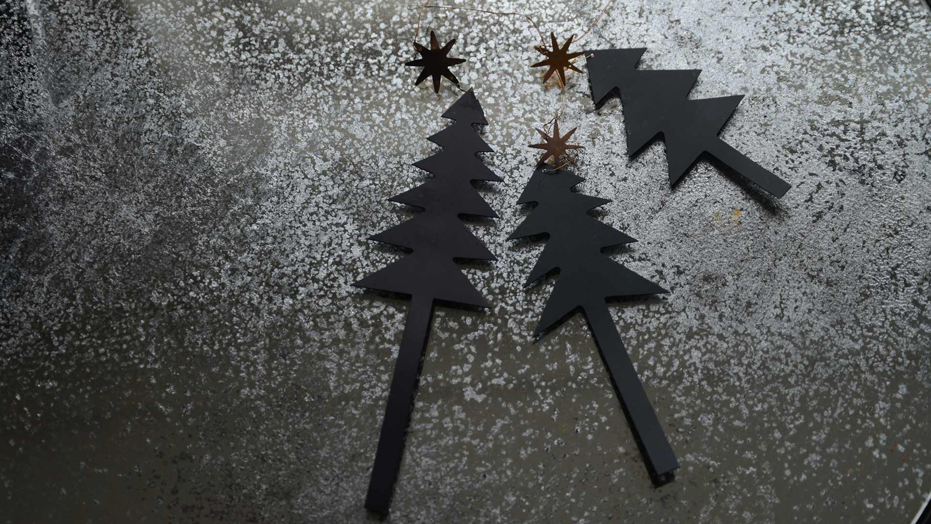 3x metal Christmas tree shapes painted black each with a brass colour star at the top. Complete with a wire hanger attached through a loop for easy hanging. 1 of each size – Tall (tree & star approximately 20cm), Medium (tree & star approximately 16cm), Short (tree & star approximately 12cm)