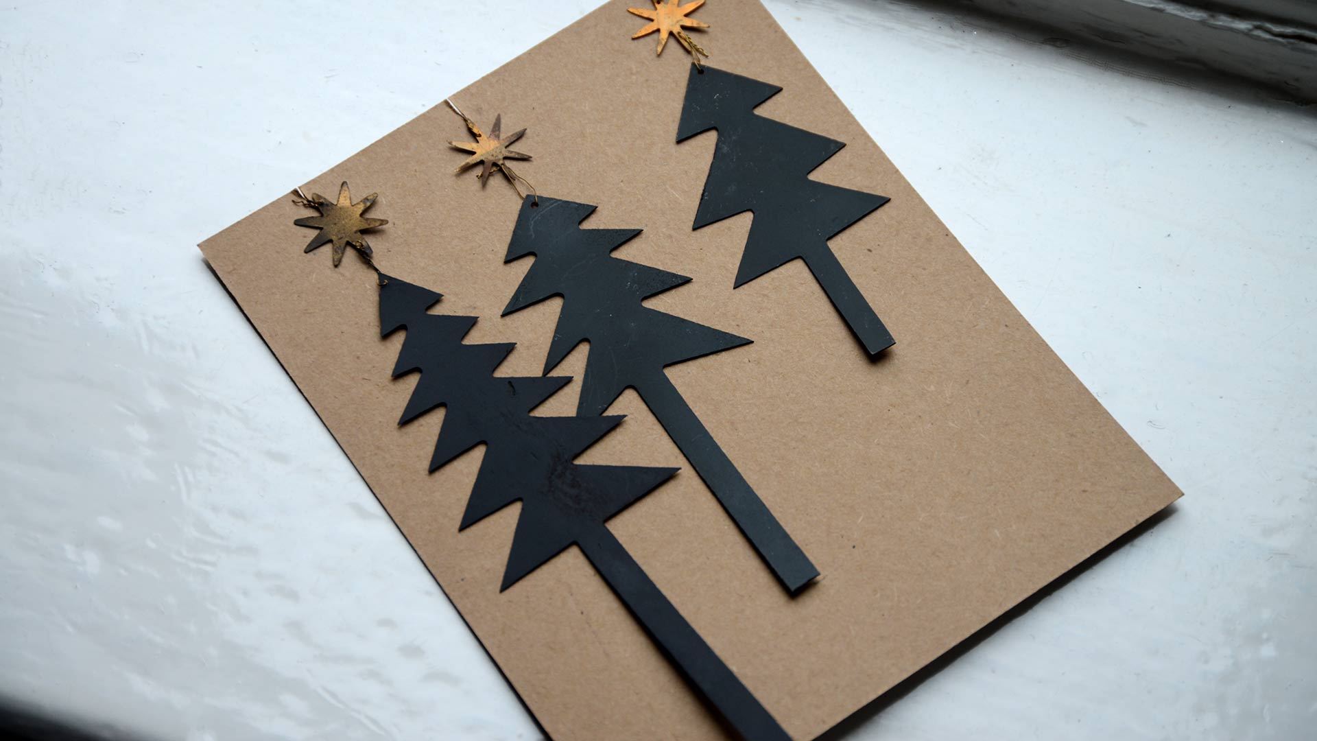A set of 3 Christmas tree shape, Christmas tree decorations. Black, flat, metal trees each with a brass colour star and hanger. Perfect for a contemporary, Nordic look.