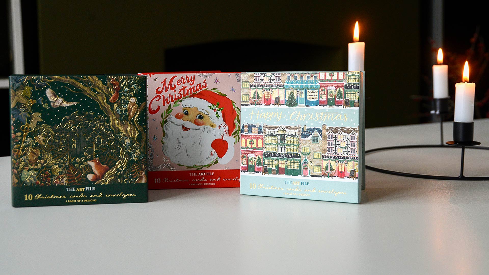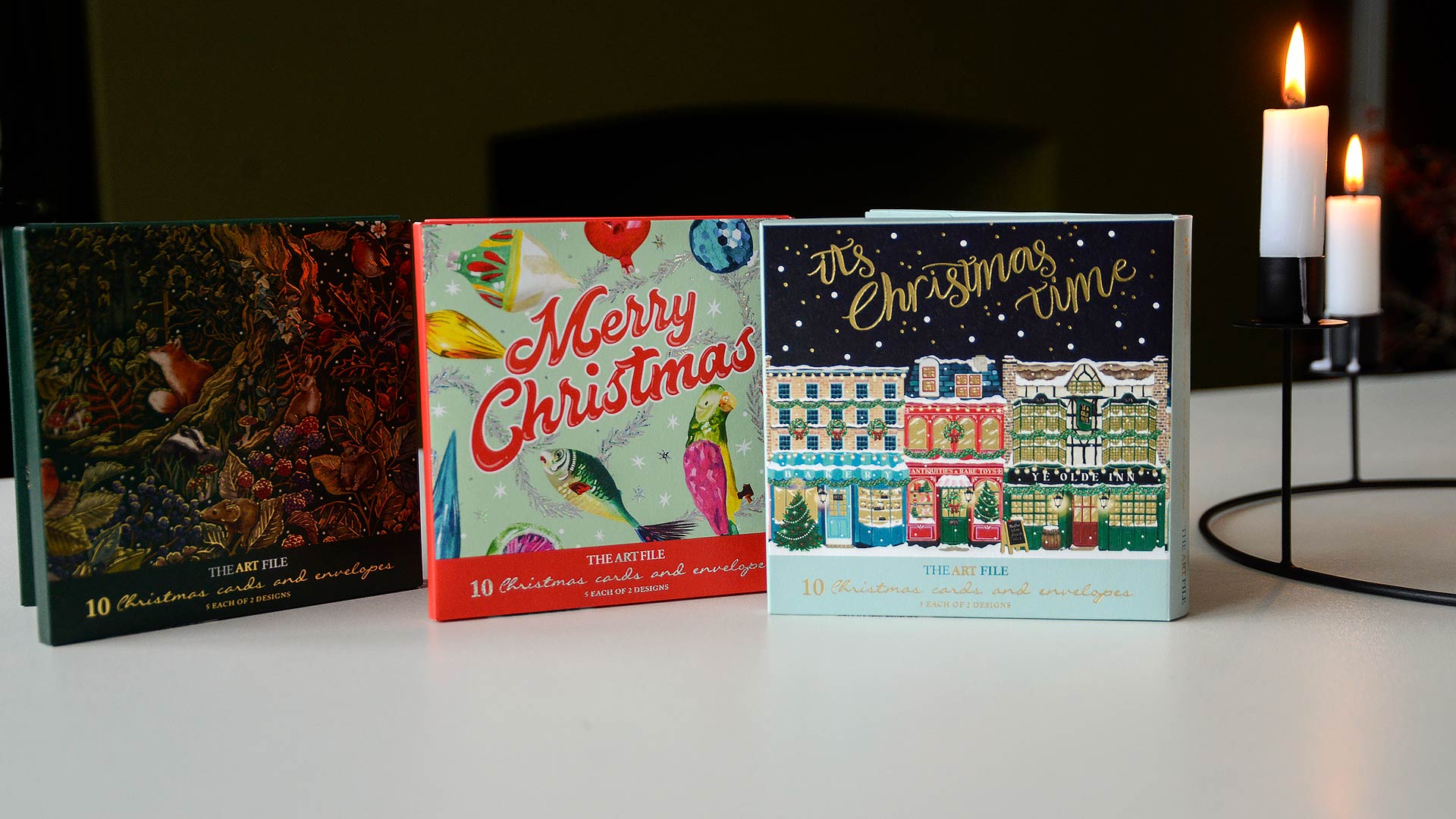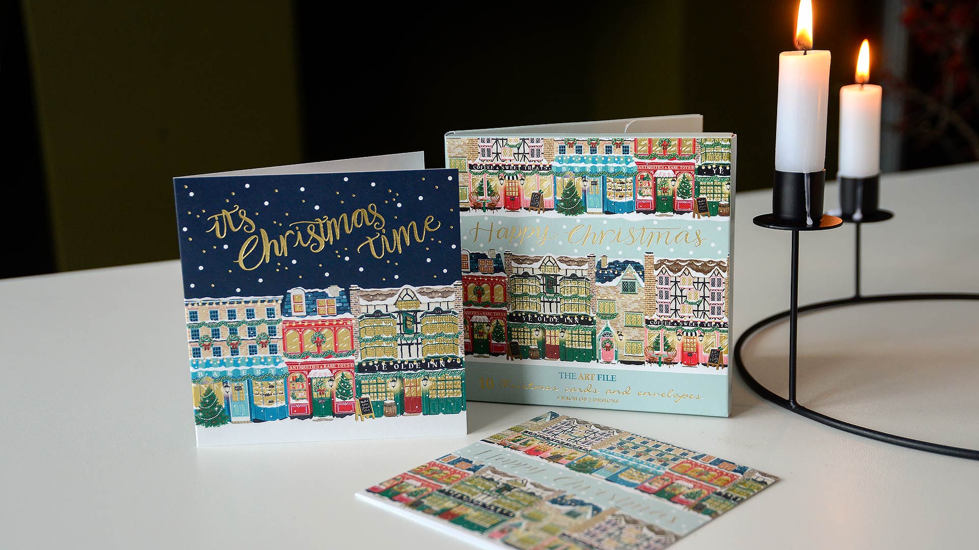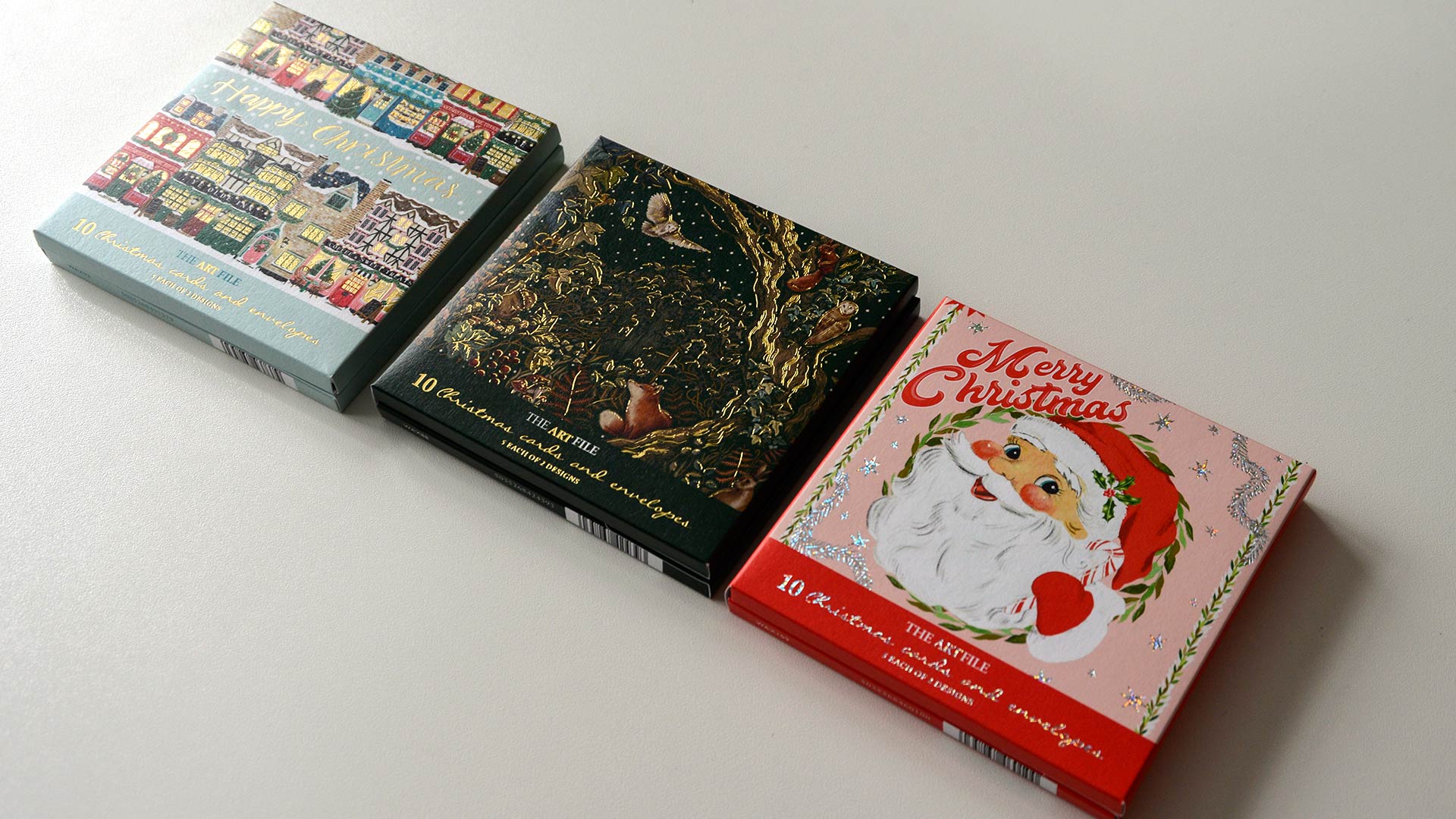 Multipack sets of 10 cards. Each set has two different designs. Choose from: Kitschmas, Festive Storefronts and Secret Garden.