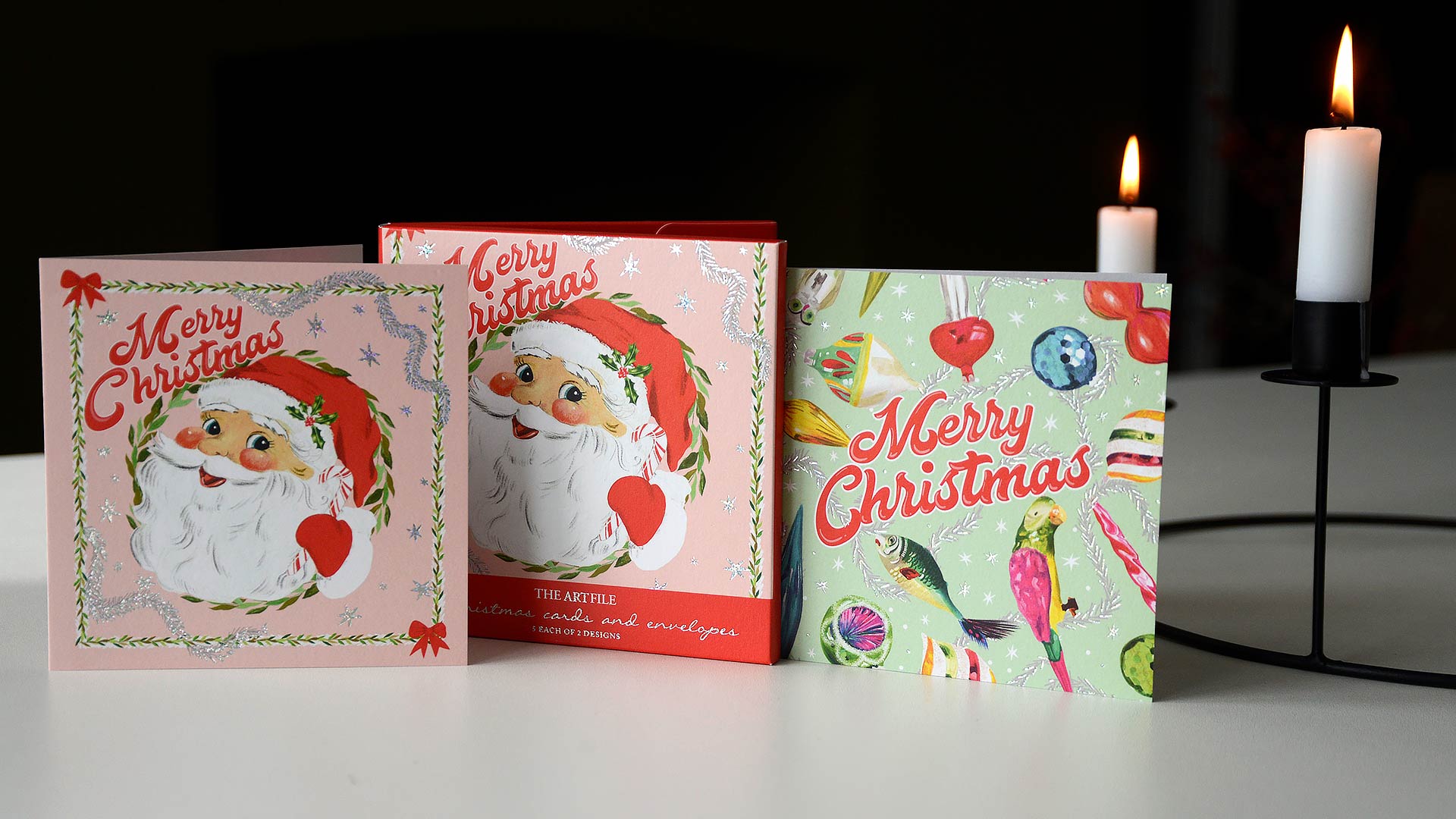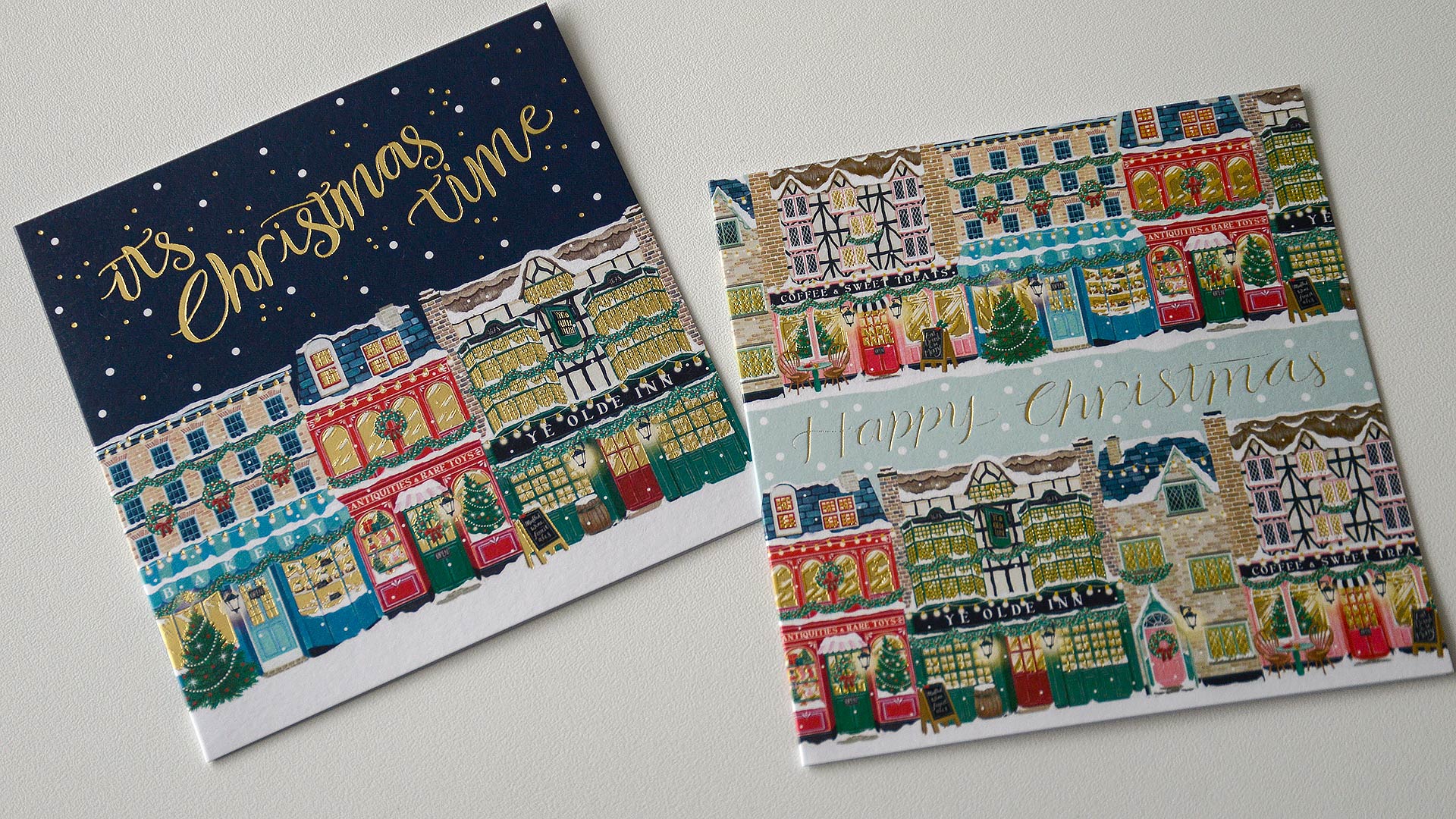 Kitschmas: 1st design – Jolly Santa against a pale pink background. 2nd design – Tinsel and Christmas decorations against a mint green background. Both cards feature a silver holographic foil. Messages read: Merry Christmas. Festive Storefronts: 1st design – Row of 3 shops in snowfall with a dark blue night-sky. Message reads: It’s Christmas Time. 2nd design – Repeating row of shops in snowfall across the top and bottom of the card. Message reads: Happy Christmas. Both designs have foiled gold detailing. Secret Garden: 1st design – Woodland creatures in front of an obscured shed door, surrounded by leaves, mushrooms and berries with a tree to the side. 2nd design – Woodland creatures in front of a tree, surrounded by holly, leaves, mushrooms, berries and flowers with an obscured shed door to the side. Neither card features a message on the outside. Both designs have the same deep olive background and foiled gold detailing.