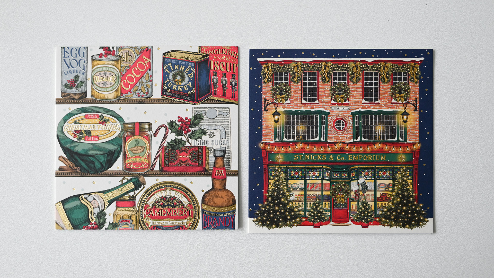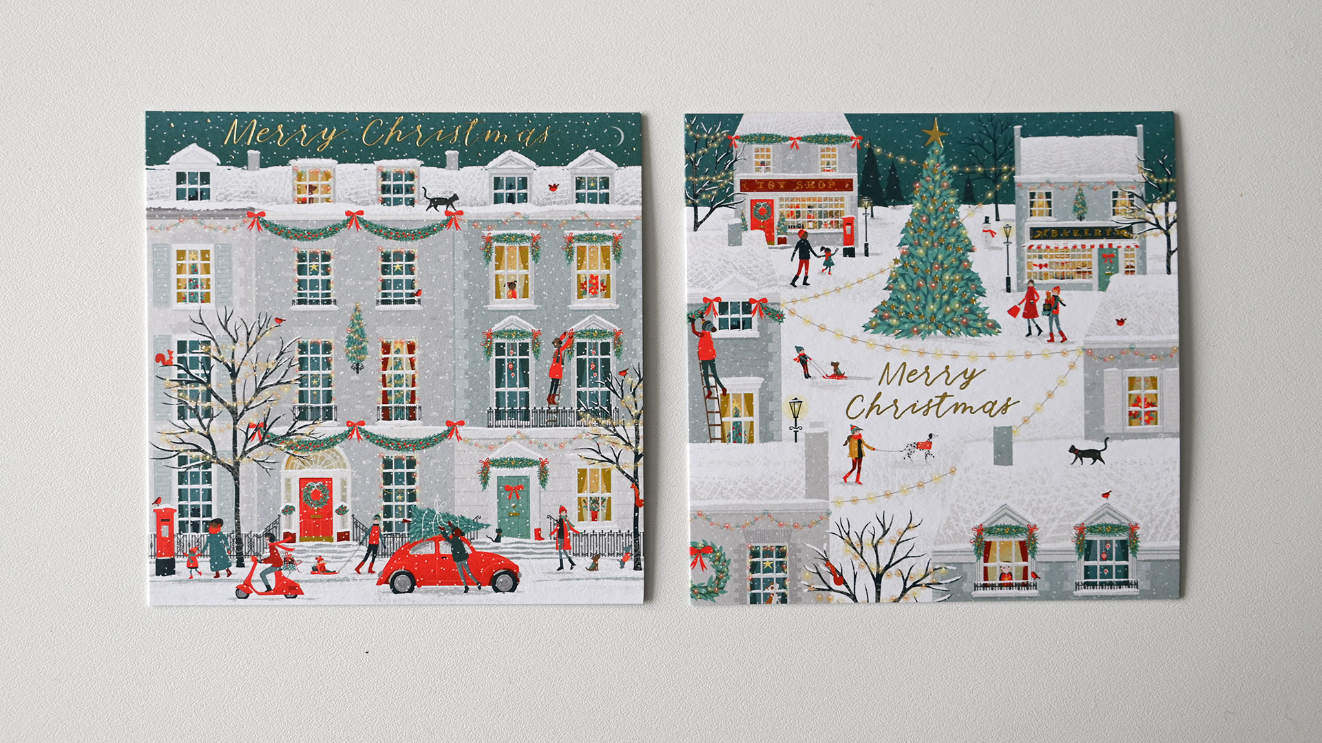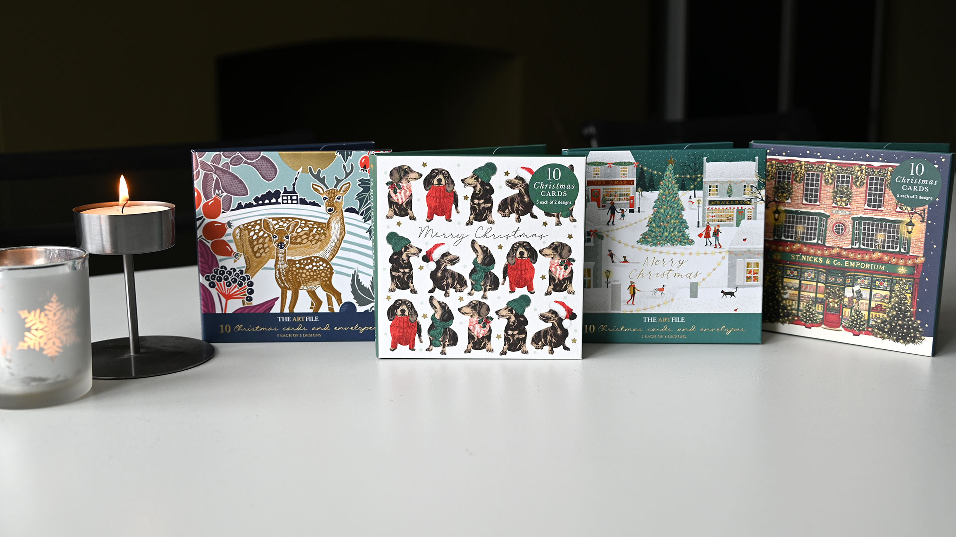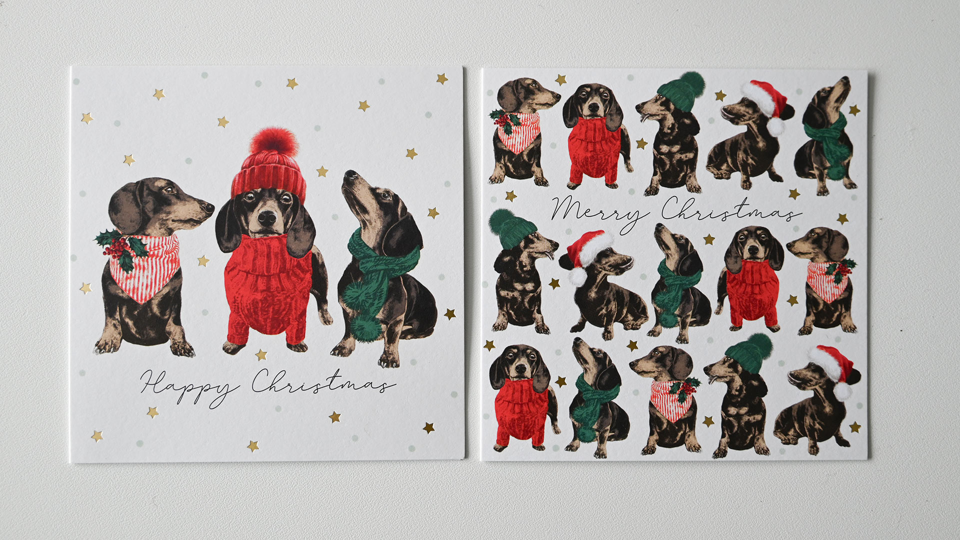Festive Pups: 1st design – Multiple sausage dogs in Christmas jumpers and hats. 2nd design – 3 sausage dogs in Christmas outfits. Both cards feature a gold foil star detail. Internal message: Merry Christmas & Happy New Year Christmas Scenes: 1st design – Christmas Tree with festive shops 2nd design – Row of edwardian houses with Christmas decoration Internal message reads: Merry Christmas & Happy New Year. Both designs have foiled gold detailing. Winter Country Scenes: 1st design – Woodland scene featuring deer – wood-cut look design 2nd design – Woodland scene featuring a hare – wood-cut look design Neither card features a message on the outside. Both designs have foiled gold detailing. Internal message reads: Merry Christmas & Happy New Year. Christmas Emporium: 1st design – Festive traditional shop with Christmas trees 2nd design – Rows of Classic Christmas treats Neither card features a message on the outside. Both designs have foiled gold detailing. Internal message reads: Merry Christmas & Happy New Year.