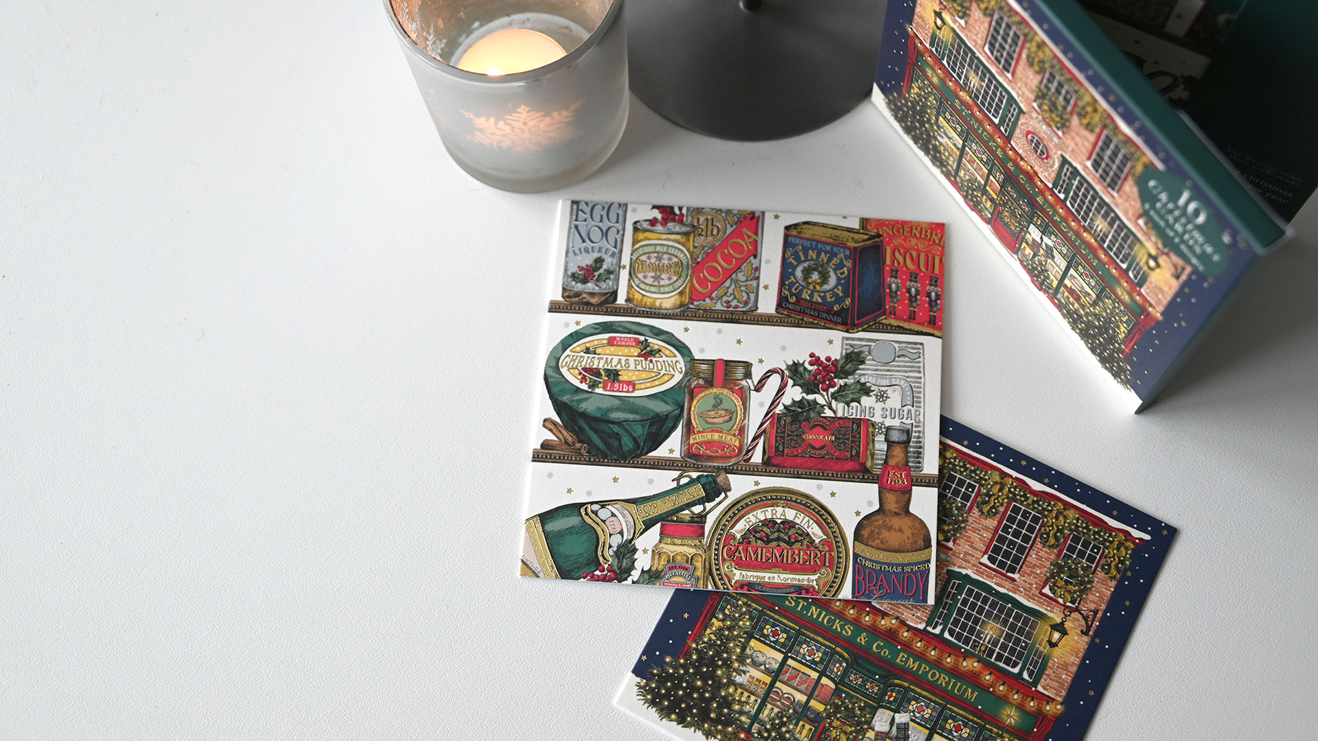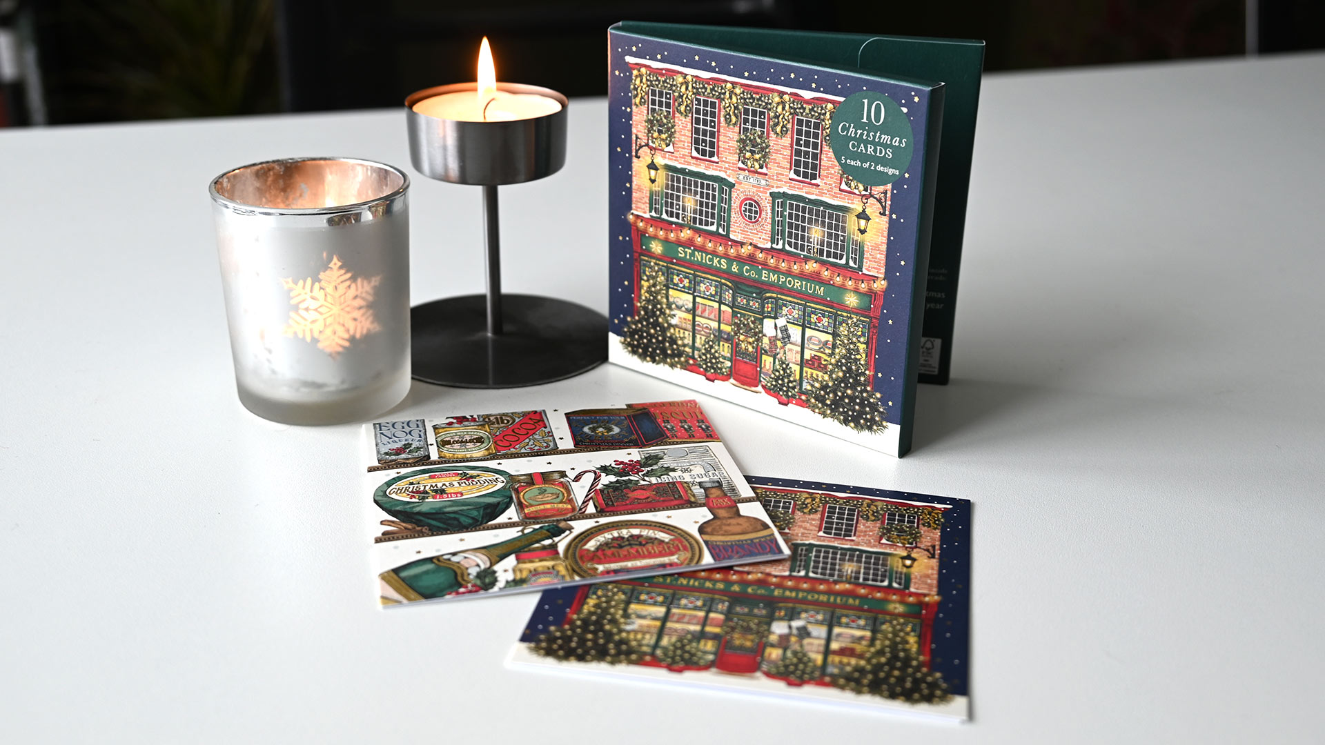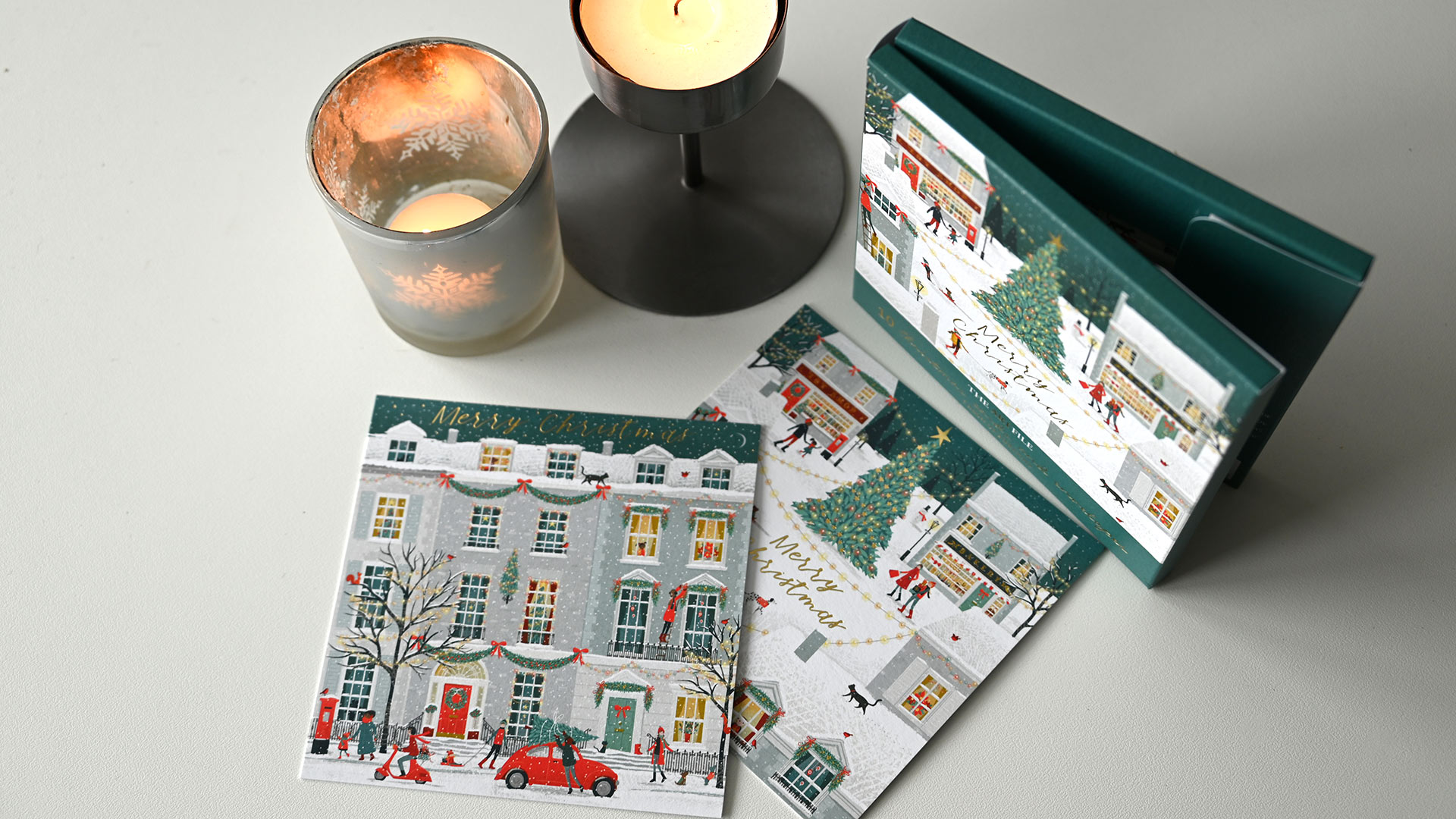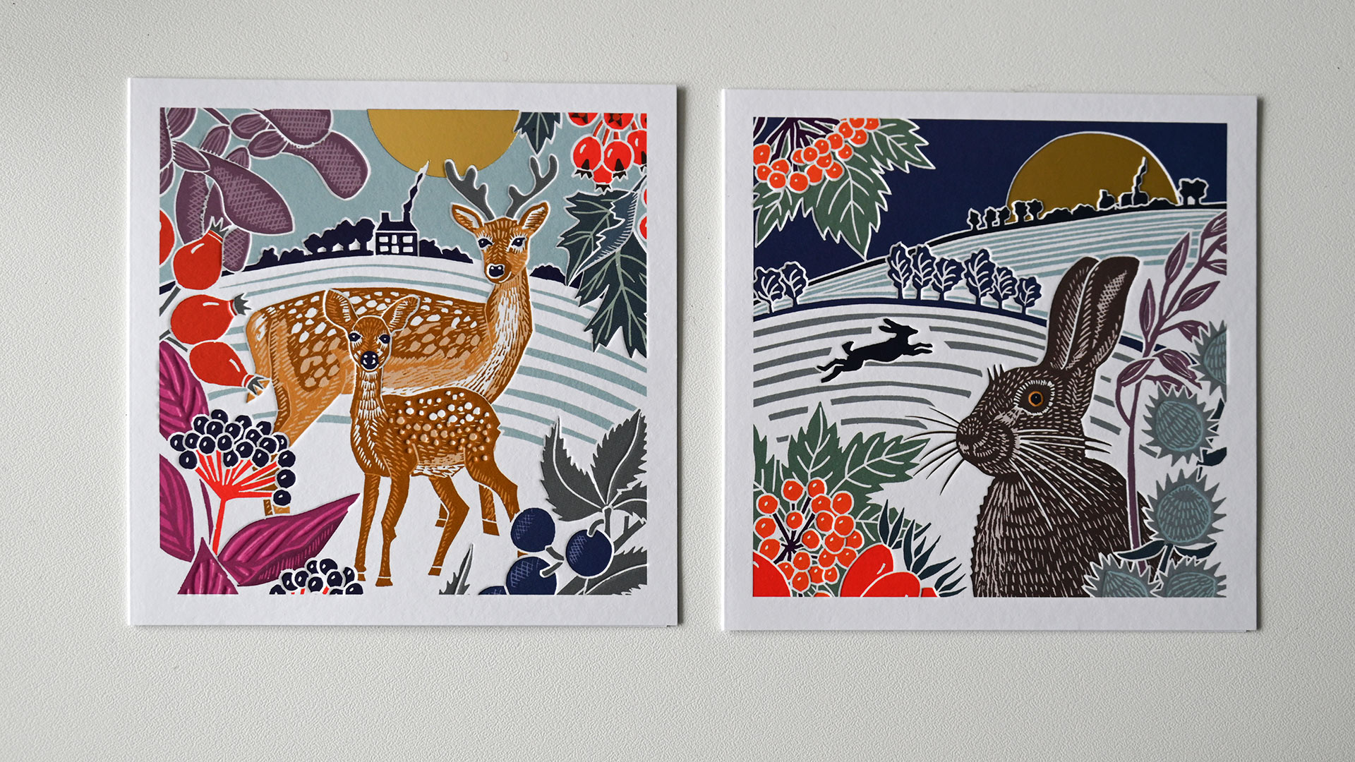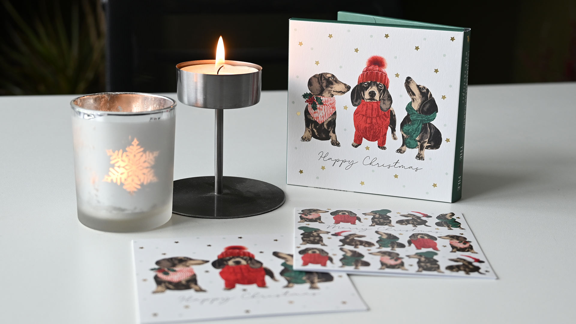 Festive Pups: 1st design – Multiple sausage dogs in Christmas jumpers and hats. 2nd design – 3 sausage dogs in Christmas outfits. Both cards feature a gold foil star detail. Internal message: Merry Christmas & Happy New Year Christmas Scenes: 1st design – Christmas Tree with festive shops 2nd design – Row of edwardian houses with Christmas decoration Internal message reads: Merry Christmas & Happy New Year. Both designs have foiled gold detailing. Winter Country Scenes: 1st design – Woodland scene featuring deer – wood-cut look design 2nd design – Woodland scene featuring a hare – wood-cut look design Neither card features a message on the outside. Both designs have foiled gold detailing. Internal message reads: Merry Christmas & Happy New Year. Christmas Emporium: 1st design – Festive traditional shop with Christmas trees 2nd design – Rows of Classic Christmas treats Neither card features a message on the outside. Both designs have foiled gold detailing. Internal message reads: Merry Christmas & Happy New Year.