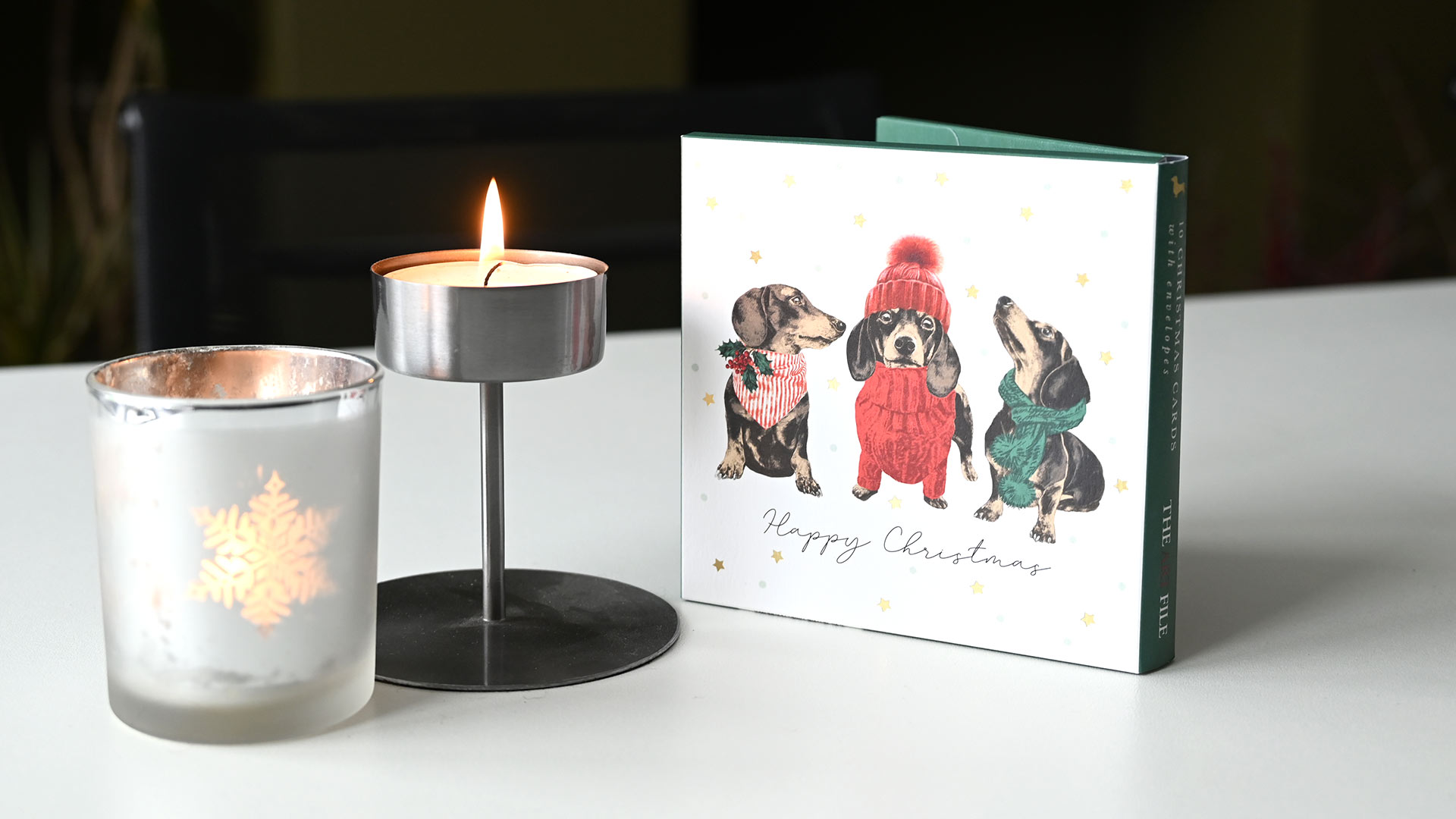 Festive Pups: 1st design – Multiple sausage dogs in Christmas jumpers and hats. 2nd design – 3 sausage dogs in Christmas outfits. Both cards feature a gold foil star detail. Internal message: Merry Christmas & Happy New Year Christmas Scenes: 1st design – Christmas Tree with festive shops 2nd design – Row of edwardian houses with Christmas decoration Internal message reads: Merry Christmas & Happy New Year. Both designs have foiled gold detailing. Winter Country Scenes: 1st design – Woodland scene featuring deer – wood-cut look design 2nd design – Woodland scene featuring a hare – wood-cut look design Neither card features a message on the outside. Both designs have foiled gold detailing. Internal message reads: Merry Christmas & Happy New Year. Christmas Emporium: 1st design – Festive traditional shop with Christmas trees 2nd design – Rows of Ccassic Christmas treats Neither card features a message on the outside. Both designs have foiled gold detailing. Internal message reads: Merry Christmas & Happy New Year.