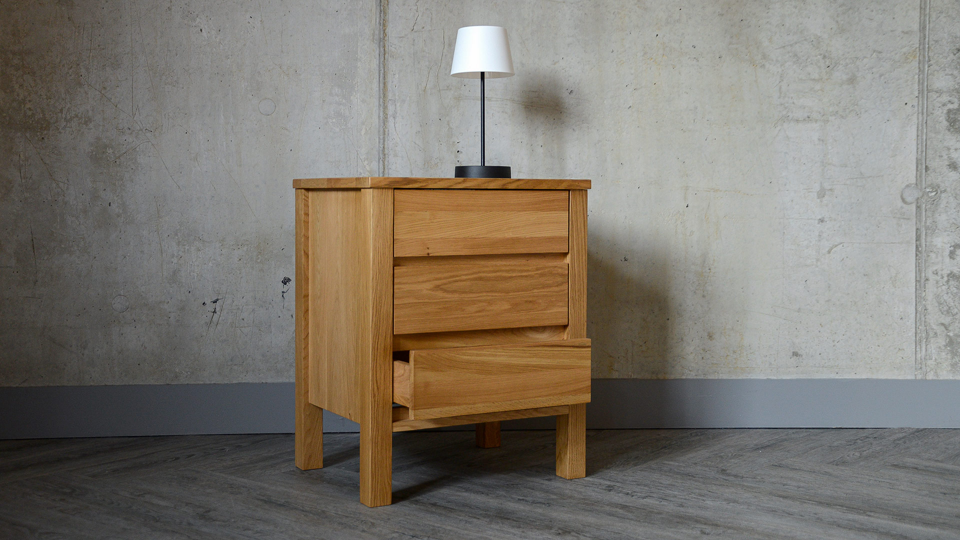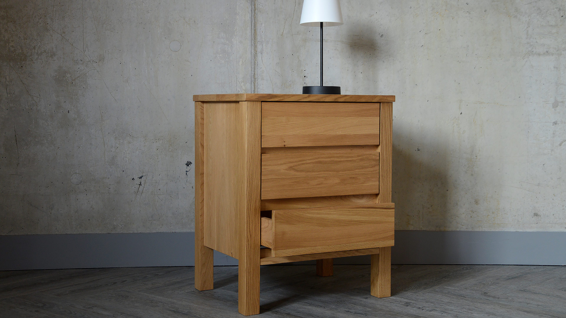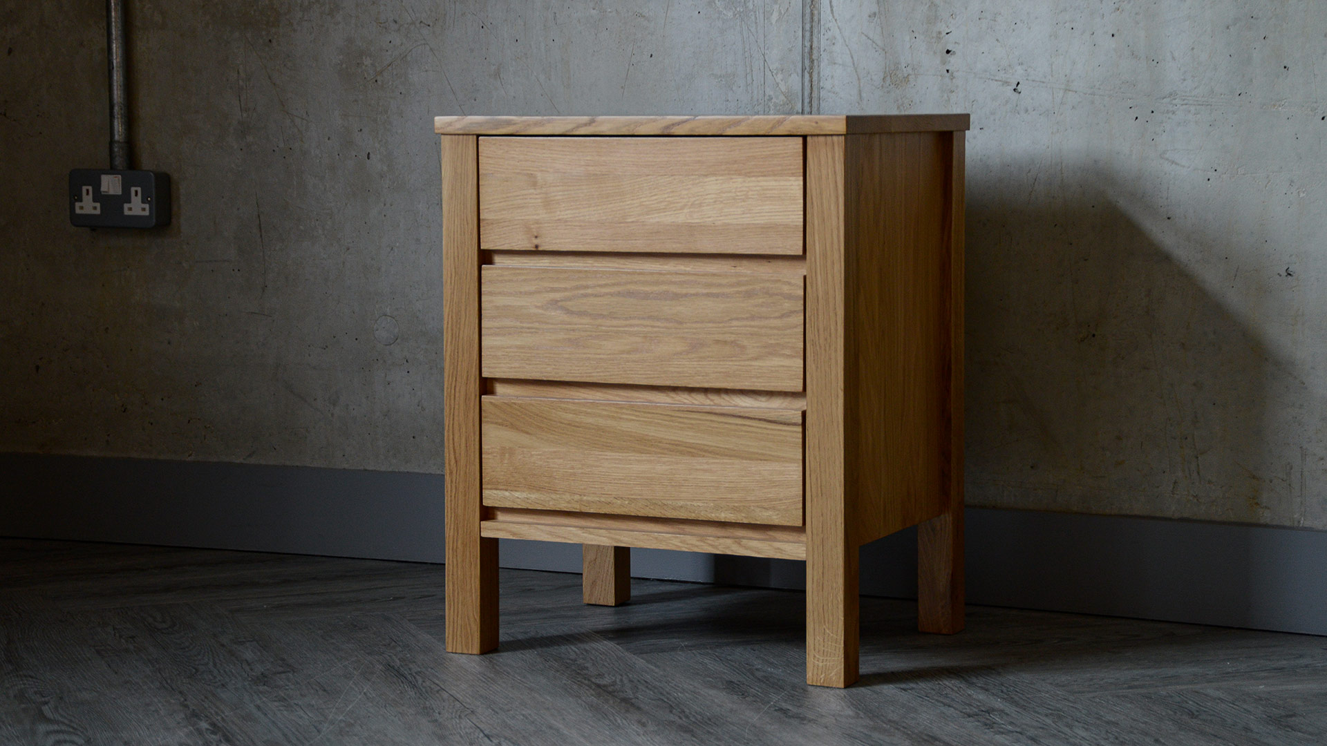 A solid, oak 3-drawer bedside chest, part of our Black Lotus Collection of solid oak and walnut bedroom furniture. The design of this chest is inspired by the clean lines of Shaker style, but given a modern twist. Available here in solid oak, this contemporary chest of drawers has a coating of clear lacquer with a slight sheen.