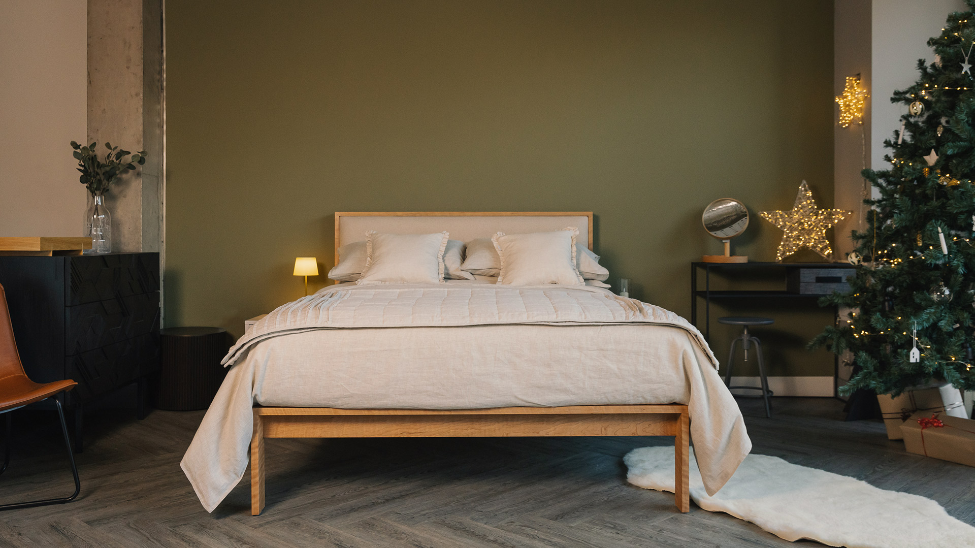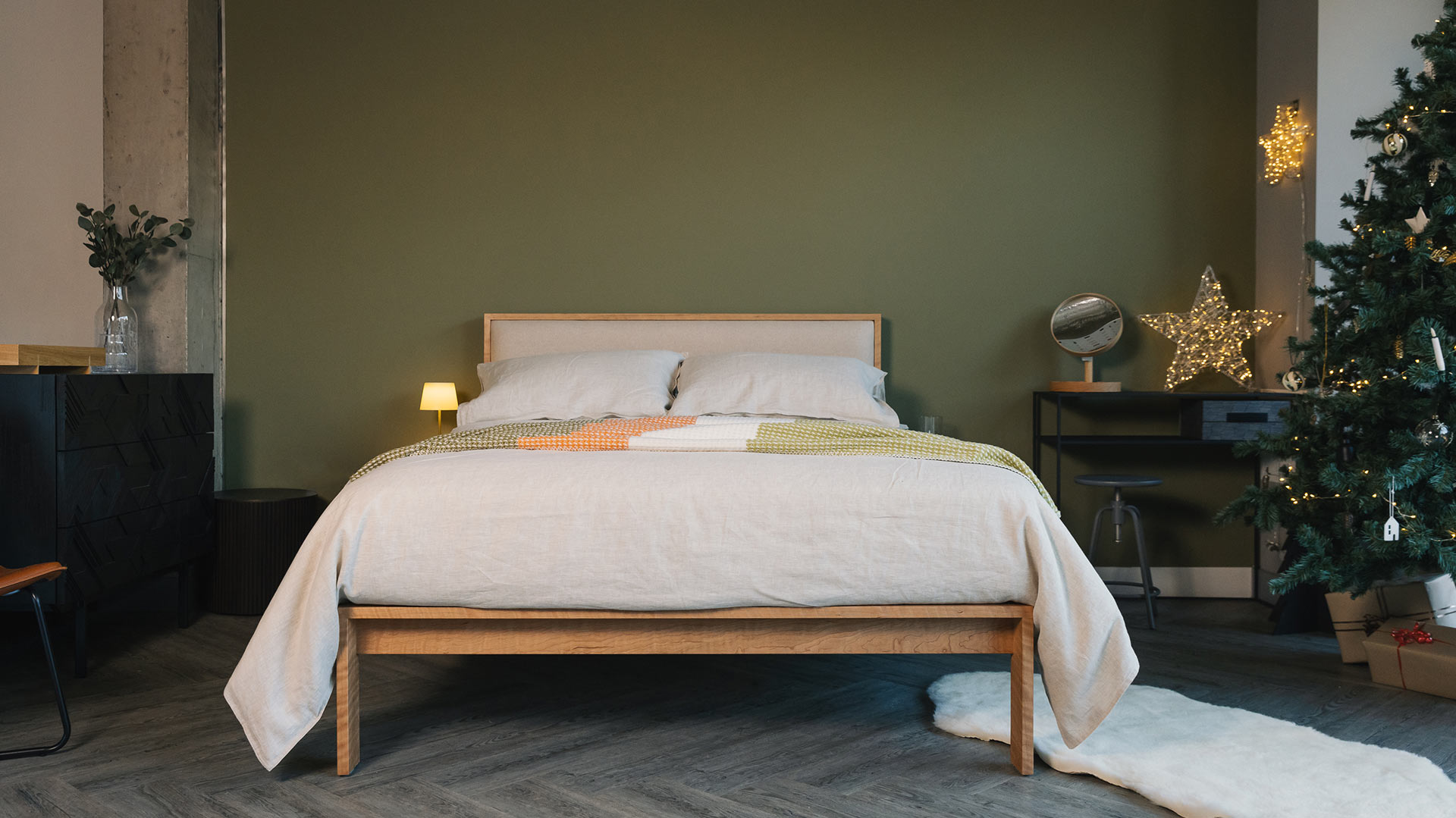 The Shetland is a modern classic. It is available here with a padded headboard, upholstered in our standard fabric options. The handcrafted frame is available to order in your choice of hardwood timber. Take a look at our timbers page for more information and to order timber samples.
