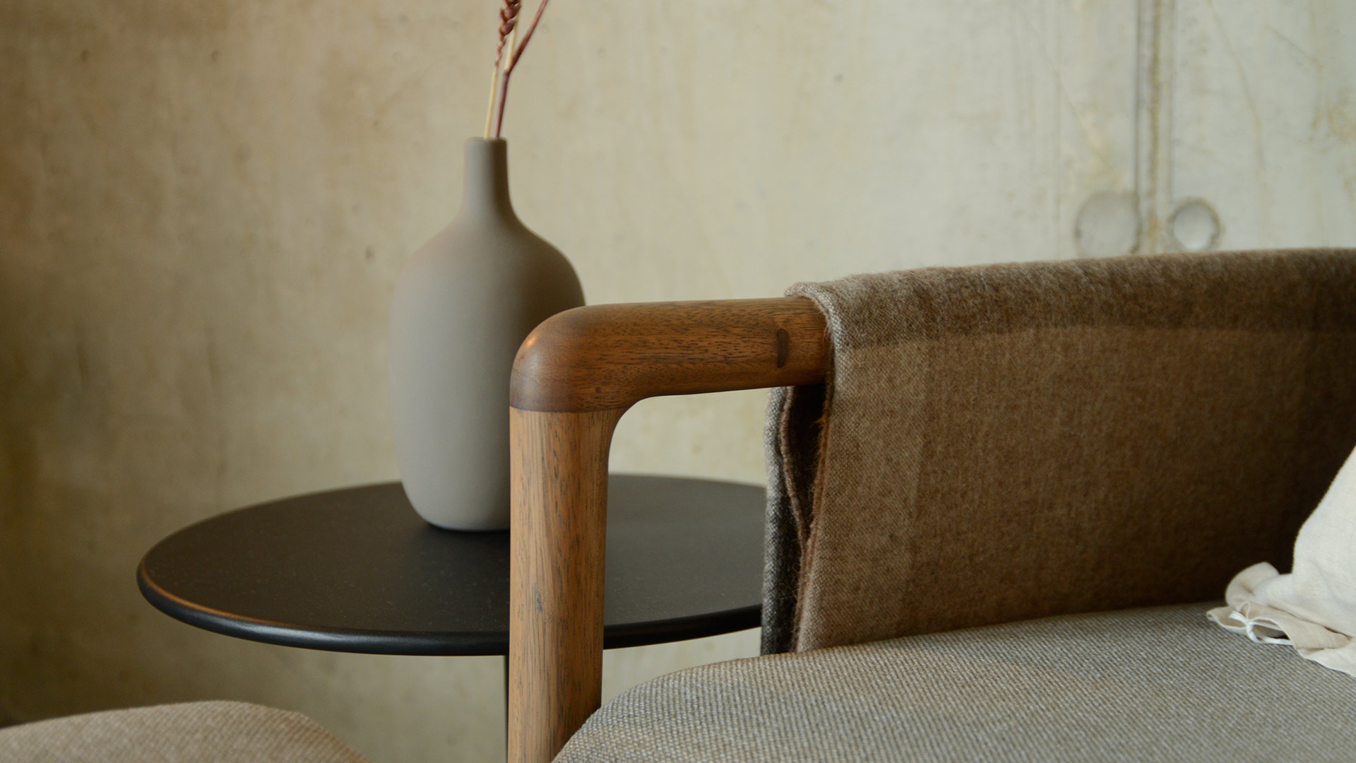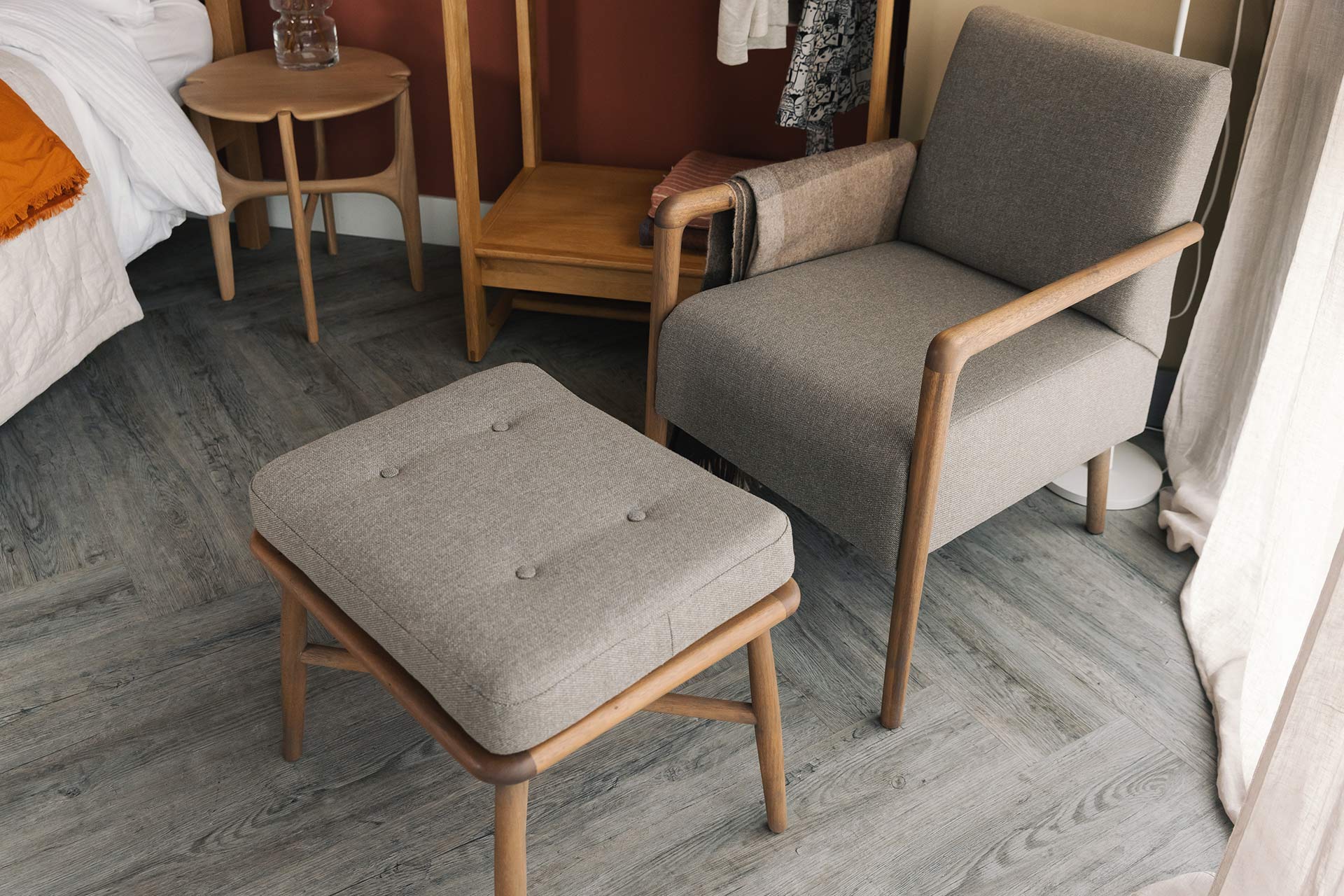 Materials: Natural hardwood with Grey Stained Oil finish Upholstery Fabric: ‘Terrain’ Mink. See ‘fabric options’ tab for more information.