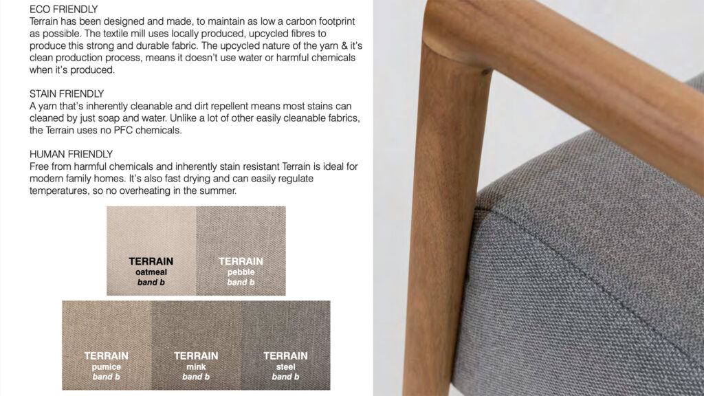 The Shoreditch Armchair and Footstool are available and pictured on this page in ‘Terrain – Mink’. The manufacturer does offer more colour-way options in the ‘Terrain’ fabric, pictured alongside ‘Mink’ below.