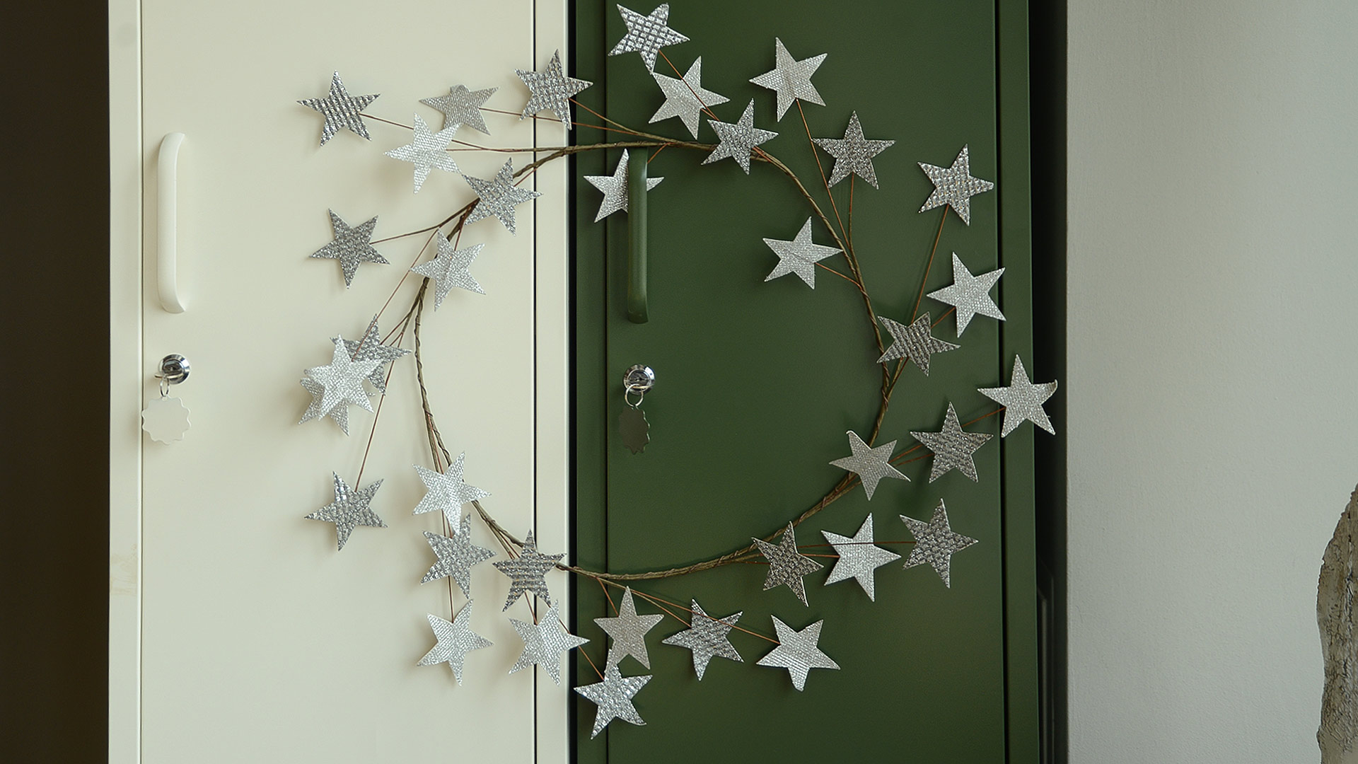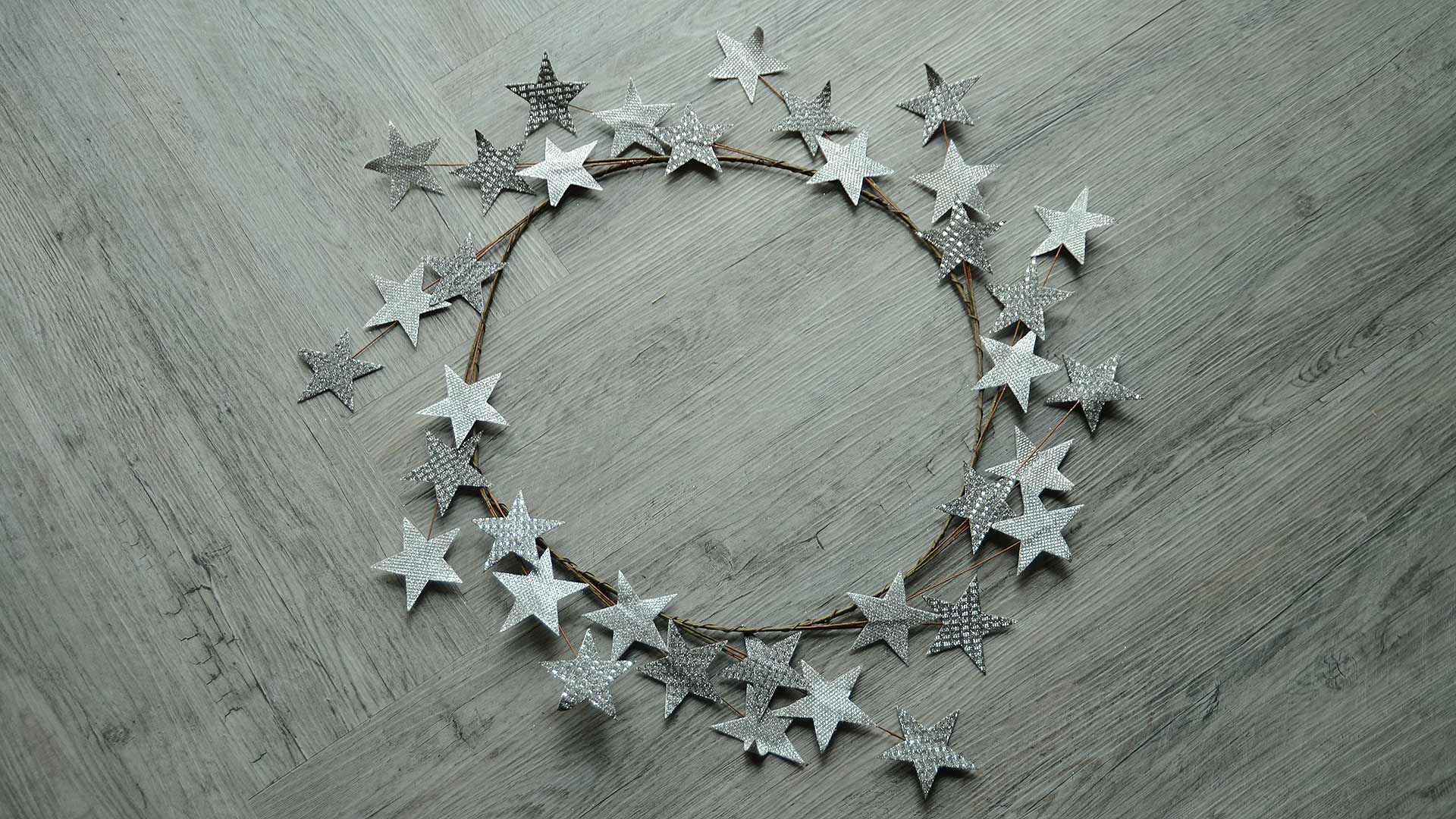 A stylish Christmas wreath incorporating soft, adjustable silver stars in a variety of sparkly silver fabrics.
