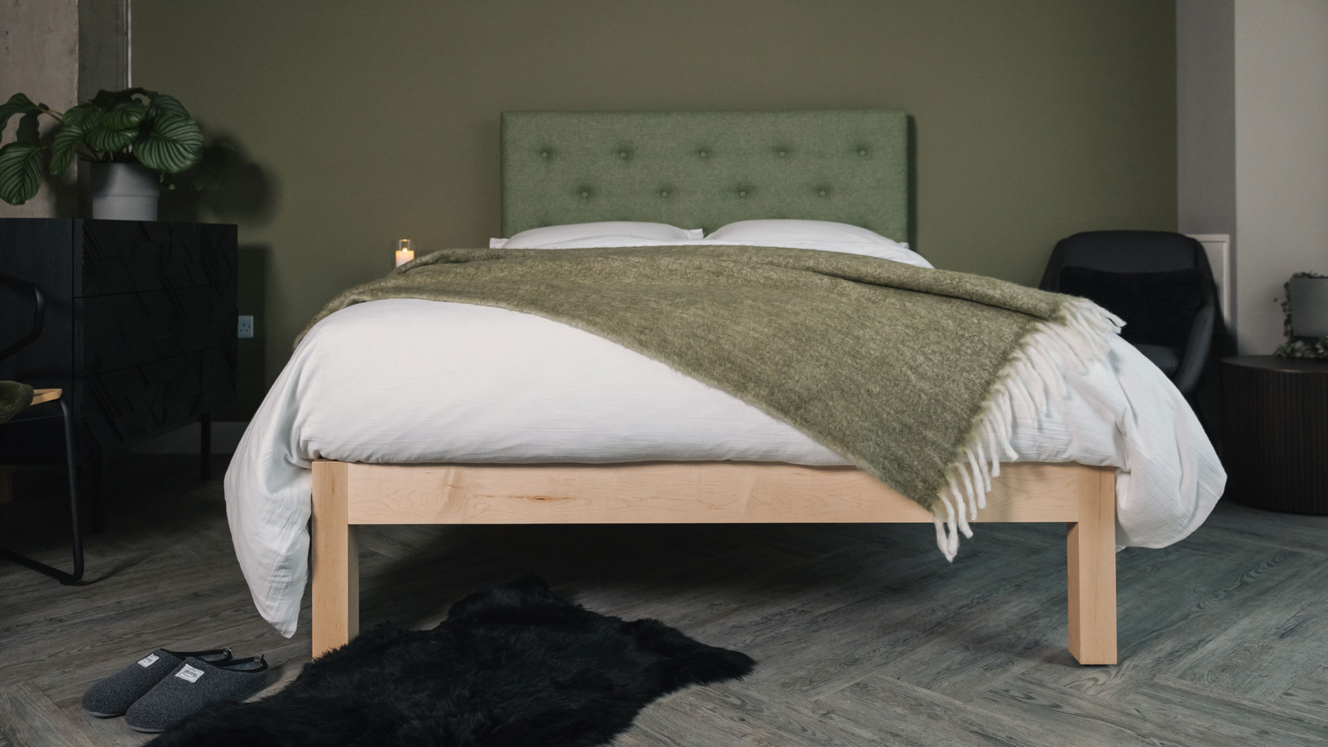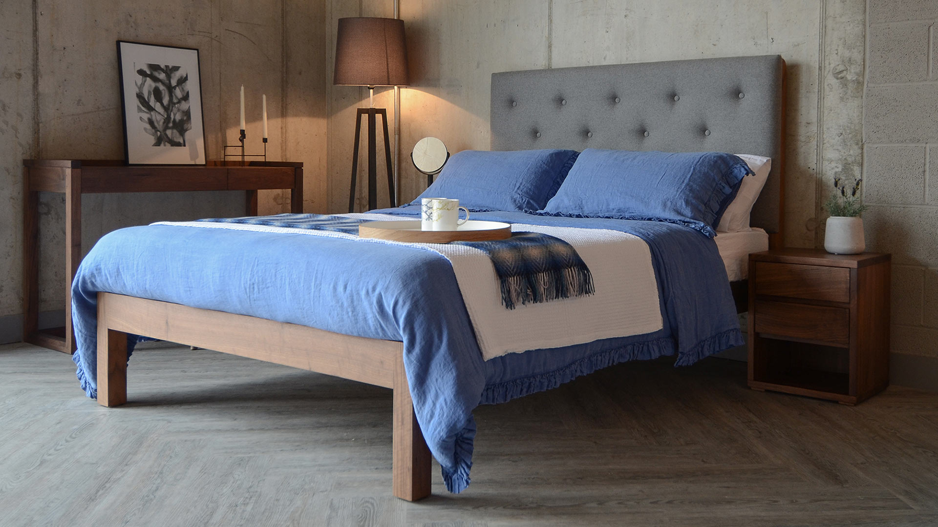 The Skye is a modern, luxurious bed available in a range of timbers. Defined by its tall, elegant headboard panel, you can select from a range of fabrics for the upholstery. Here, the Skye is available to order with our premium, pure wool upholstery option; Parquet. Pictured here crafted from solid walnut, with a buttoned headboard. The bed frame is available in a range of hardwoods and your choice of fabric colour.