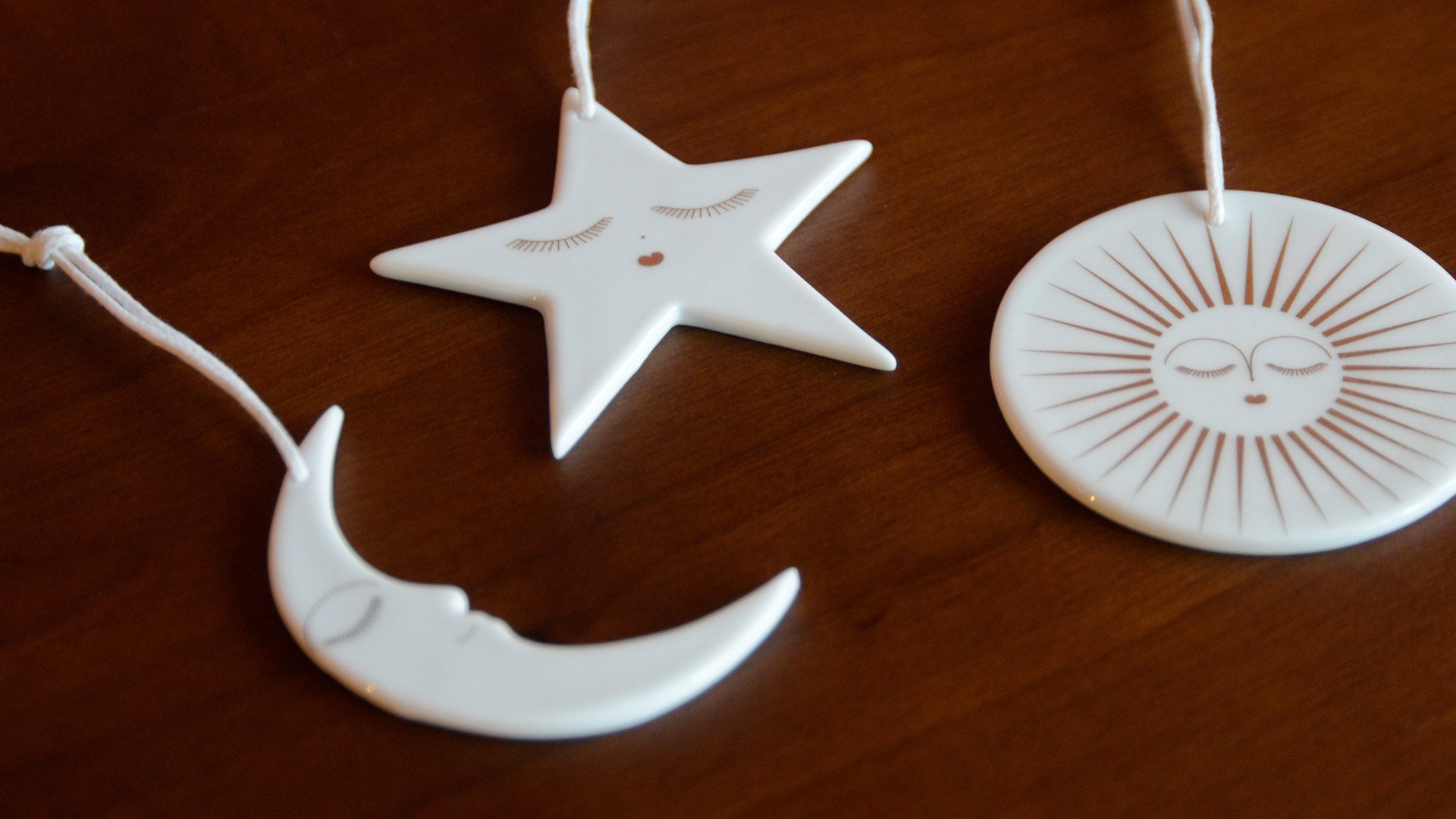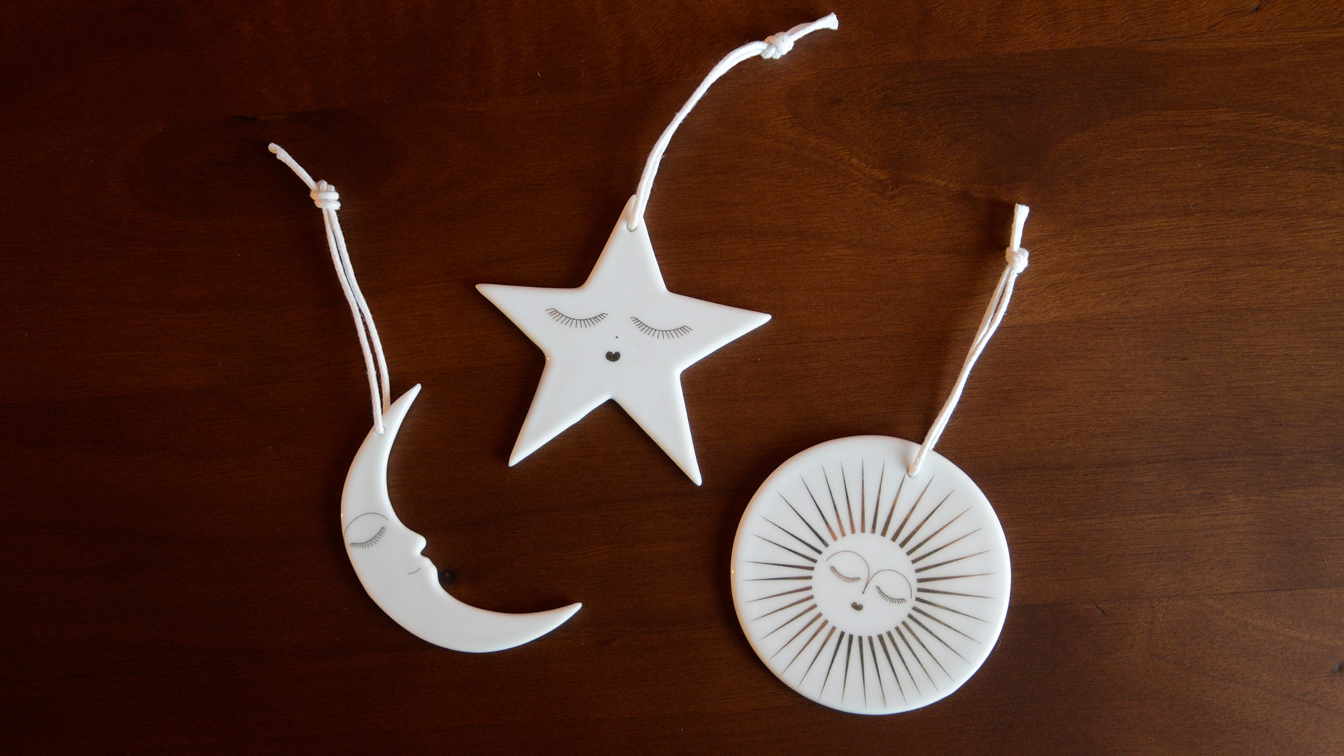 Delicate and whimsical sleepy celestial characters to decorate your Christmas tree – or wherever you’d like to hang them! Handcrafted from pure white porcelain, set includes 3x shaped decorations.
