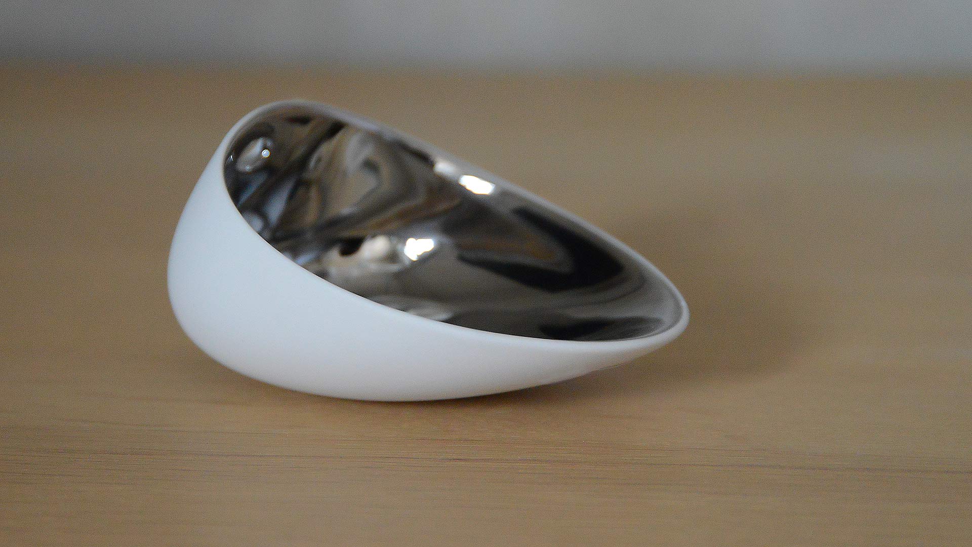 A stunning, small porcelain bowl – the outer is in matte ivory, the inner finish is in a glossy silver colour. This lovely bowl is food-safe so it can be used for serving dips or nuts, however it’s also lovely on a bedside or hall table as a place to keep jewellery or keys.