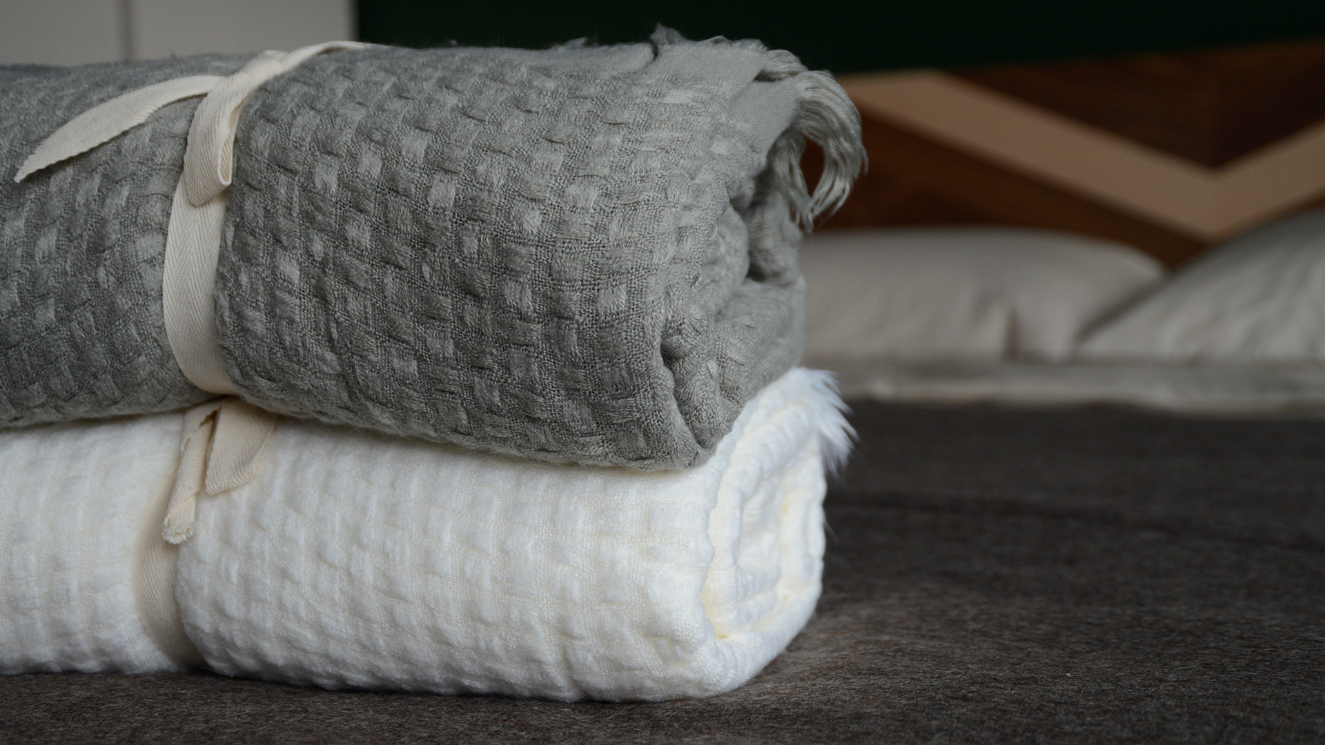 Soft and light basket weave throws. Available in soft Ivory or Moss Grey.