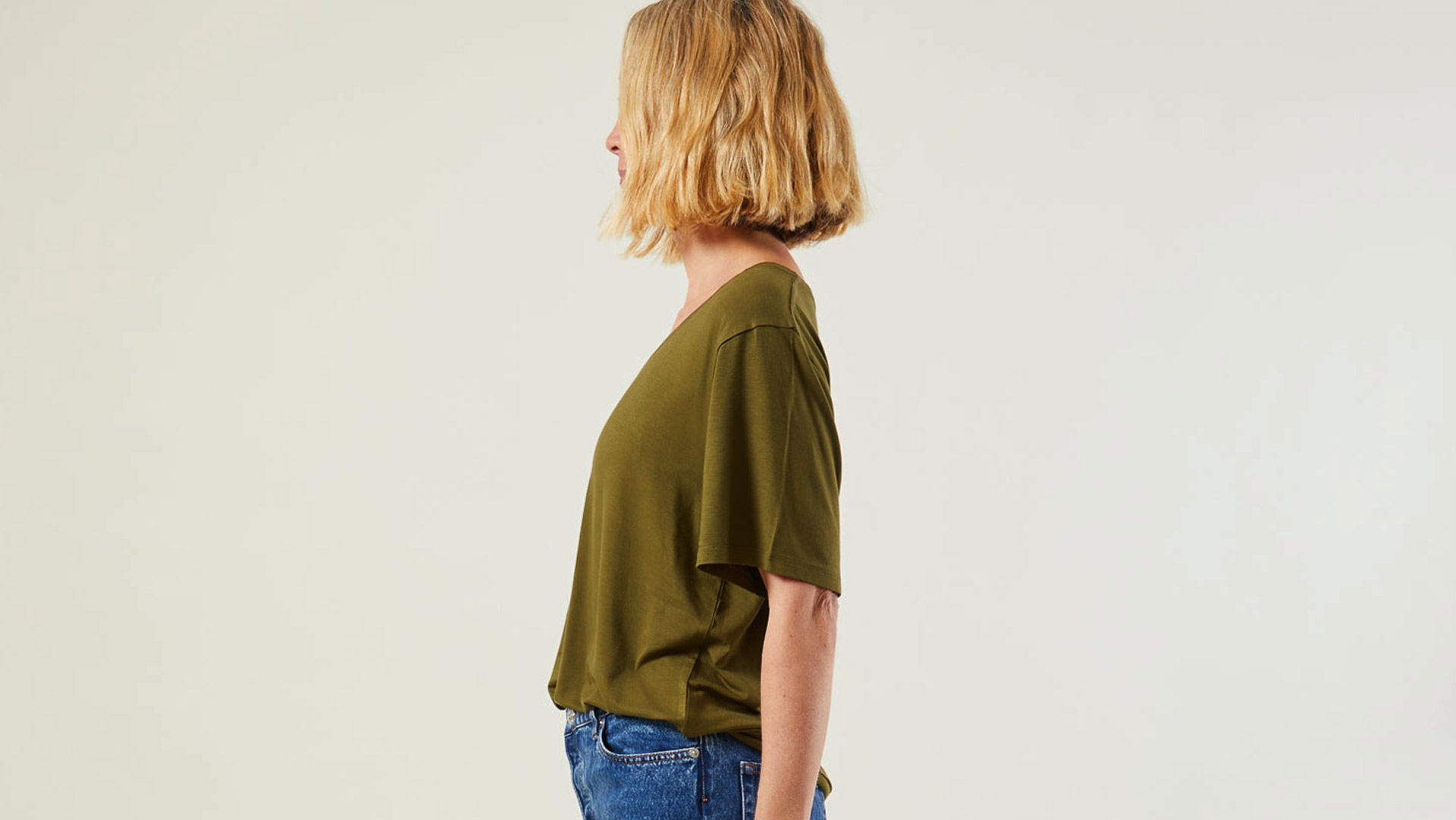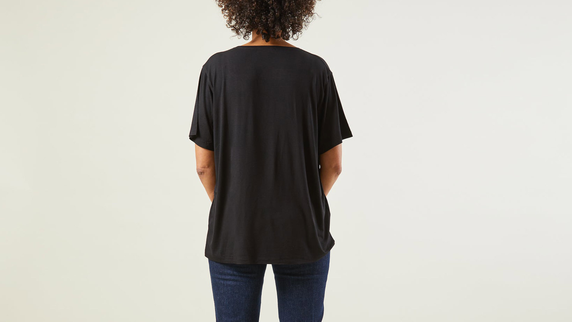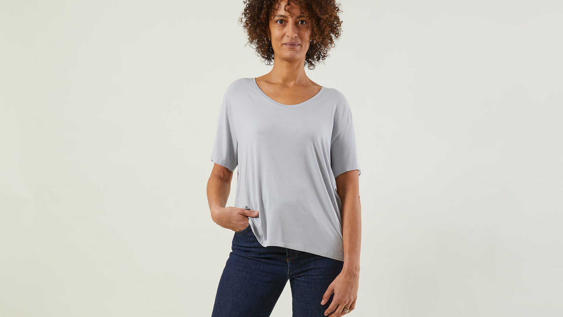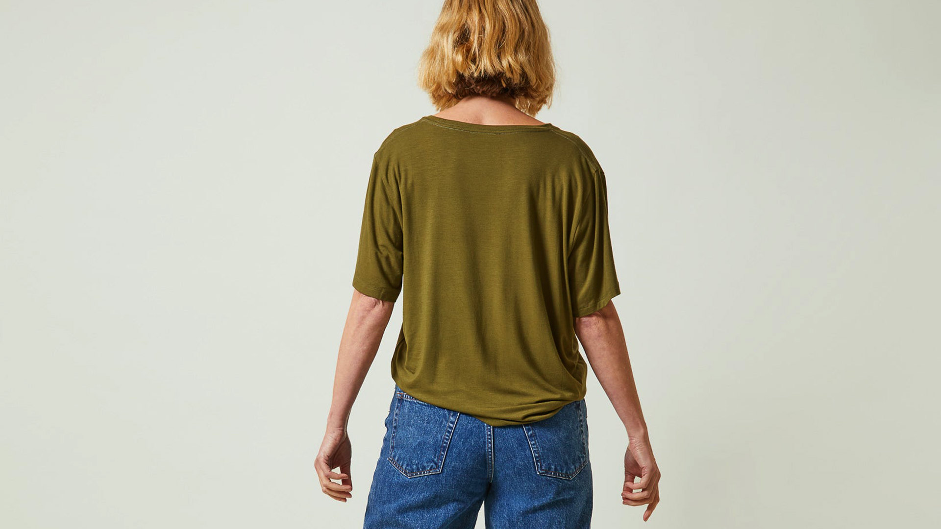 Part of our relaxed, luxury lounge-wear collection – a collection of relaxed fit, soft and drapey T-shirts. Comfy enough to wear in bed, stylish enough for a night out. Available in black, khaki or light silver grey.