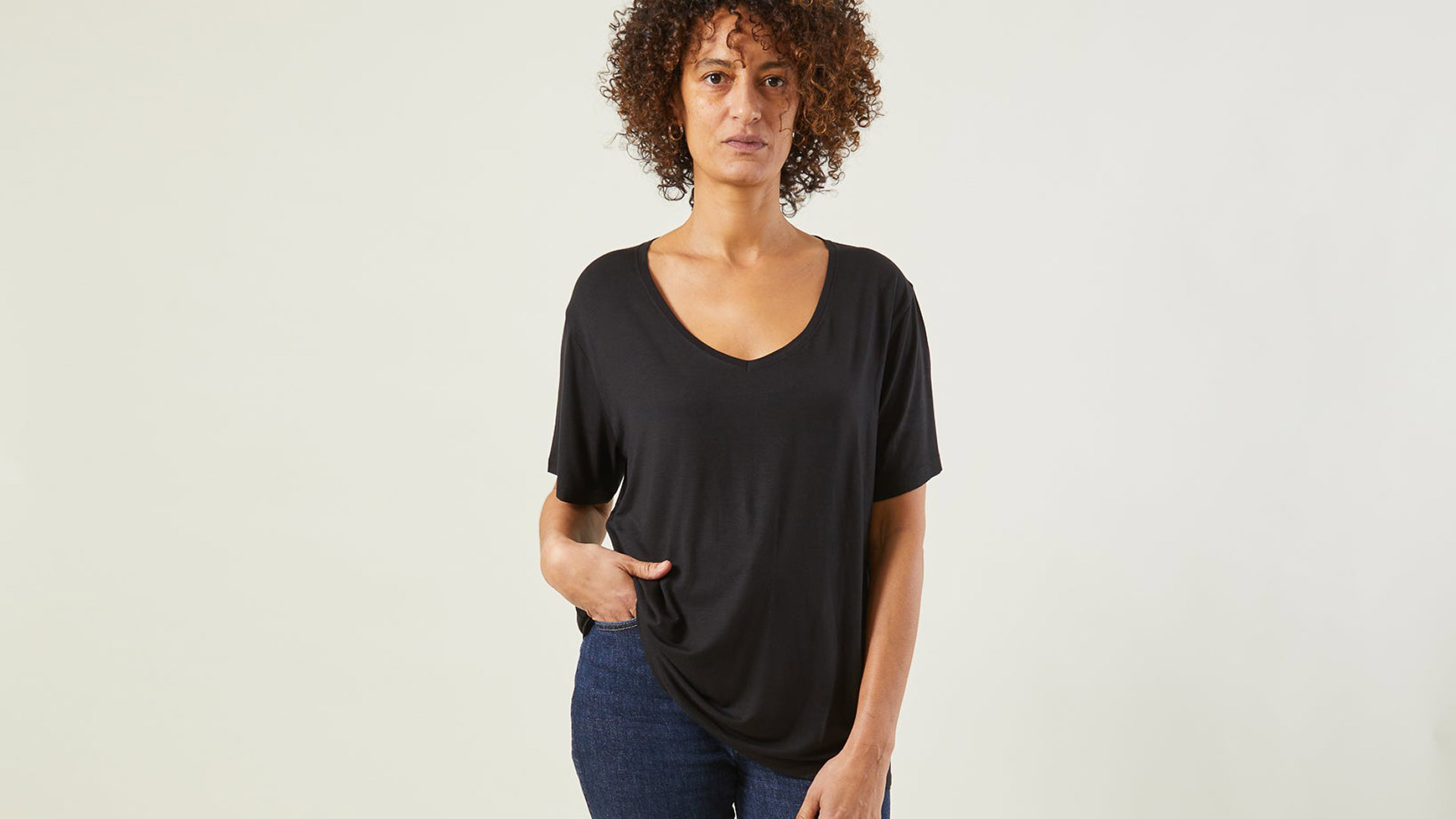 Crafted from a lightweight fabric, these soft drape T-shirts add effortless elegance and comfort to any outfit. The relaxed, classic fit of this viscose, V-neck top is not only stylish but also incredibly comfortable. The sleeves end just above the elbow.