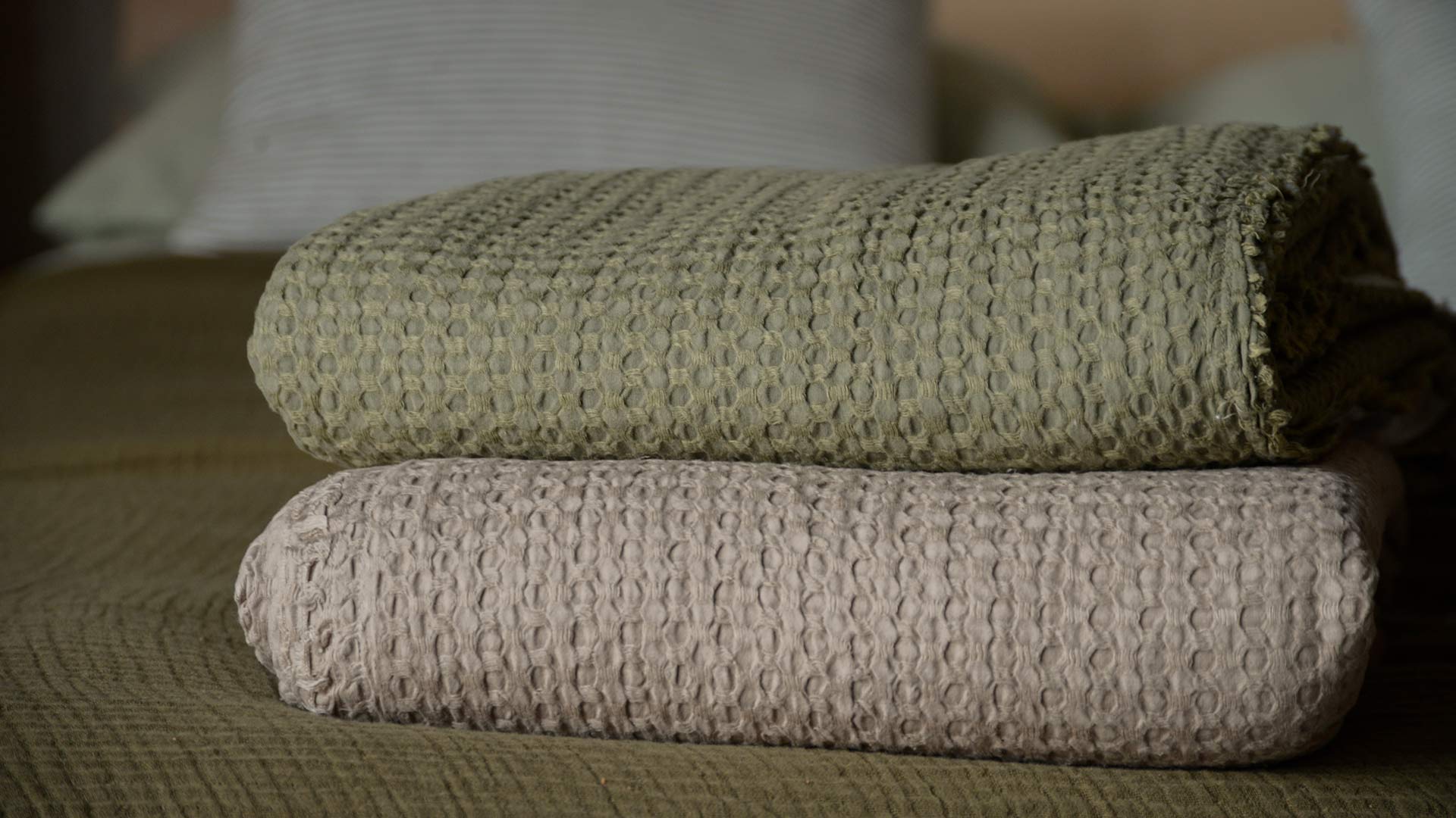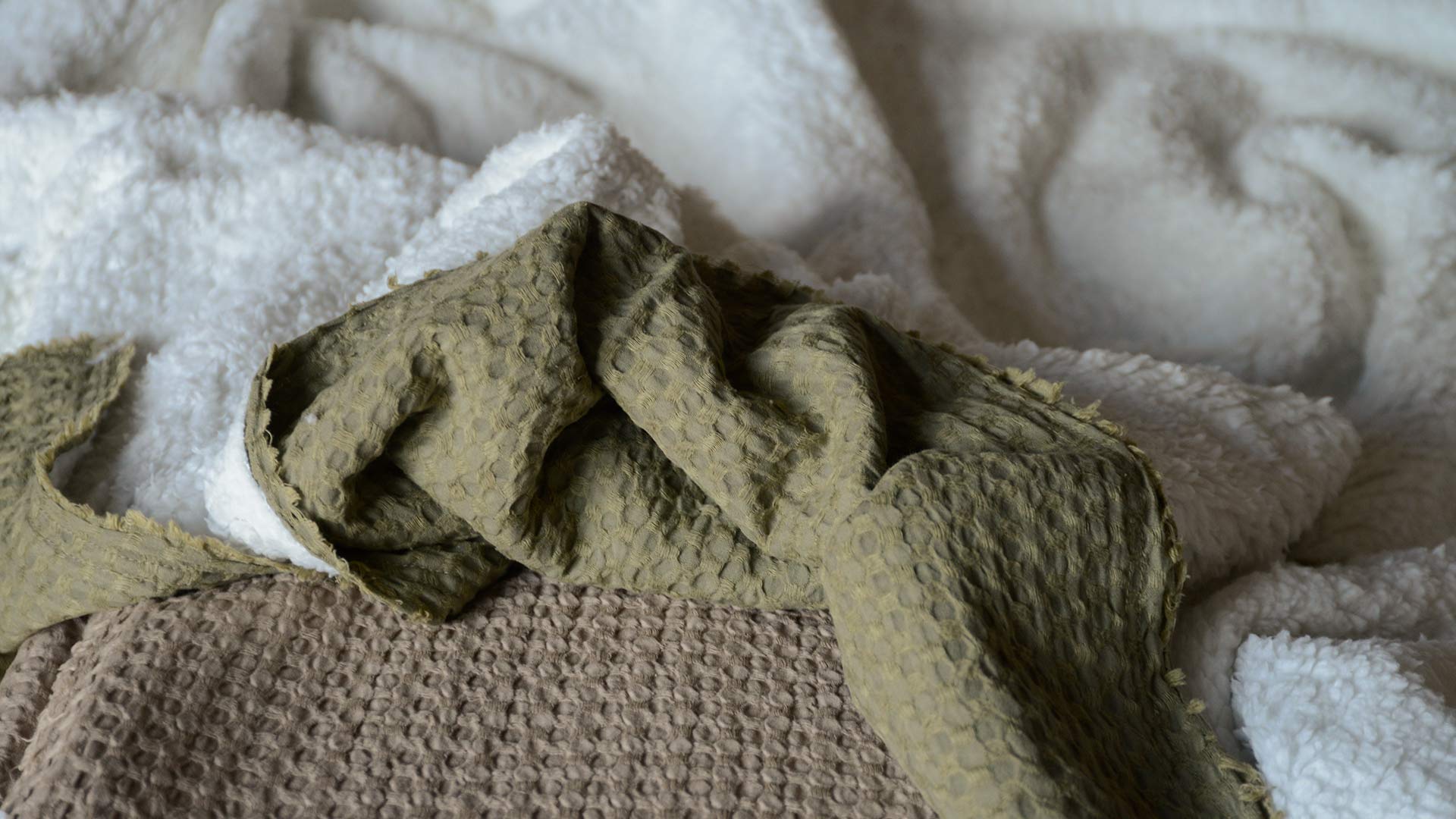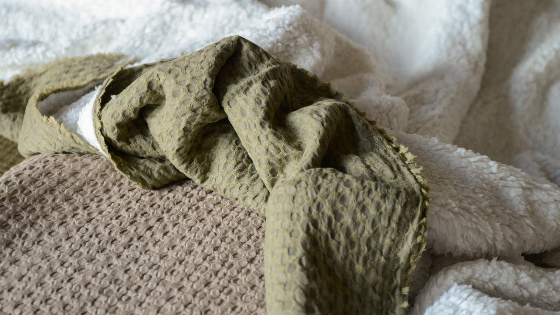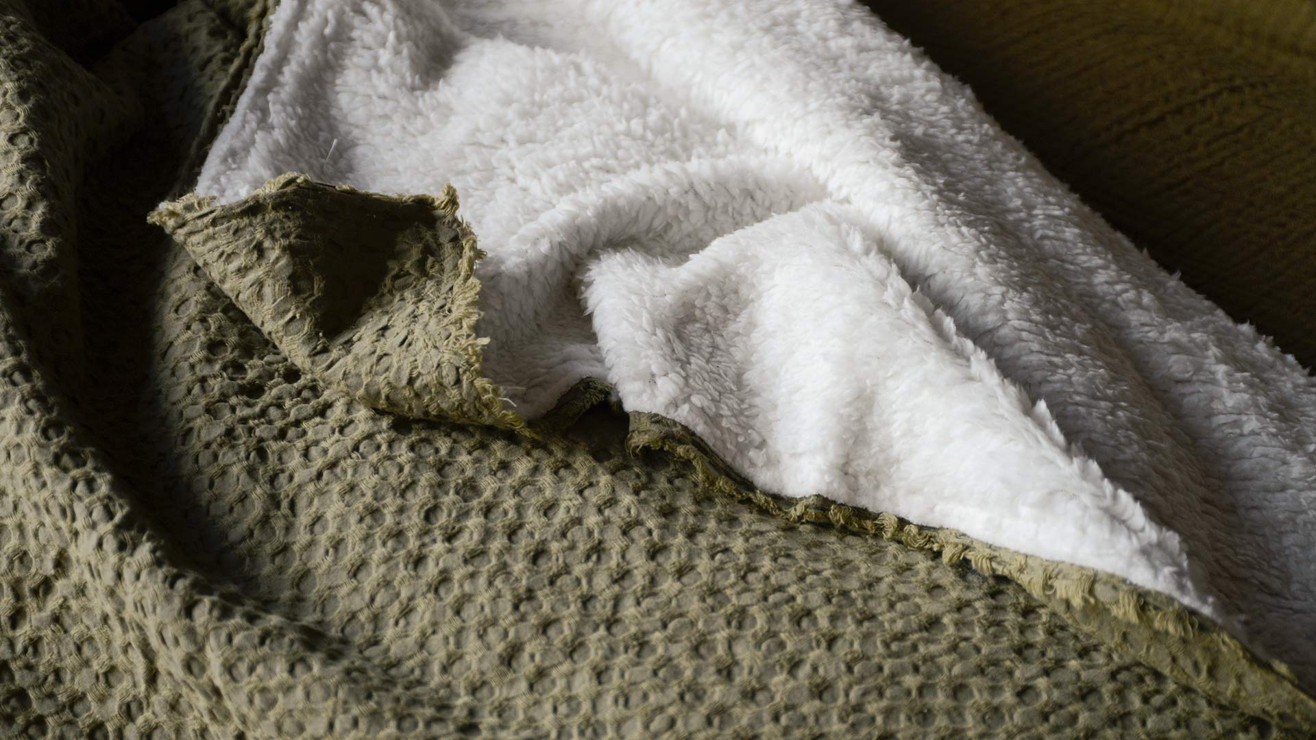 These soft, fleece lined waffle throws are cosy and classic, yet effortlessly contemporary. A lightweight double-layer cotton front, finished with a waffle texture and short fringe to the edges. Choose from either muted moss green or cool taupe. Complete with a contrasting ultra-soft, luxurious Sherpa reverse; these fleece lined waffle throws are both stylish and timeless.