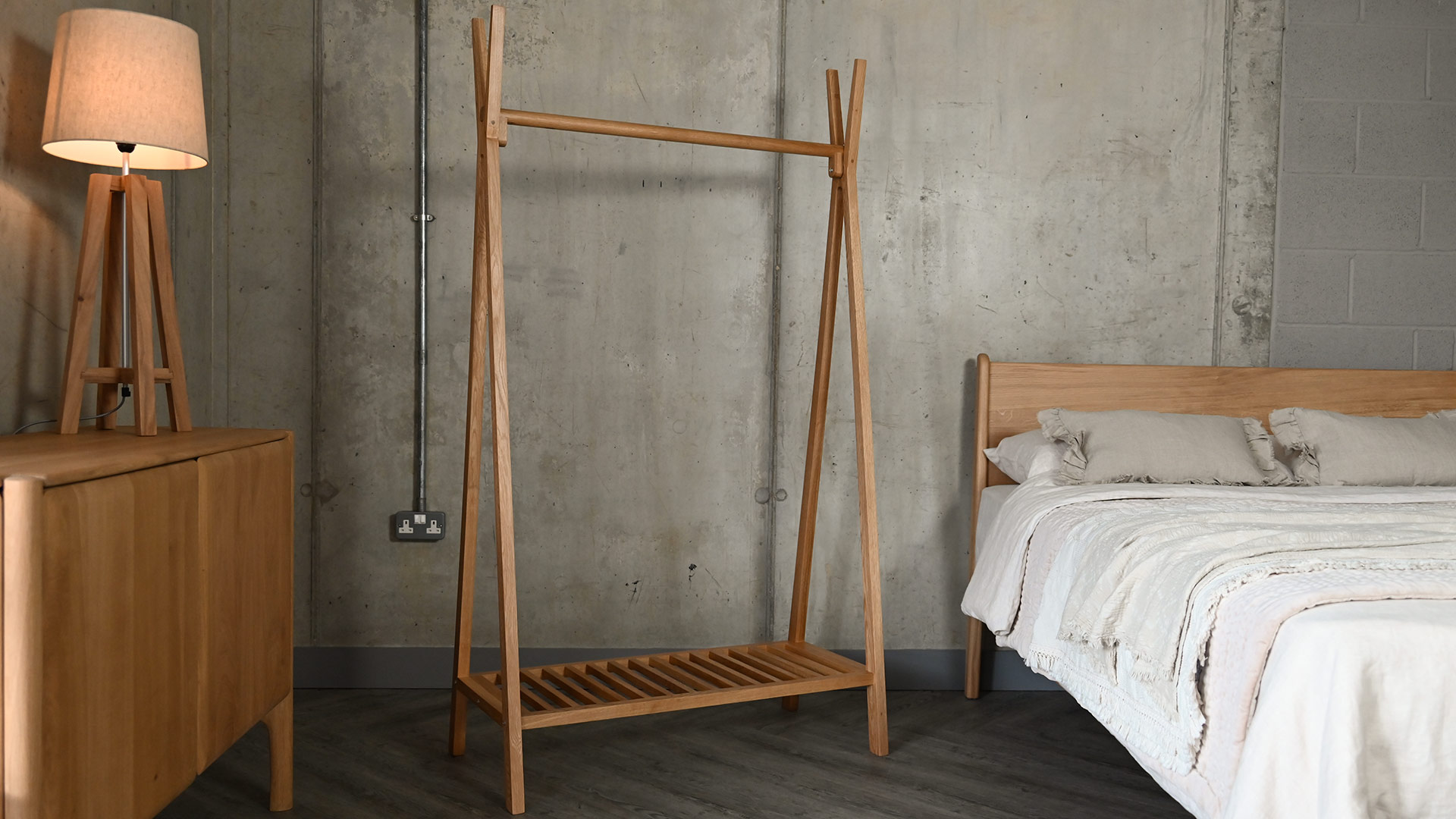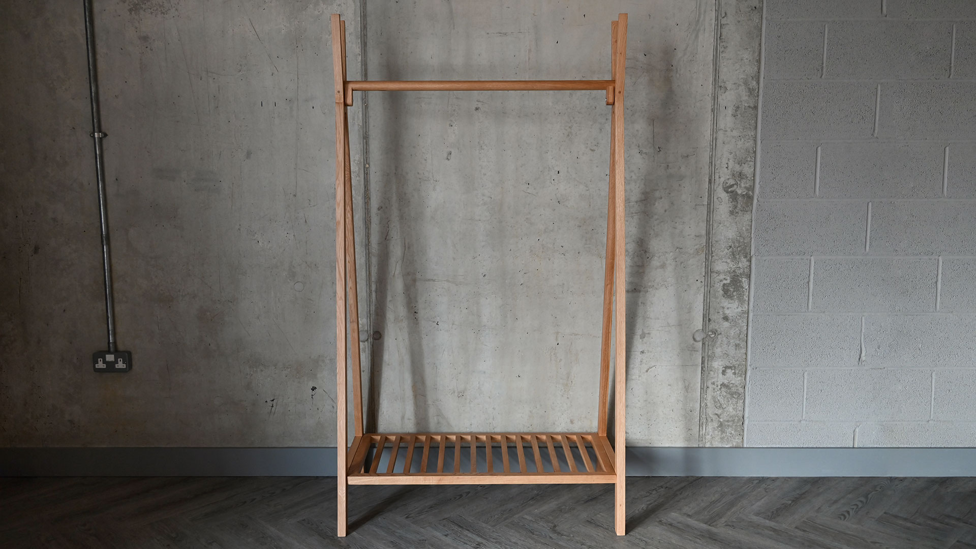 A unique solid oak clothes rail. With a striking profile, this clothes rail is a simple solution to your bedroom storage needs. Perfect for any modern or traditional setting, this free standing clothes rail is easy to style to your own taste. This elegant piece is also the perfect alternative to the more traditional wardrobe. Its stylish, sleek design lends itself well to use in different areas around the home.