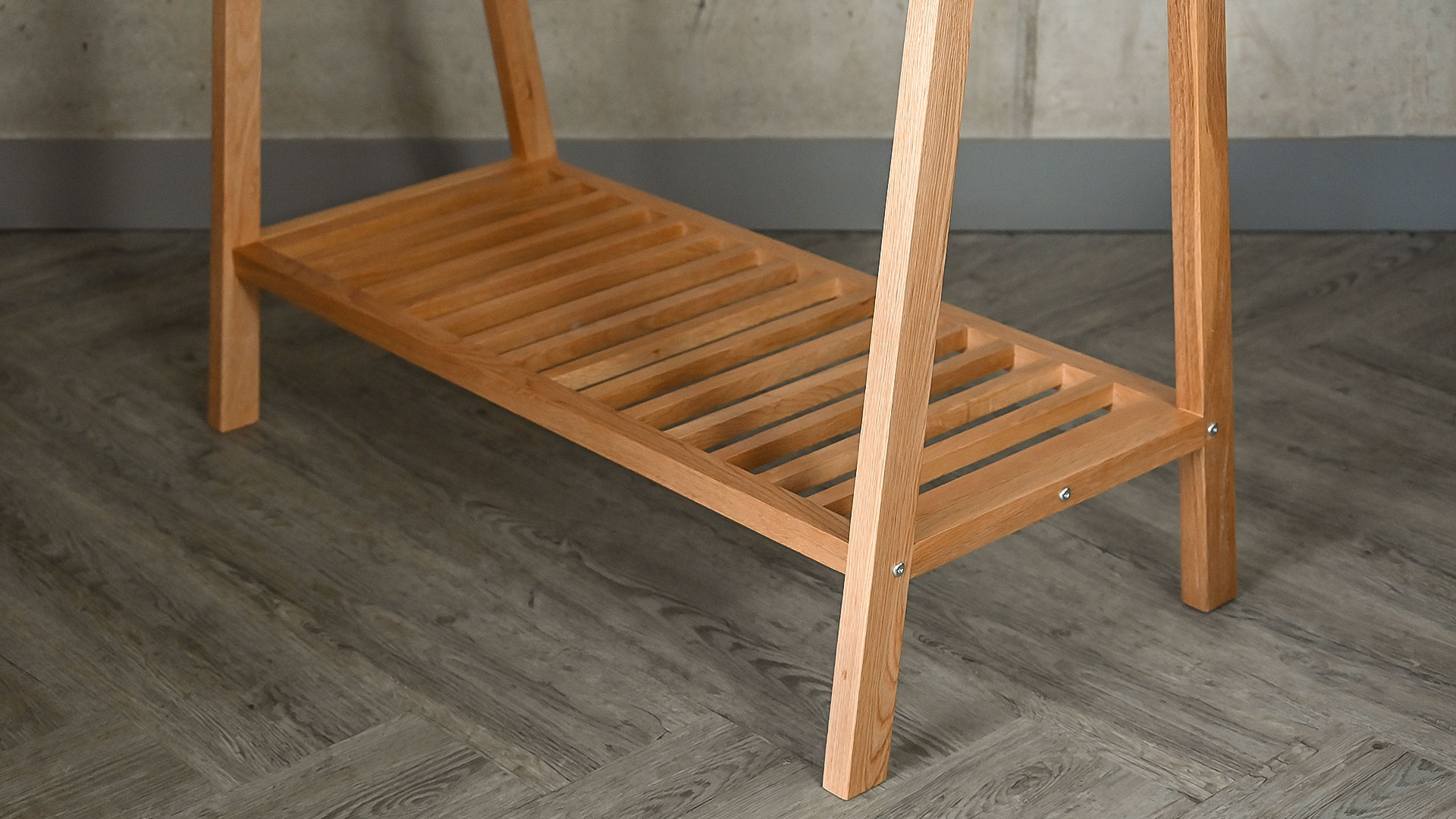 This is a stylish, solid oiled oak clothes rail – providing useful extra storage for the bedroom, hallway or bathroom. A contemporary freestanding rail that will suit a variety of interior design schemes, while allowing easy storage of clothes and shoes, via an upper hanging rail and a lower slatted shelf.
