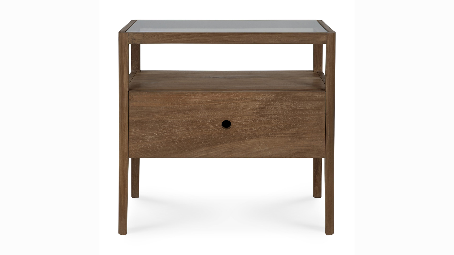 The Spindle bedside table is a classic. Pictured here in teak, its rounded edges to add a soft, sensual quality to this beautiful bedroom piece. Made from solid, reclaimed teak timber, this elegant side table has a single lower drawer and upper glass shelf; perfect next to your sofa or bed. We think it complements our Camden bed beautifully, especially in the walnut timber!