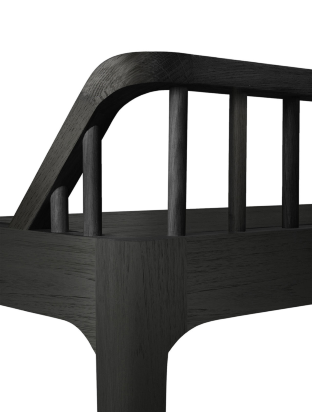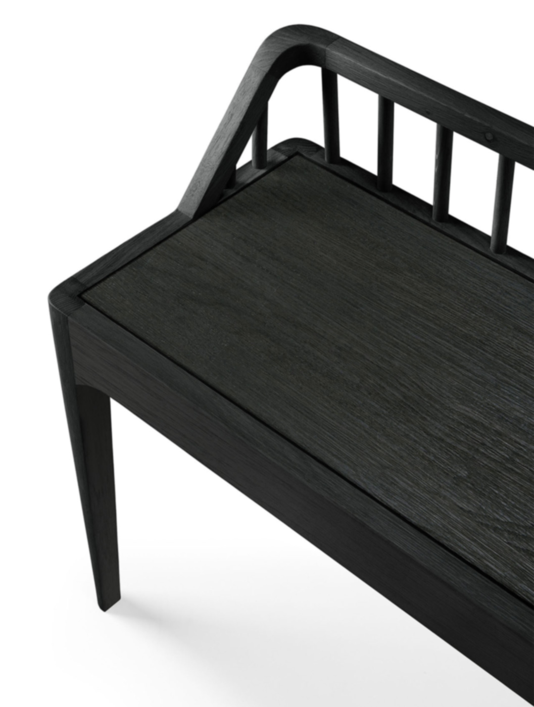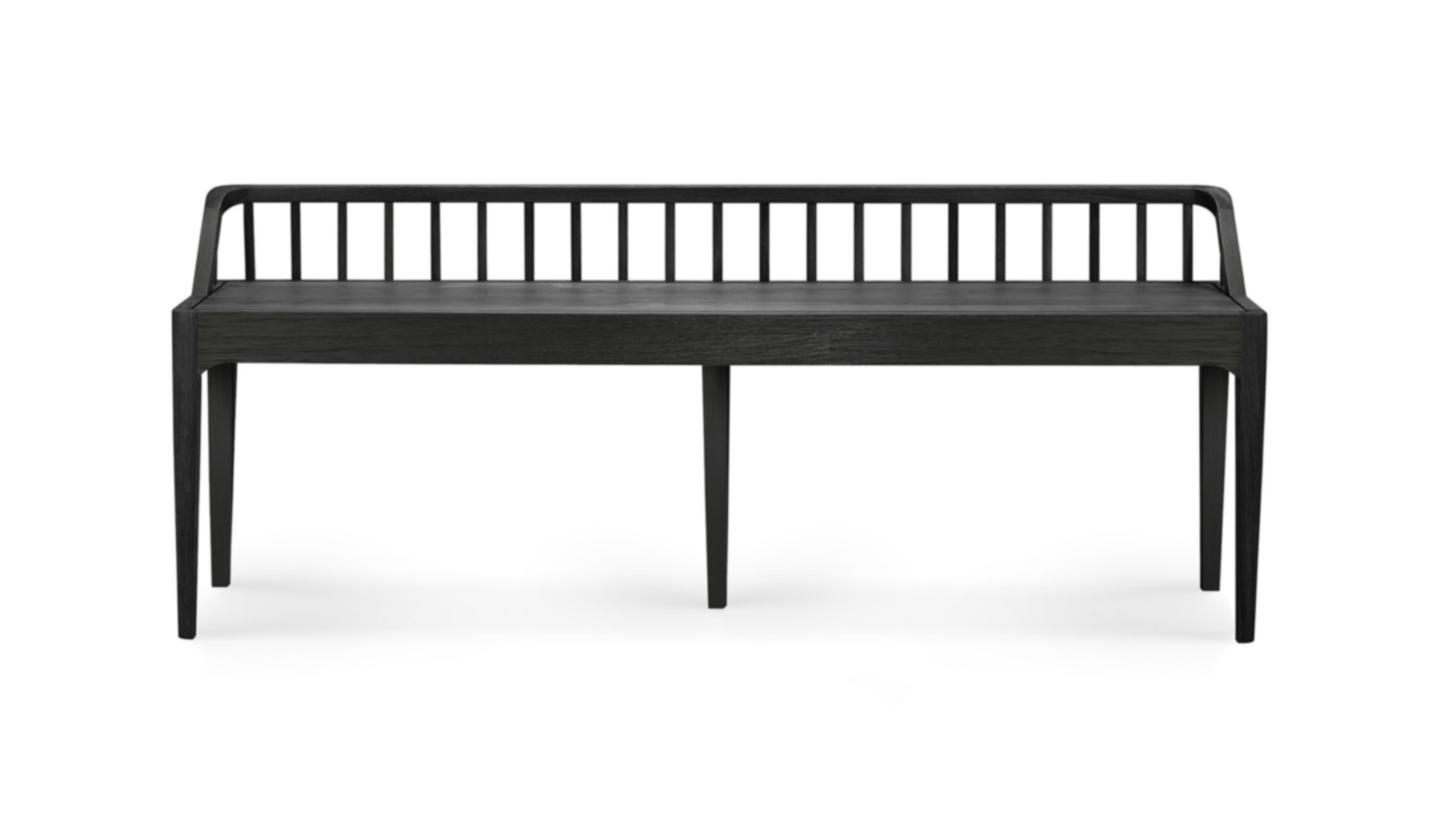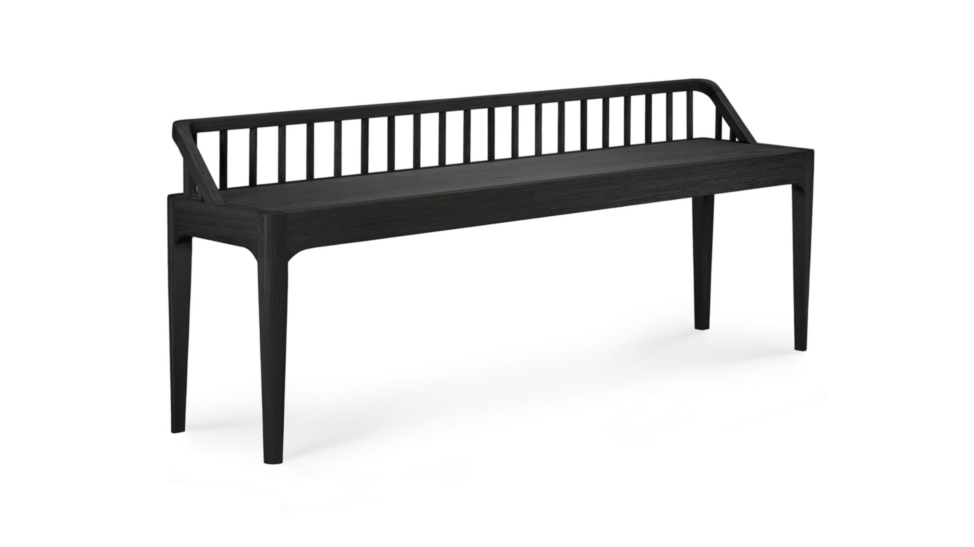 A stylish bench from Ethnicraft. Featuring a low back-rest and elegant, tapered legs, inspired by the traditional spinning wheel. Available here in solid, black stained oak. Also available in a natural oak finish.