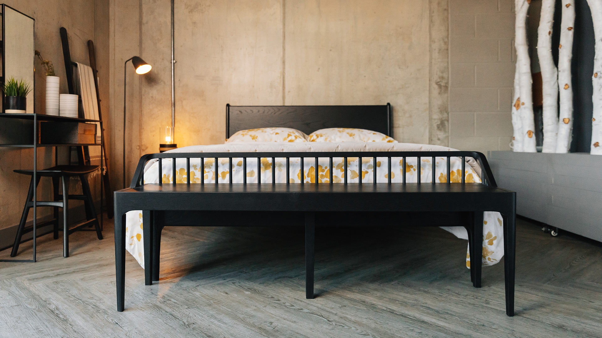 Ethnicraft’s Spindle collection found its inspiration in the traditional spinning wheel. Born of this idea, the black Spindle bench incorporates perfectly aligned spokes into the backseat, complimented by soft, rounded edges. Made in solid, black lacquered oak, this beautiful bench is perfect for the hallway or at the end of your bed. Designed by Nathan Yong.