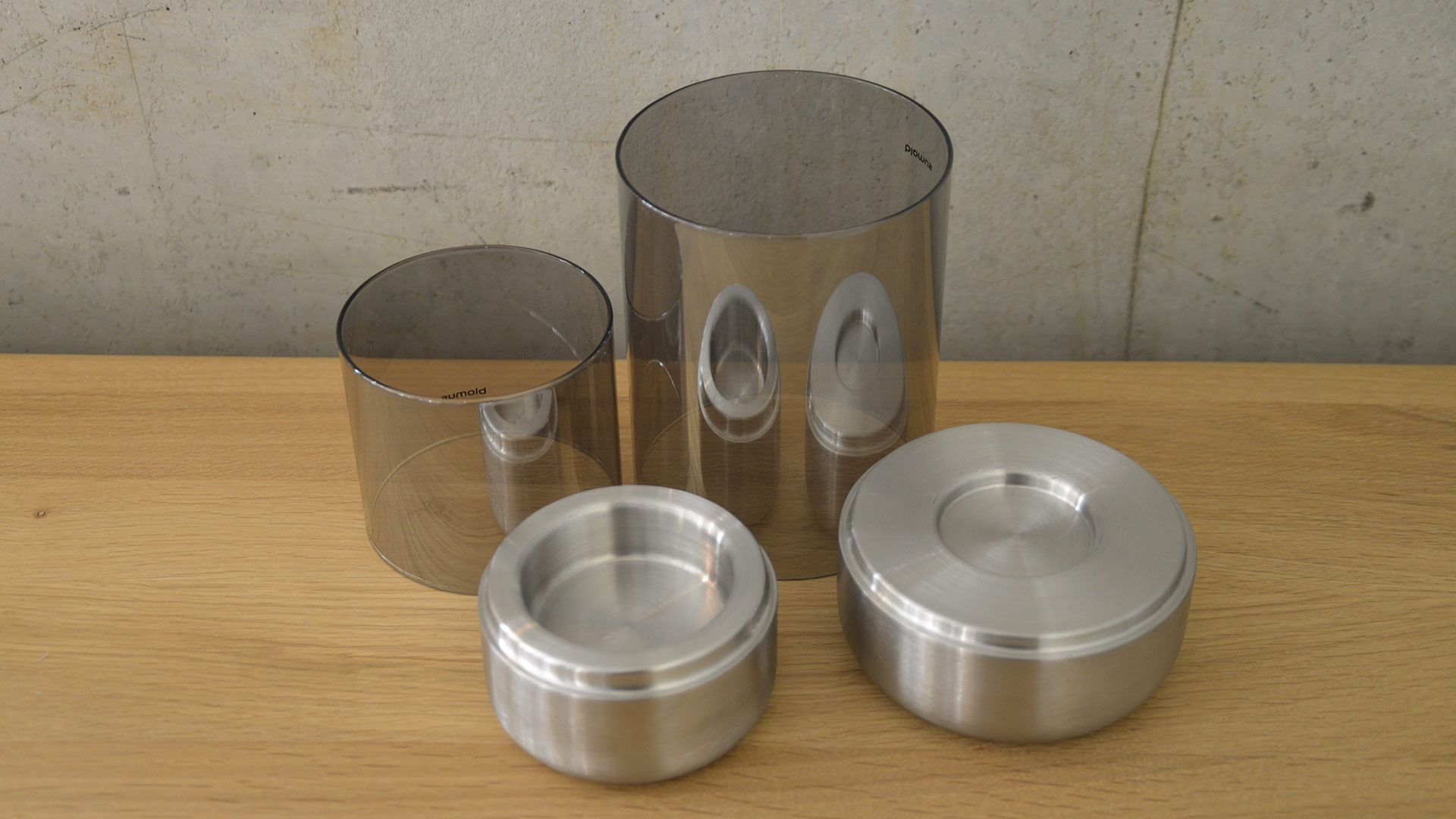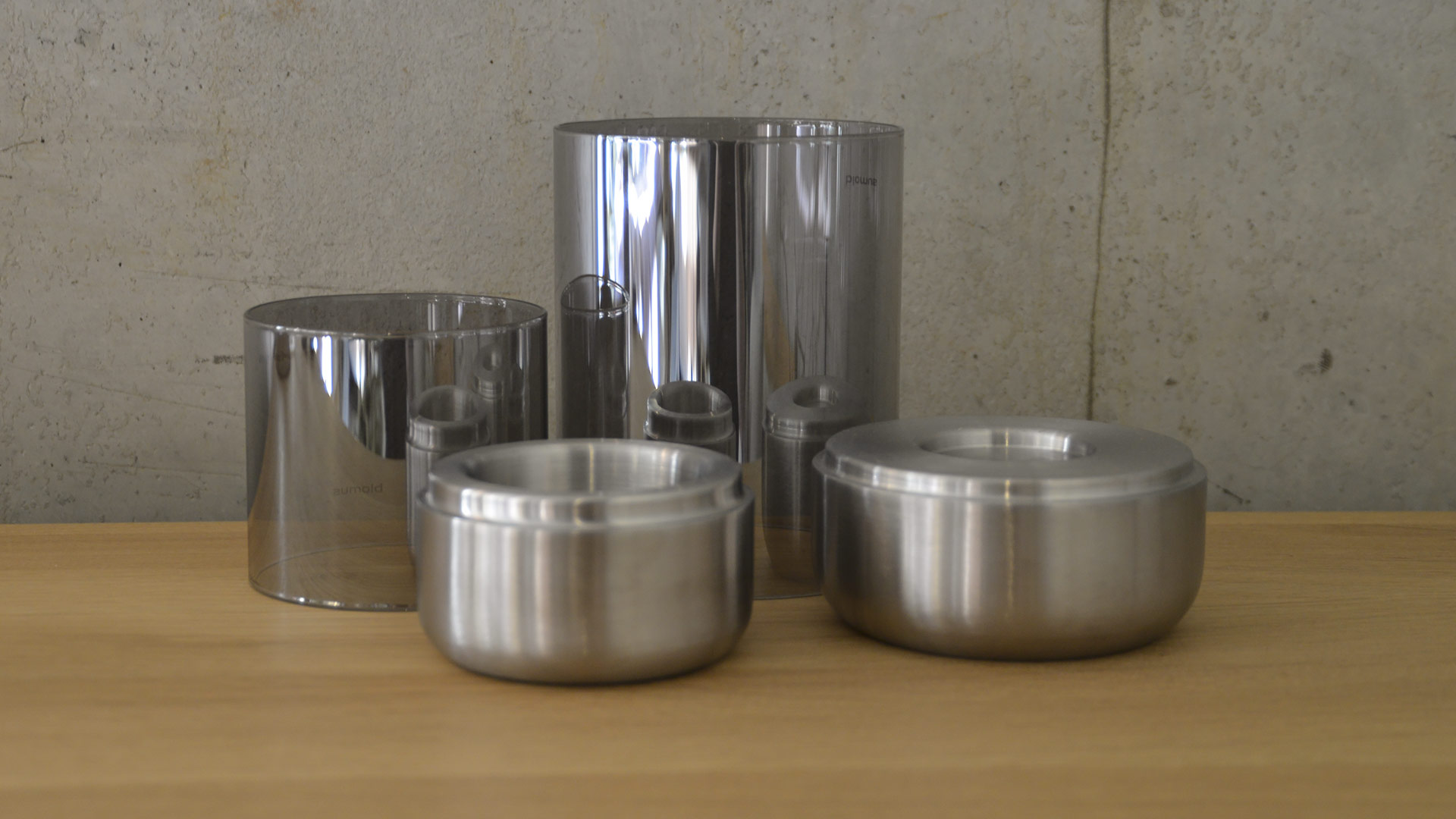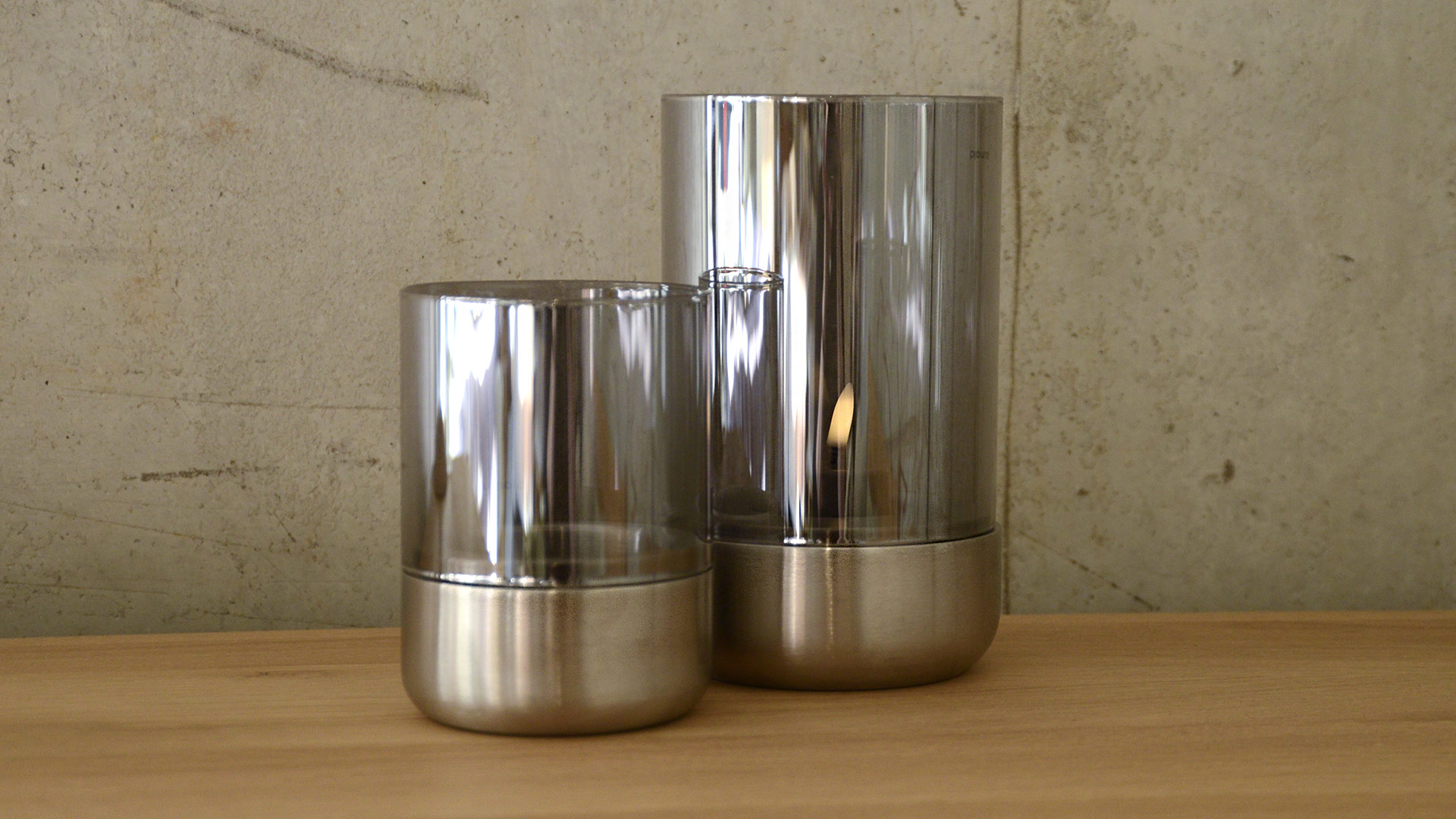 Gorgeous stainless steel & glass candleholders, finished with a shiny, chromatic look. The glass has a reflective finish with a silvery hue.